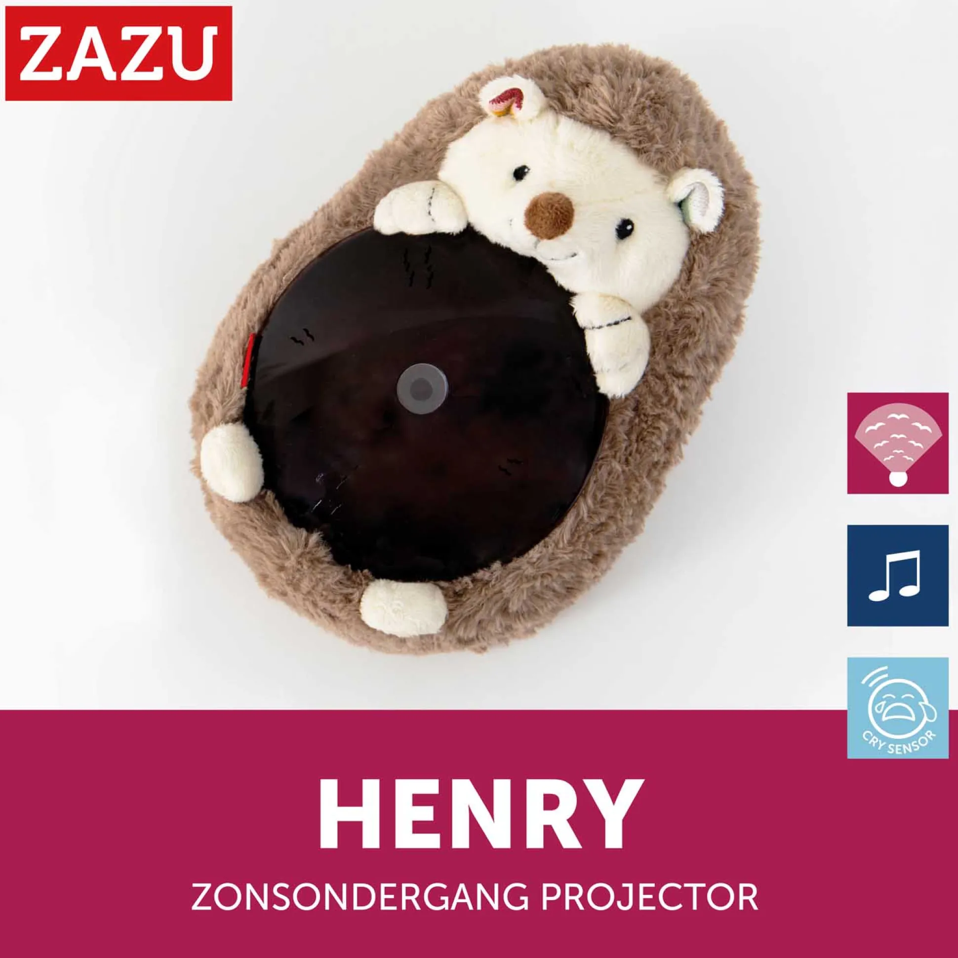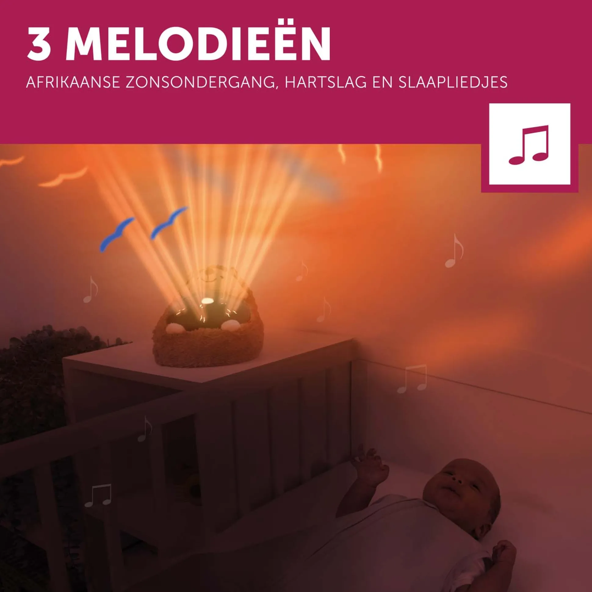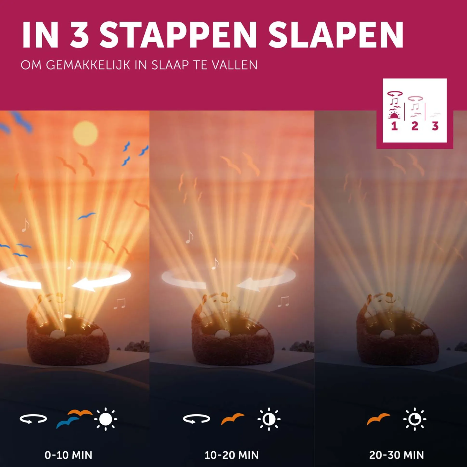 Henry de egel van het merk Zazu is een projector die de slaapkamer van je kindje veranderd in een prachtige zonsondergang. Henry projecteert vogels en bewegende lucht op het plafon en speelt ontspannende melodieën. De Afrikaanse natuurgeluiden, de hartslag van een moeder en diverse slaapliedjes helpen je kindje om rustig in slaap te vallen. De projector bevat een uniek 3-stappen slaapprogramma, waarbij de geluiden en helderheid van de projectie geleidelijk afneemt. Na 30 minuten schakelt de projector automatisch uit. Door de huilsensor gaat de projector automatisch weer aan wanneer je kindje huilt of onrustig is. Werkt op 3x AA batterijen.