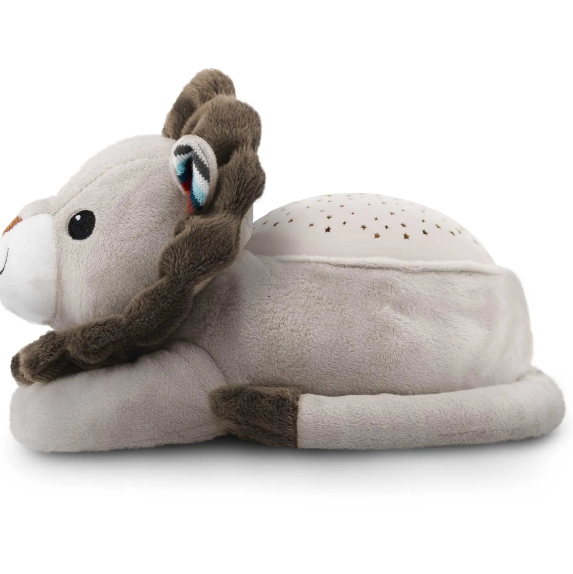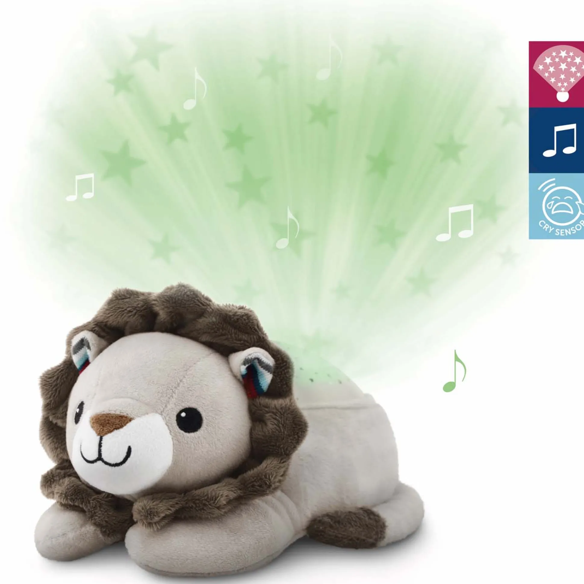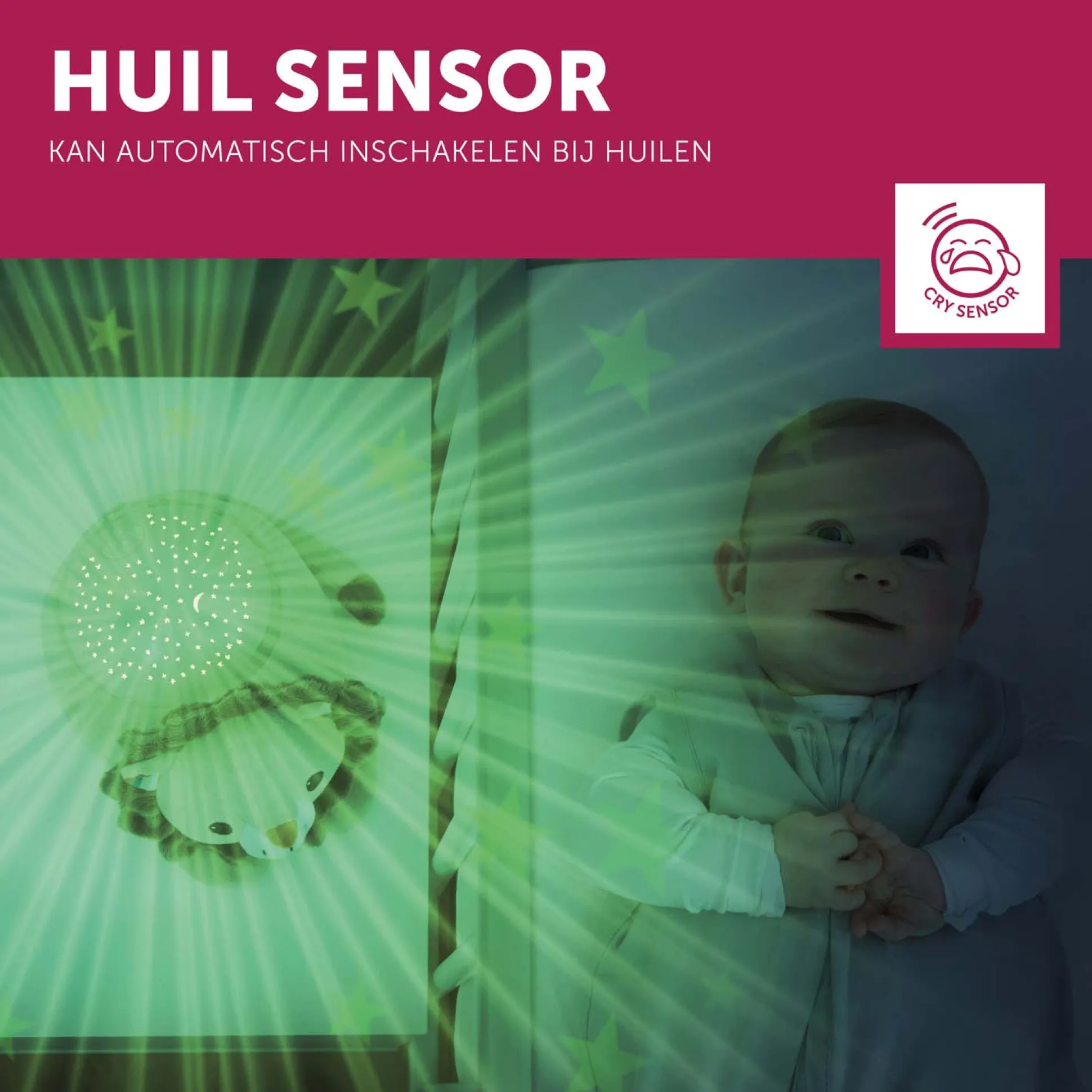 Leo de leeuw van het merk Zazu is een sterrenprojector met rustgevende melodieën. Leo projecteert magische sterren op het plafond in vier verschillende kleuren: oranje, blauw, groen of veelkleurig. Daarnaast speelt het rustgevende melodieën zoals: loungemuzie of de hartslag van een moeder. Hierdoor kan je kindje rustig in slaap vallen. Na 15 min stopt de muziek automatisch en na 30 minuten gaat ook het licht uit. Door de huilsensor gaat de projector automatisch weer aan wanneer je kindje huilt of onrustig is. Werkt op 3x AA batterijen.