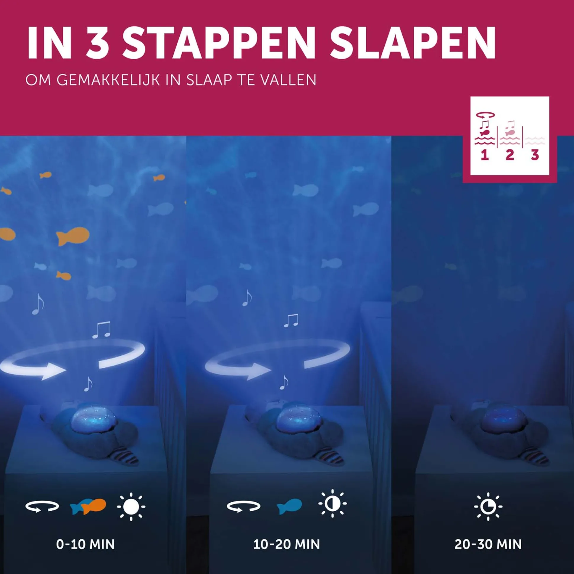 Deze Zazu lichtprojector in de vorm van een otter helpt je kindje om rustig in slaap te vallen. De lichtprojector projecteerd een onderwaterwereld met golven en visjes. Daarnaast kan de projector verschillende geluiden afspelen, namelijk hartslaggeluiden, oceaangeluiden en rustige liedjes. De projectie schakelt automatisch uit na 30 minuten. Ook heeft de lichtprojector een huilsensor en zal vanzelf weer aan gaan wanneer je kindje aan het huilen is. De volume is aan te passen op twee verschillende niveaus.