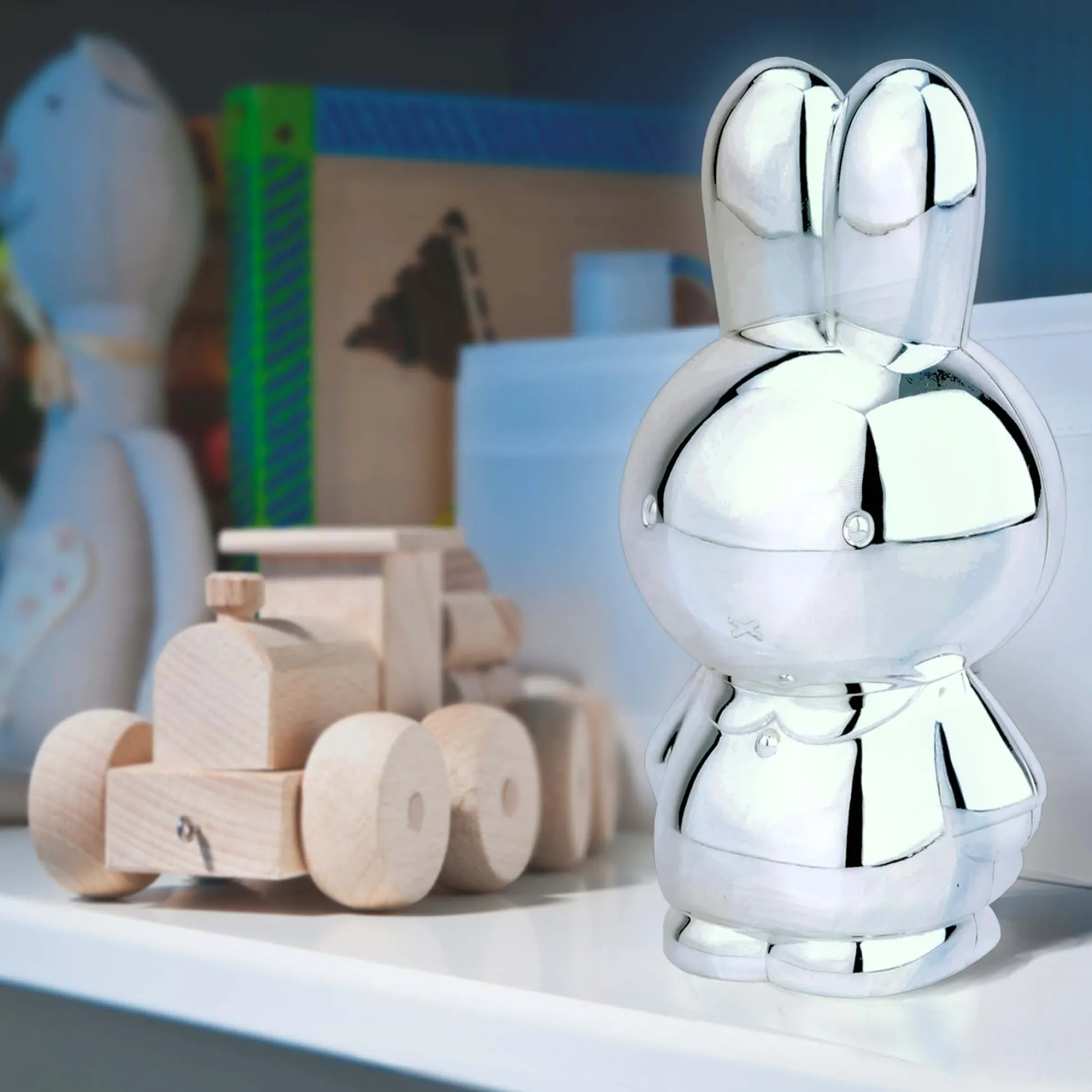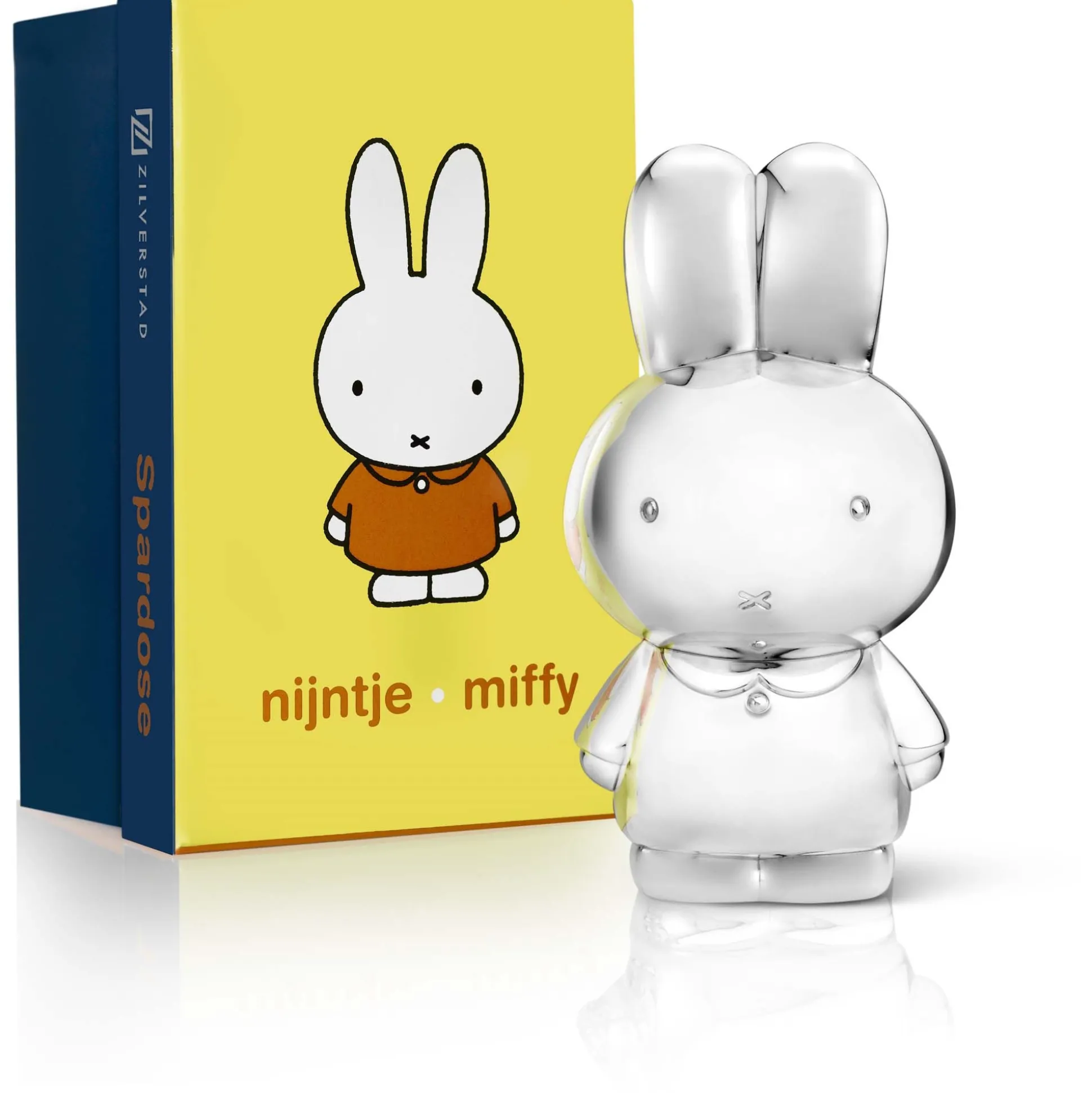 Mooie, glanzende spaarpot in de vorm van het beroemde konijn nijntje. De spaarpot kan gegraveerd worden bij een juwelier, wat het een persoonlijk geschenk maakt. Deze nijntje spaarpot is in zilver kleur, poetsen is overbodig. Afmetingen: 6,9 x 7,8 x 14,8 cm. In kleurrijke geschenkverpakking.