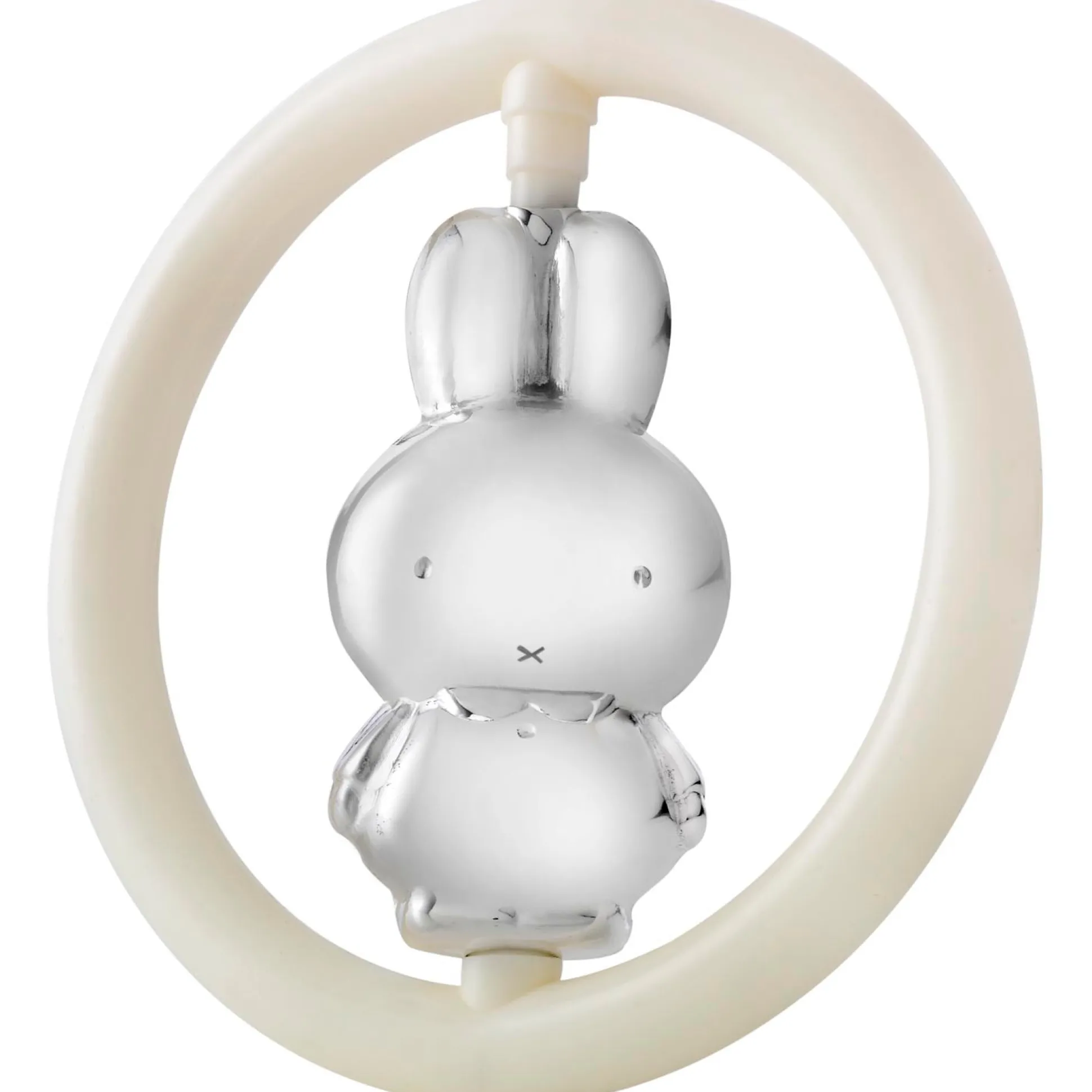 Basis 90 verzilverde rammelaar met nijntje in een ring. Kan gegraveerd worden, wat de rammelaar een bijzonder geboortegeschenk maakt.