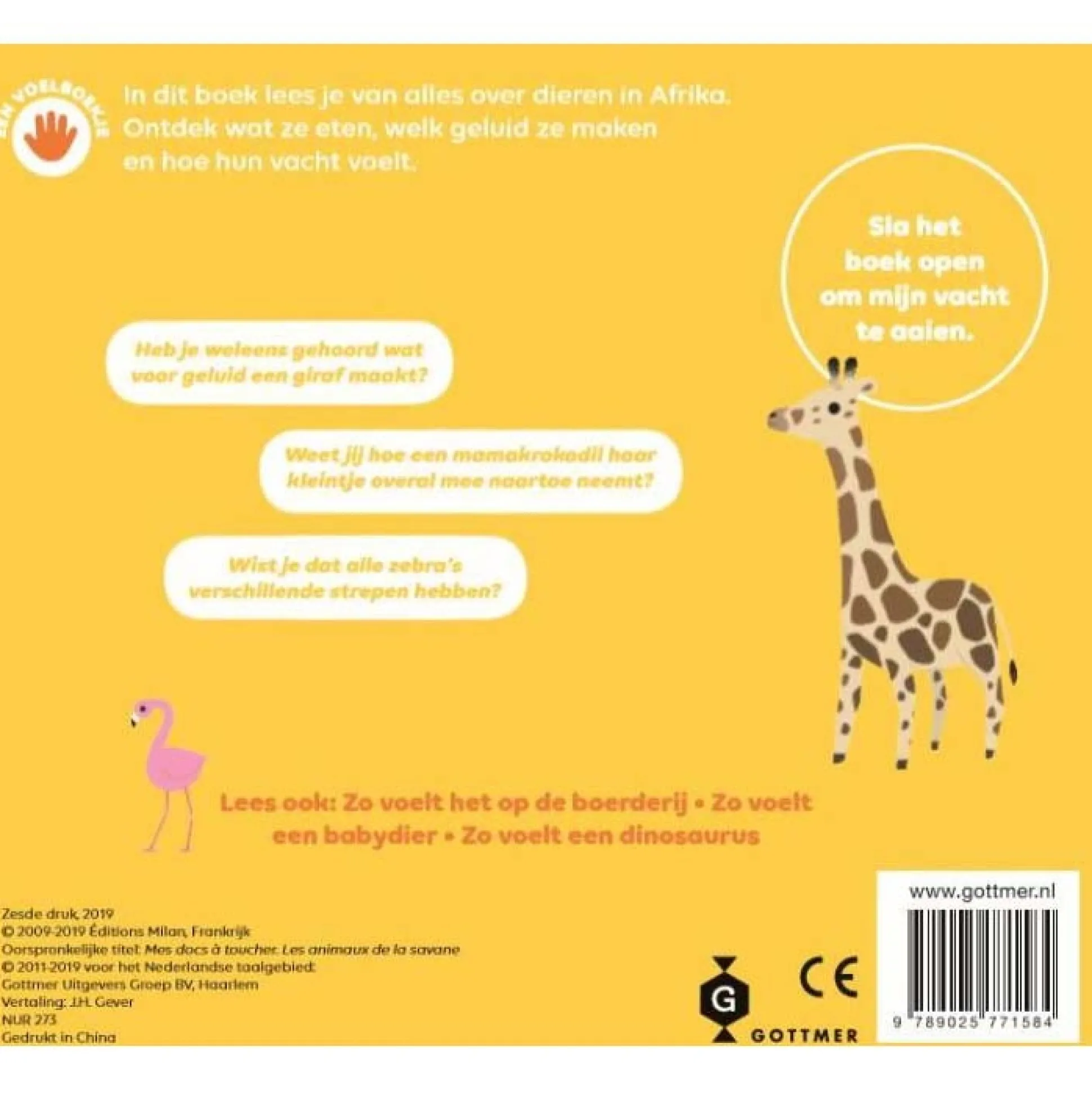 Zo voelt het in Afrika is een populair kartonboekje met flappen en voelplekjes. Het voelboekje is ontwikkeld voor de allerkleinsten en peuters kunnen met dit boekje alle dieren gaan ontdekken. Op elke pagina is wel iets te vinden achter de flappen of te voelen op de vele voelplekjes, zoals de manen van een leeuw. Daarnaast bevat het vrolijk geïllustreerde boekje behapbare stukjes informatie die begrijpelijk zijn voor kinderen vanaf ongeveer 2 jaar