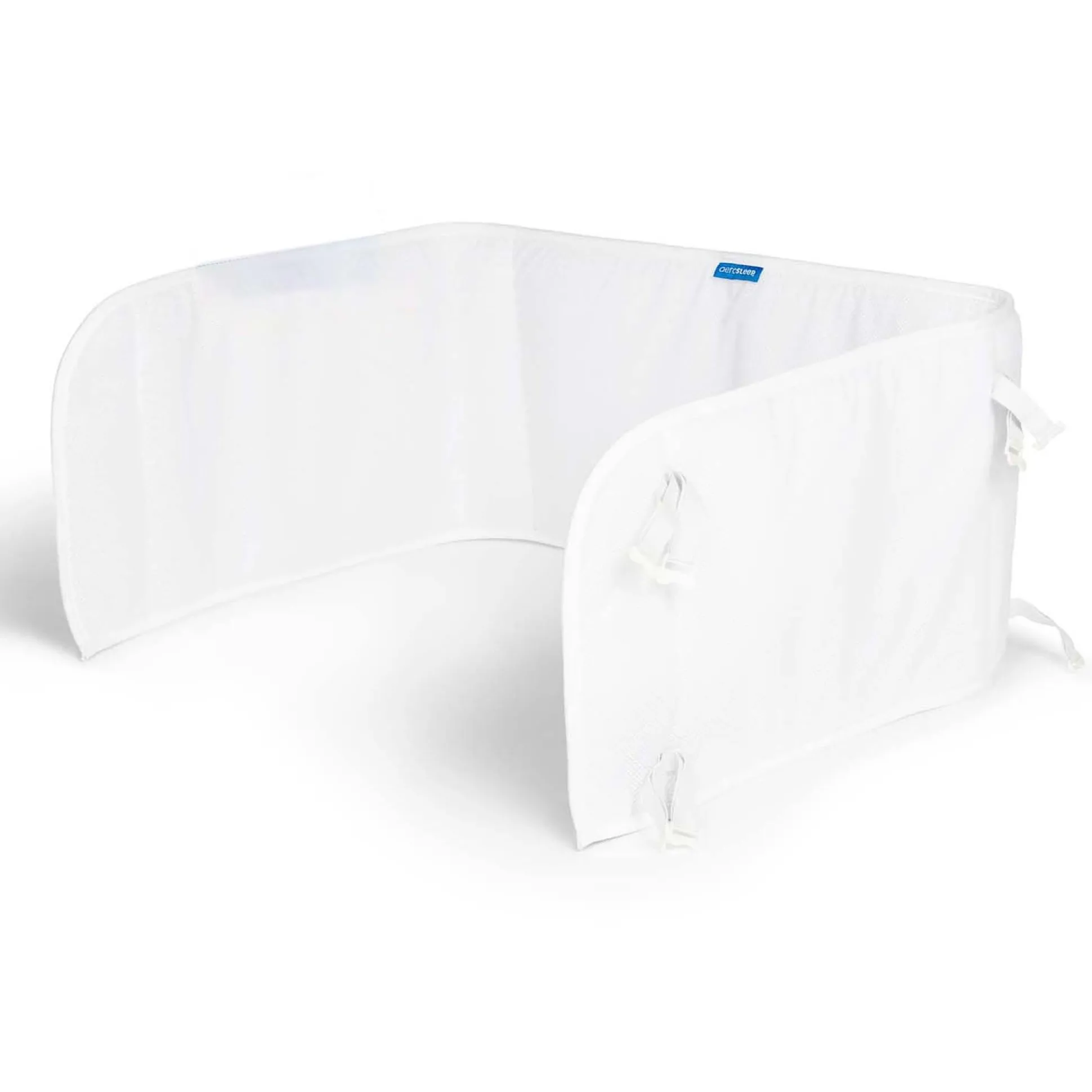 De bedomrander van Aerosleep voorkomt dat je kleintje zijn hoofdje stoot tegen de spijlen van zijn bedje. De unieke luchtdoorlatende structuur van de bedbumper zorgt ervoor dat je kleintje vrij kan ademen. Hierdoor in de bedomrander te gebruiken vanaf de geboorte. De bedomrander bestaat uit drie lagen: luchtlaag – voor de nodige ventilatie, laken – voor een zachte afwerking en een vulling zodat het hoofdje van je kindje wordt beschermd tegen de spijlen van het bedje of box. Kan gebruikt worden bij bedjes van 60x120cm en 70x140cm en in boxen. Wasbaar op 40 graden. Kleur: wit