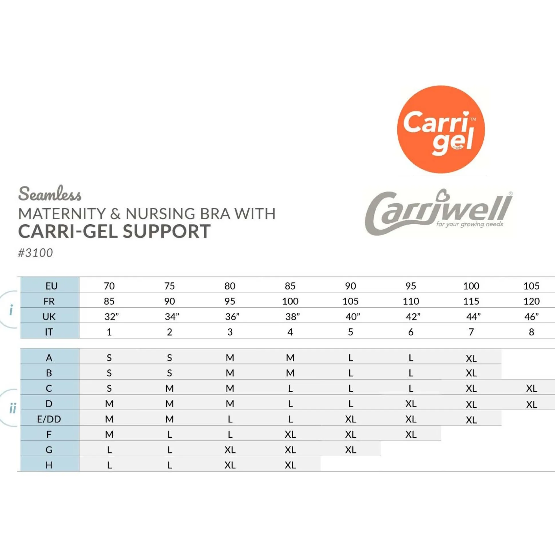 Carriwell meegroei- en voedingsbh Carri-gelbeugel kan je veilig dragen tijdens je zwangerschap en borstvoedingsperiode. De gelbeugel van siliconen is zacht, soepel en geeft dezelfde ondersteuning als de bekende beugel. De cups zijn eenvoudig met 1 hand te openen en kan tot 2 maten meegroeien. Door de meegeleverde extender kan je de omvang van de bh verlengen, zodat de bh de hele zwangerschap comfortabel blijft zitten en de bh ook na je zwangerschap nog goed aansluit. De niet-voorgevormde bh is verkrijgbaar in de maat S t/m XL. Twijfel je over de maat? Kies dan de grotere maat. Zoek je een maatje meer? Kijk dan bij de Carri-gelbeugel padded. Kleur: wit of zwart Materiaal: 91% polyamide, 9% elastan Wasvoorschrift: 40 graden.
