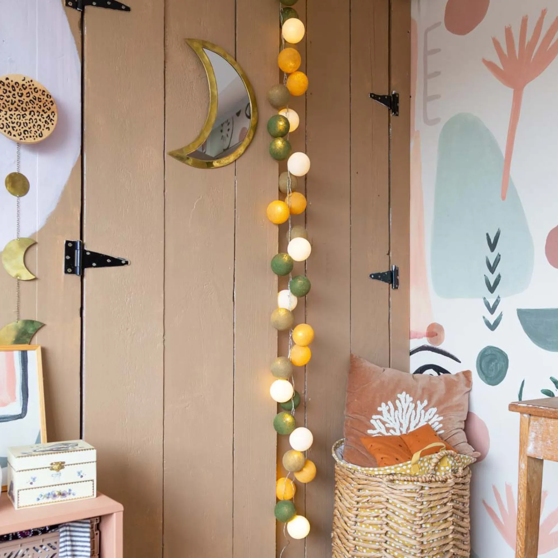 Deze leuke sfeervolle katoenen licht balletjes zijn een mooie toevoeging aan de kinderkamer. Handig tijdens een nacht voeding als nachtlampje maar vooral leuk als speelse decoratie op de kamer van je kindje. Met Cotton balls creëer je op een vrolijke manier meer sfeer. Deze starter set bestaat uit een kabel van 3 meter, waarvan 2.4 meter lampjes heeft. Het snoer kan in het stopcontact en bevat een knipschakelaar. Dit pakket heeft 20 katoenen lampjes die je zelf aan het snoer vast moet maken. Bij het product zit een gebruiksaanwijzing hoe je de bollen moet bevestigen. De kleuren van deze katoenen bolletjes bestaan uit verschillende tinten groen, geel en wit. Mocht je meer dan 20 lampjes willen kun je een extension kit aanschaffen die ook verkrijgbaar is bij Prénatal. Beschikbaar in diverse kleur.