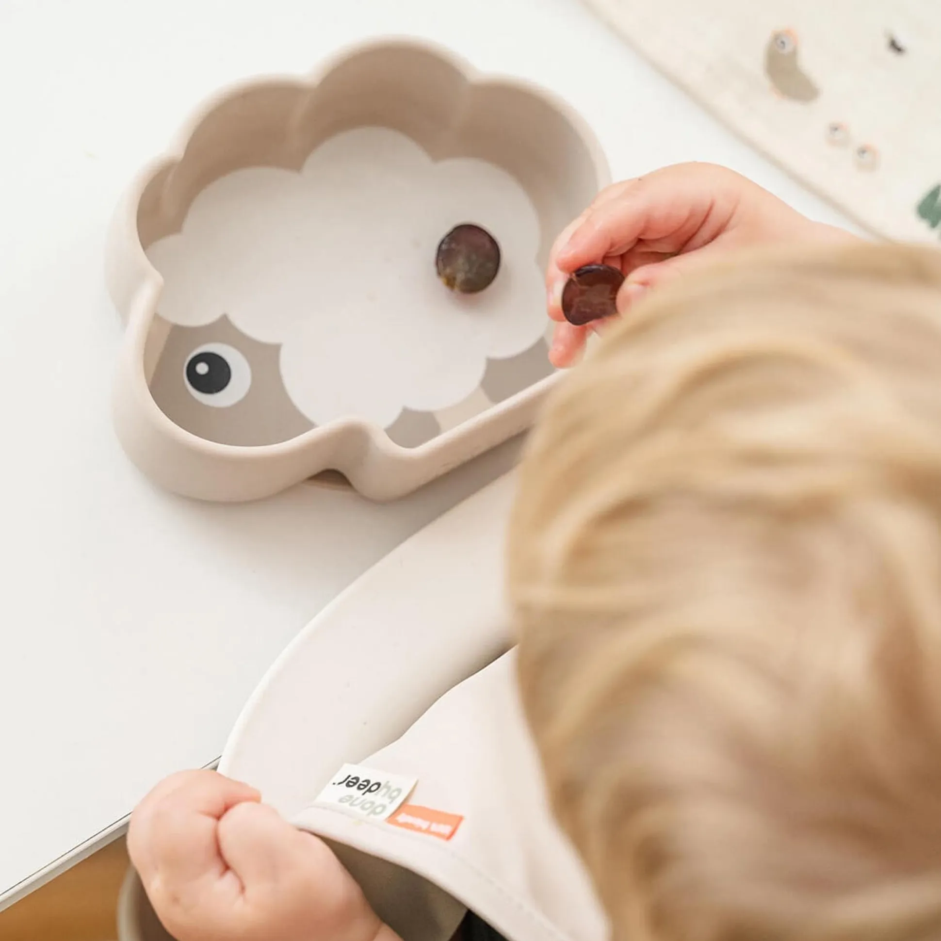 Dit vrolijke kommetje in de vorm van een schaap heeft een praktische zuignap waardoor het kommetje goed blijft staan. Het bordje is gemaakt van 100% BPA-vrij siliconen en heeft opstaande randen die het opscheppen van eten eenvoudiger maken. De zachte, flexibele structuur is veilig voor kleine handjes en het speelse design zorgt voor extra eetplezier. Vaatwasser- en magnetronbestendig. Afmeting: 21 x 7 x 3 cm.