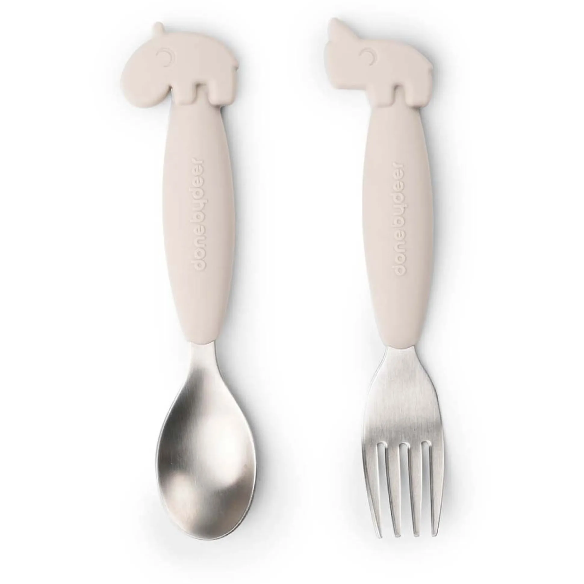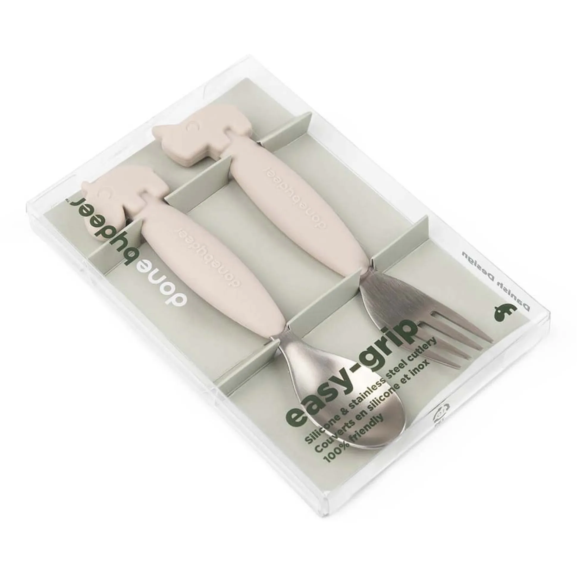 De Easy-grip bestekset van Done By Deer met lepel en vork zorgt voor een stevige grip en helpt je kindje zich te concentreren op het eten. Het perfecte bestek is essentieel om het zelfstandig leren eten leuk te maken. Het bestek heeft zachte siliconen antisliphandvatten en zal snel een favoriete set worden voor jou en je kleintje. Het formaat van de kinderbestekset is perfect voor een zelfstandige peuter die zelf leert eten. De sandkleur vork en lepel passen bij de hele Done by Deer serviescollectie.