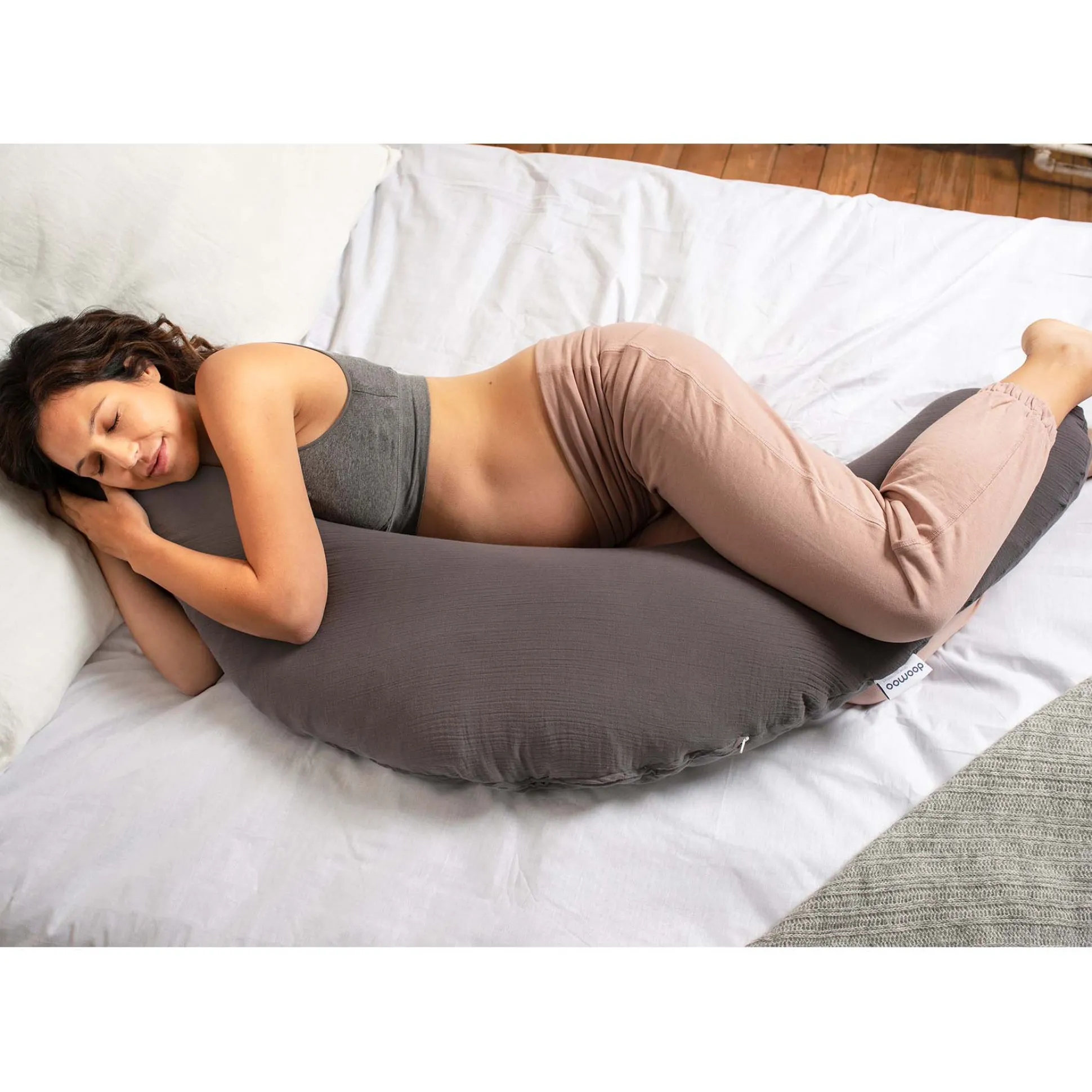 De Doomoo Basics Comfy Big pompom is een veelzijdige voedingskussen en verkrijgbaar met verschillende standaard hoezen die tevens ook los verkrijgbaar zijn. Het kussen biedt voor zowel de moeder als de baby veel comfort. Het kussen kan gebruikt worden tijdens de zwangerschap om een fijne houding aan te nemen tijdens het slapen. Door het kussen om het middel van de volwassene te plaatsen biedt het steun tijdens het voeden van je kleintje. Ook voor je kleintje biedt het voedingskussen steun, bijvoorbeeld wanneer je baby op zijn rug ligt. Het kussen heeft een afneembare hoes, welke in de wasmachine op 30 graden gewassen kan worden. Het is beter om de hoes niet in de droger te doen. Het voedingskussen is gevuld met microkorreltjes (uit polystyreen) waardoor het kussen soepel en makkelijk buigzaam is. Afmeting: 190 cm van punt tot punt, in U-vorm: 155 cm x 20 cm.
