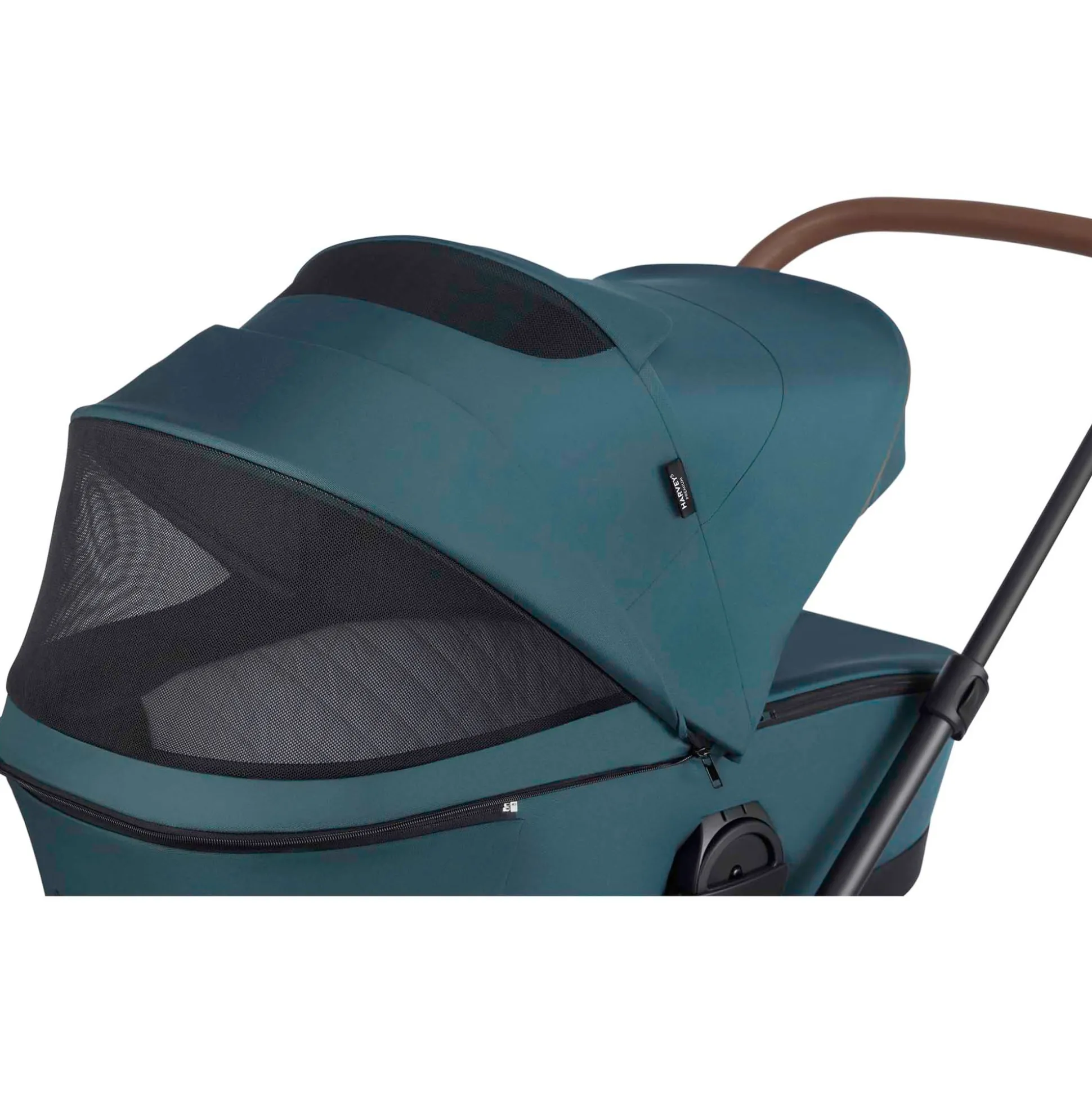 Alles draait om een comfortabele reis voor jou en je kindje. Met de grote, wendbare wielen rij je net zo makkelijk op de stoepen van de stad als op de dennennaalden in het bos. Het chique zitje zet je met één hand in drie verschillende standen en de gordel beschikt over magnetische sluitingen. En wat voor weer het ook is, je kindje ligt heerlijk in de schaduw of hoog en droog onder de extra grote zonnescherm met kiekeboe-raampje en stijlvolle, kunstlederen details. De kap is waterafstotend en geeft UPF 50 bescherming tegen de zon. Harvey is je beste vriend vanaf dag 1, dankzij de prachtige reiswieg. Die voelt als een zachte veilige, stille cocon en is door het biologische katoen lief voor de huid van je kindje. Een perfecte slaapplek voor onderweg, niet in de laatste plaats door het anti-refluxsysteem dat het hoofdje van je kindje iets optilt. De grote kap en het afritsbare dekje, zorgen ervoor dat je kindje altijd goed beschermd is. Schaf de reiswieg apart aan naast het frame en zitje
