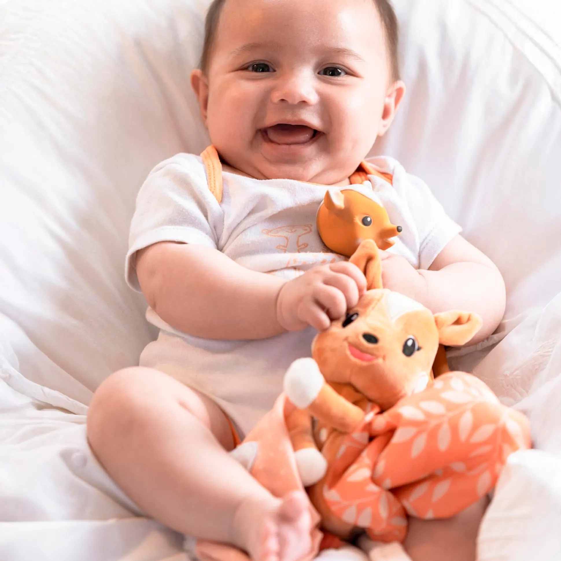 Deze giftset van Hertje FanFan is een ideaal (kraam)cadeau. In deze set zit bijtspeeltje FanFan en een knuffeldoekje. FanFan is gemaakt van 100% natuurlijk rubber. Het materiaal is flexibel en prettig om op te bijten, wat fijn is bij doorkomende tandjes. Het Knuffeldoekje is ideaal om jouw kindje de hele dag te vergezellen. De levendige, contrasterende kleuren en verschillende stoffen stimuleren de zintuigen. Dankzij het lichte ontwerp is het gemakkelijk vast te houden. Dit knuffeltje is perfecte voor knuffelmomenten en bedtijd. Met een klittenbandlus om eenvoudig aan de fopspeen van je kindje te worden bevestigd. Geschikt vanaf 0 maanden. Afmeting: 24x6x27.5cm. Schoonmaak advies: FanFan kan worden schoongemaakt met een licht vochtig doekje. Wij adviseren FanFan niet onder de kraan te houden of in bad te doen, het piepje van FanFan kan hierdoor beschadigen. Het knuffeldoekje kan op 30 graden gewassen worden