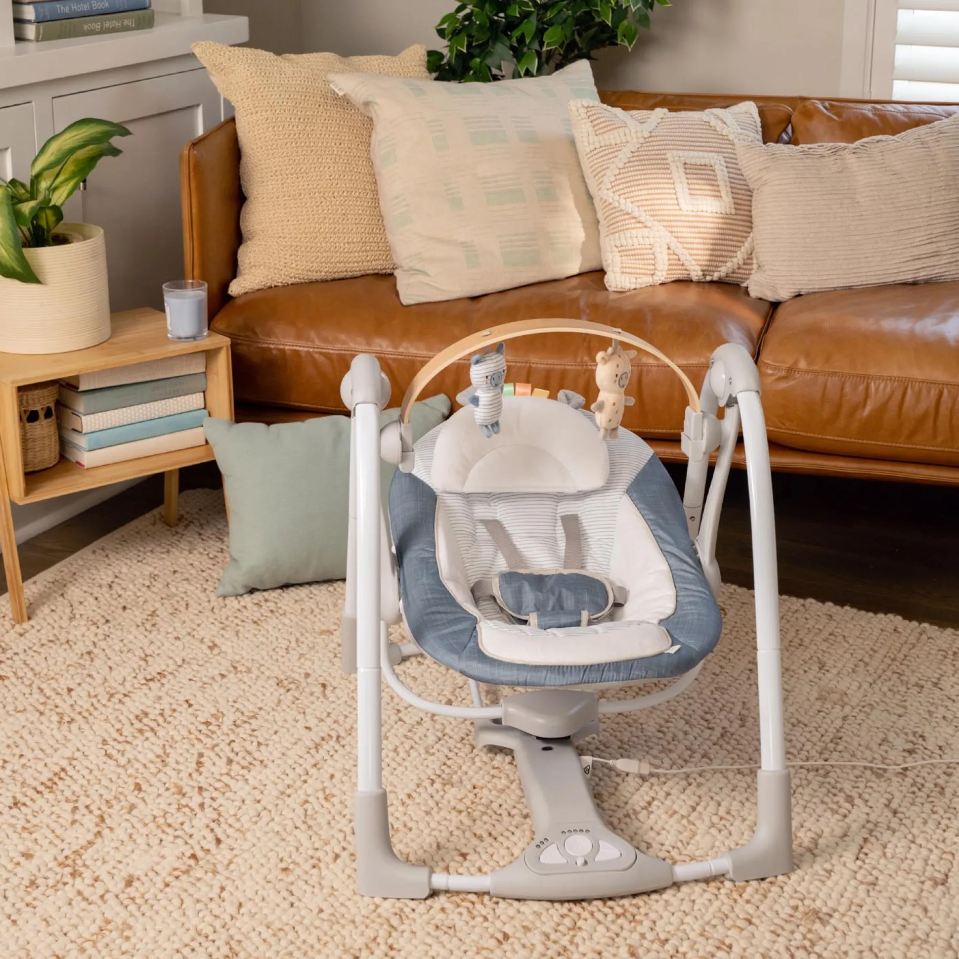 Houd je kindje bezig met de Ingenuity Swing ’n Go Portable Swing – Chambray! De afneembare en roterende speelgoedstang – gemaakt van hout uit een duurzaam bos – zorgt voor een luxe afwerking. De speelgoedstang is afneembaar en kan worden gedraaid om je kindje gemakkelijk in de schommel te zetten en eruit te halen. Deze hoogwaardige schommel heeft 5 snelheden met gewichtsgevoelige TrueSpeed-technologie, een timer en een WhisperQuiet-motor. De schommel wordt gevoed door een USB-snoer (meegeleverd). Het zitkussen en de hoofdsteun zijn afneembaar voor een snelle en gemakkelijke reiniging. Houd je kindje bezig met muziek; onze schommel is uitgerust met 8 melodieën en 3 zachte natuurgeluiden waarvan het volume door de ouders kan worden geregeld. De Swing ’n go is uitgerust met 5-puntstuigje voor extra veiligheid van de baby. Dit draagbaar schommelstoeltje is geschikt voor baby’s van 0-9 maanden of tot de baby 9 kg weegt, afhankelijk wat zich het eerst voordoet.