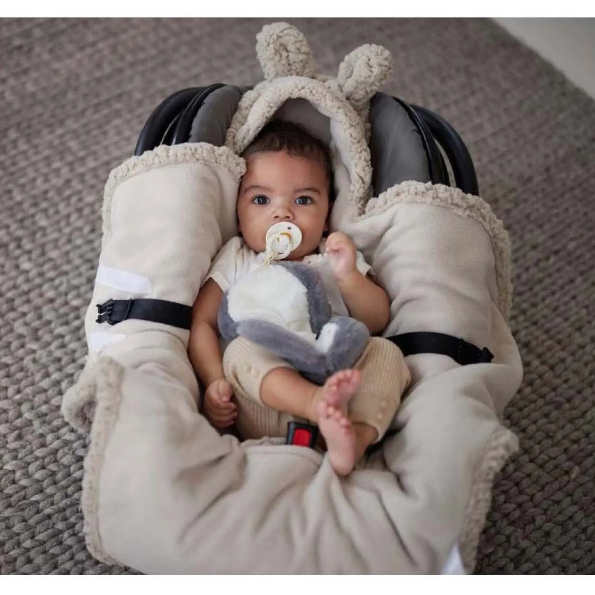 De Jollein wikkeldeken Bunny is een echte must-have voor je kindje. Deze zachte wikkeldeken met een lief konijnengezichtje houdt je kindje heerlijk warm, of je nu onderweg bent of thuis op de bank knuffelt. De binnenkant van superzachte teddy fleece voelt comfortabel aan, terwijl de buitenkant van stijlvolle ribstof zorgt voor een moderne look. Dankzij de handige openingen voor een 3- of 5-puntsgordel is deze wikkeldeken perfect geschikt voor de autostoel groep 0+, zodat je kindje veilig en warm blijft tijdens elke rit. Met klittenbandsluiting en een lus aan de achterzijde is de deken makkelijk te bevestigen en op te bergen. Ideaal vanaf de geboorte en perfect als cadeau voor elke babyuitzet. Afmeting: 100×105 cm.