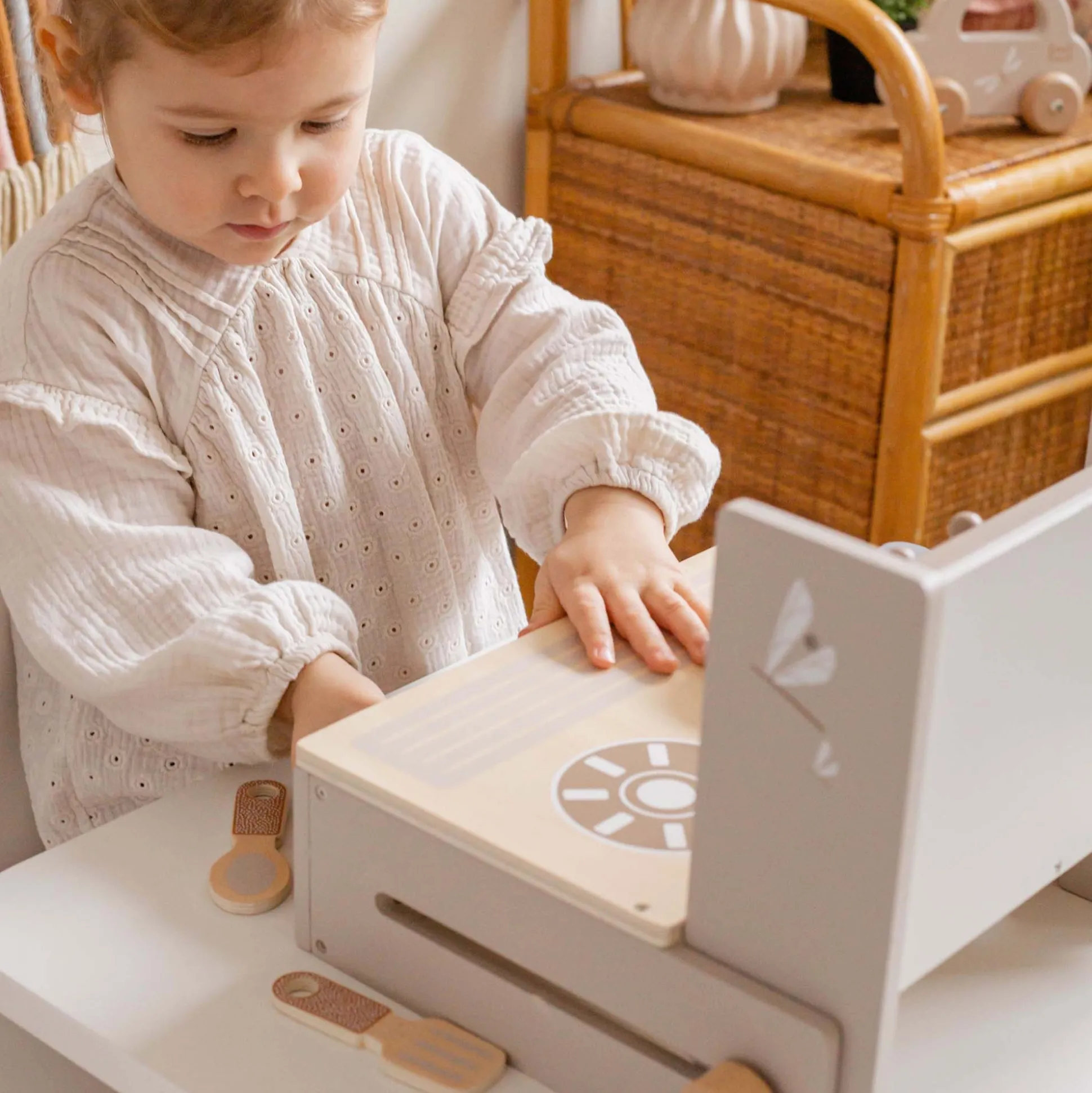 Dit mooie, compacte kookfornuis van Label Label neemt uw kindje makkelijk overal mee naartoe. Met deze mini keuken kan je kindje wanneer hij wil zijn kookkunsten tonen. Alles is aanwezig om meteen aan de slag te gaan: braadpannetje en kookpotje met deksel en de bijhorende accessoires zoals spatel, mes, lepel en niet te vergeten peper- en zoutvat! Laat alles lekker stoven en pruttelen door de temperatuur te regelen met de klikkende draaiknoppen. Eénmaal klaar, vouw je het mini fornuis met een paar eenvoudige stappen op en kan alles binnenin geordend worden. Opgeruimd staat netjes! Het Label Label opvouwbaar kookfornuis met bijhorende accessoires neemt niet veel plaats in en neem je makkelijk overal mee naartoe. Tijdens het spelen krijgen kinderen de kans volledig op te gaan in hun eigen fantasie. Zowel hun creativiteit als verbeeldingskracht worden gestimuleerd, ze leren interageren en oefenen hun logische redeneringsvorm en oog-hand coördinatie. Geschikt vanaf: 3 jaar.