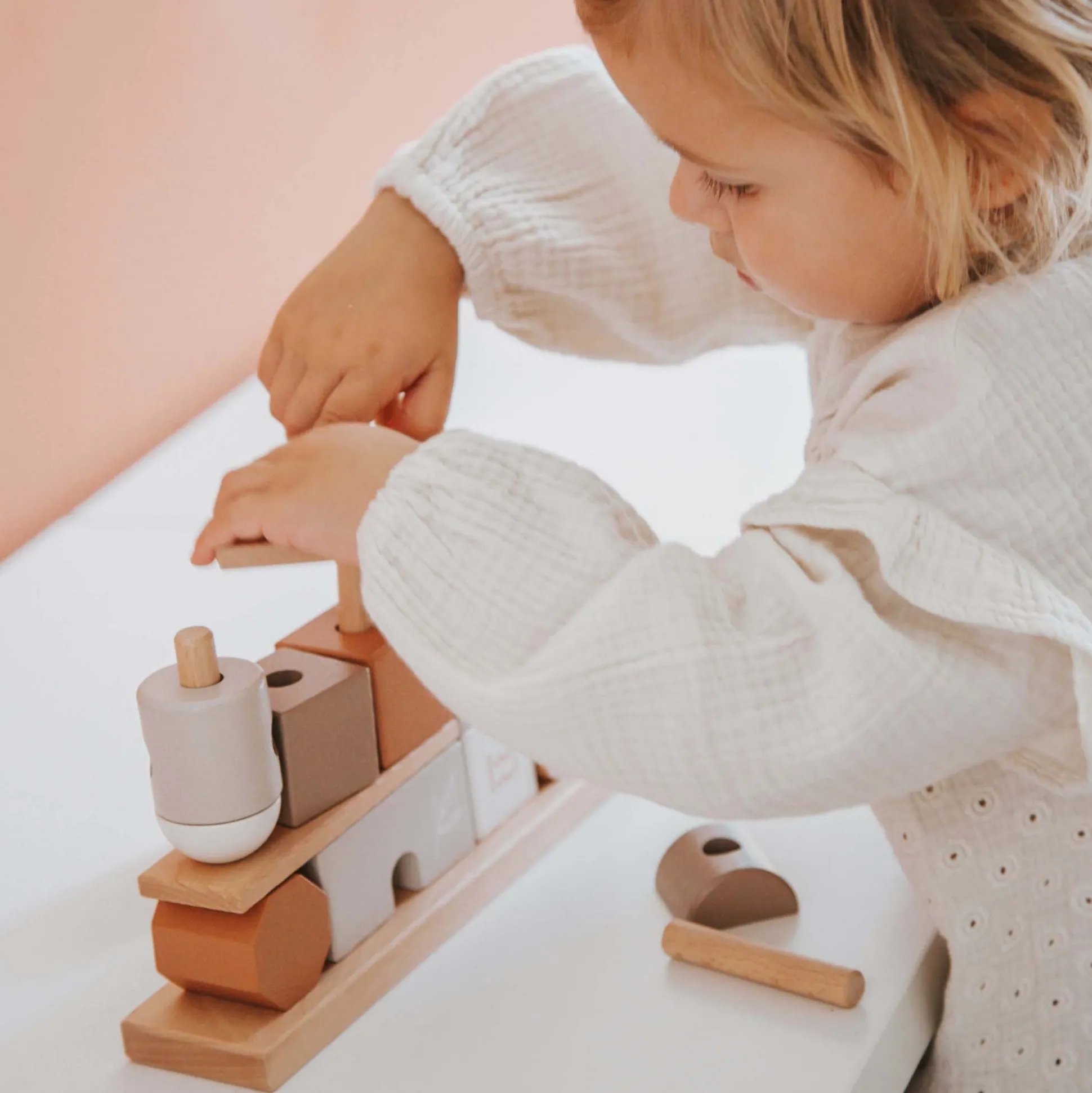 Deze stapelblokjes van Label Label zijn vervaardigd uit kwaliteitsvol beukenhout. Dit minihuisje is opgebouwd uit 4 rijen houten blokjes. In totaal zijn er de basis, 8 houten stokjes en 14 blokjes in verschillende vormen en met verschillende kleurtinten, symbolen en patronen waarmee je kindje zijn eigen fantasiehuisje kan bouwen. Spelenderwijs zal je kindje zijn fijne motoriek oefenen, maar ook de fantasie, verbeeldingskracht en ruimtelijk inzicht wordt gestimuleerd. Label Label houten speelgoed is gemaakt van FSC gecertifieerd hout. Geschikt vanaf 18 maanden.