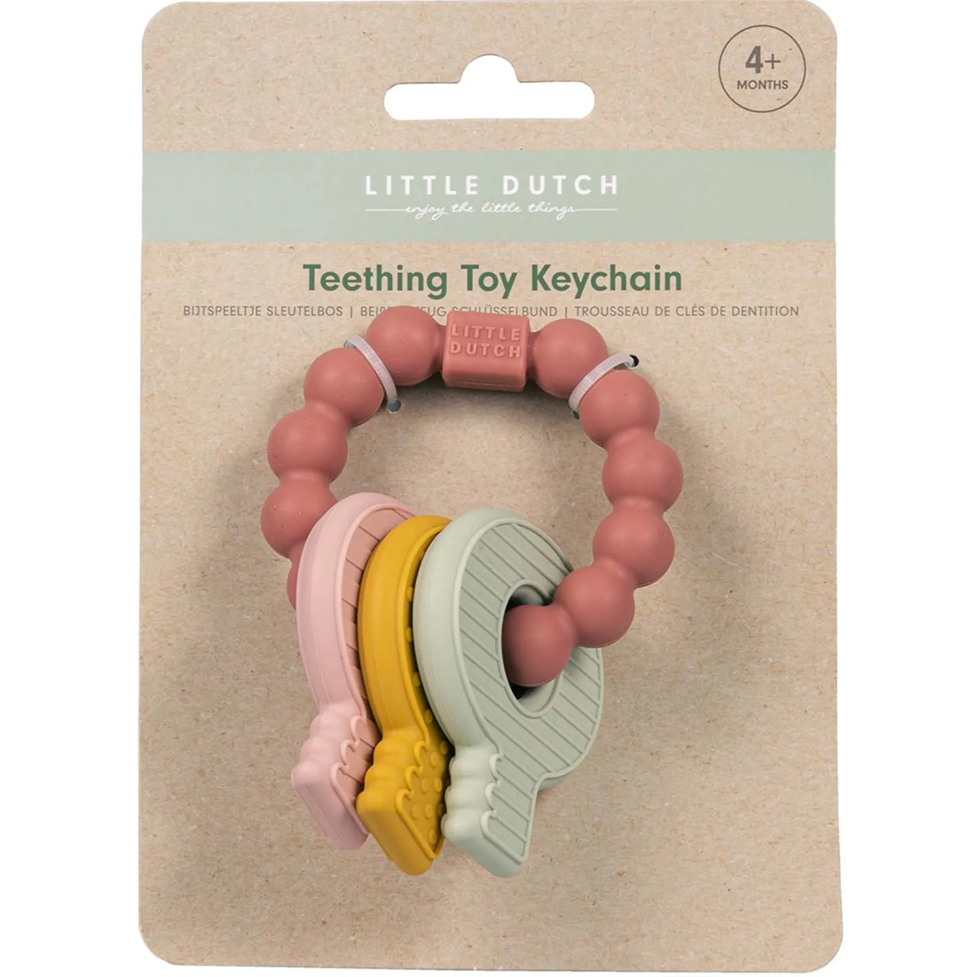 De komst van de eerste tandjes is een mijlpunt voor je kindje, maar niet altijd even prettig! Om de pijn te verlichten heeft is deze multifunctionele bijtring van Little Dutch erg handig. Dit bijtspeeltje, in de vorm van een sleutelbos, is een speeltje dat helpt bij de nieuwe tandjes die door te komen maar biedt ook troost aan je kindje. Het bijtspeeltje heeft verschillende texturen waardoor je kindje genoeg te ontdekken heeft. Speciaal ontworpen dat het makkelijk vast te pakken is voor kleine handjes!. Materiaal: siliconen. Geschikt voor kindjes vanaf 4 maanden.