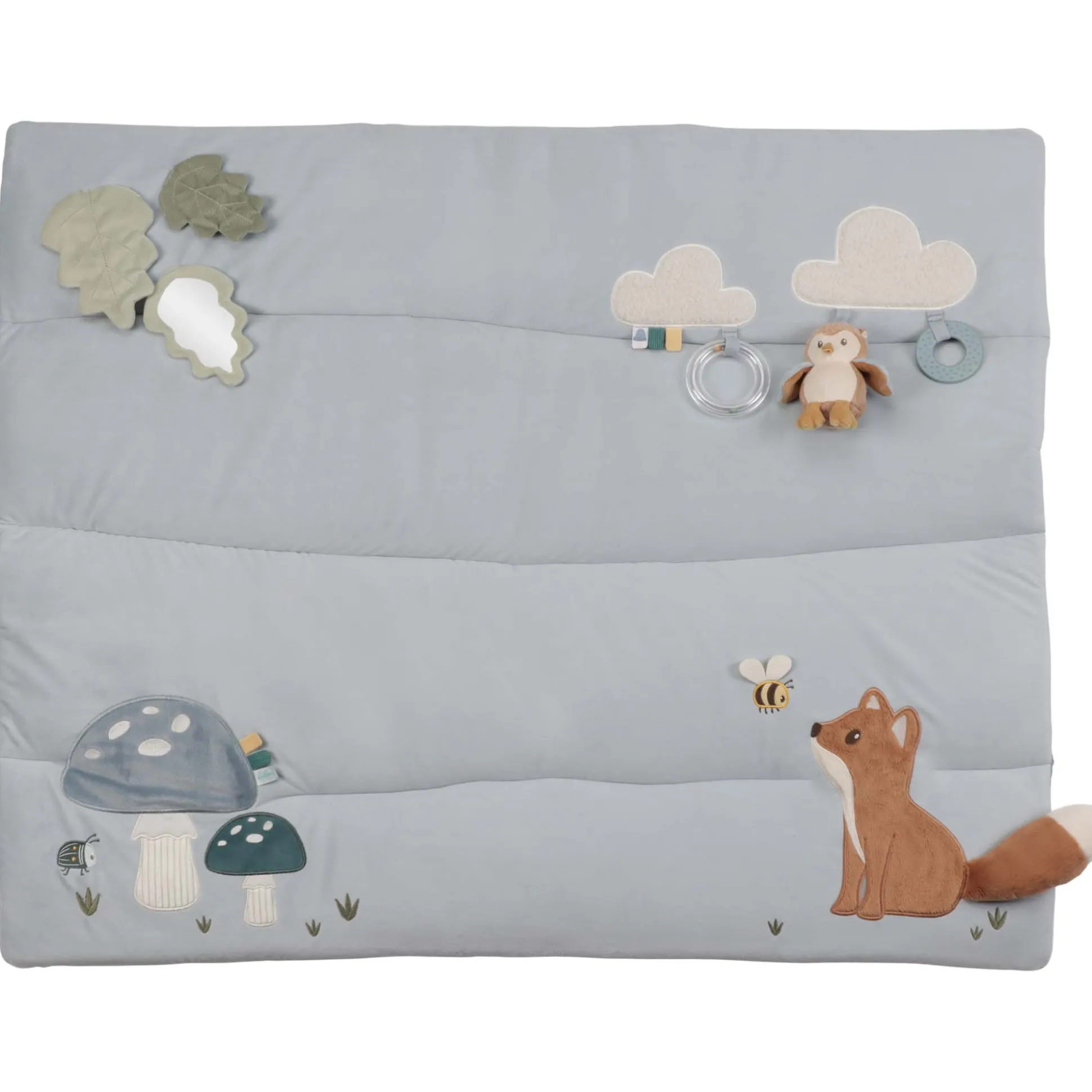 Laat je onderdompelen in de magie van de Forest Friends op dit schattige blauwe boxkleed van Little Dutch. Er valt zo veel te ontdekken en zien! Ga op avontuur om het knisperend blaadje en de zachte wolken te vinden, ontmoet het lieve zachte vosje en speel met de uil en het kevertje. Er is ook een kleine spiegel voor zelfontdekking en een transparante ring met drie kraaltjes die rammelen als ze bewegen. Dit gewatteerde boxkleed met verschillende texturen en activiteiten stimuleert de zintuigen en ontwikkeling van je kindje. Afmeting: 80 x 100 cm. Kan in de wasmachine op 30 graden.