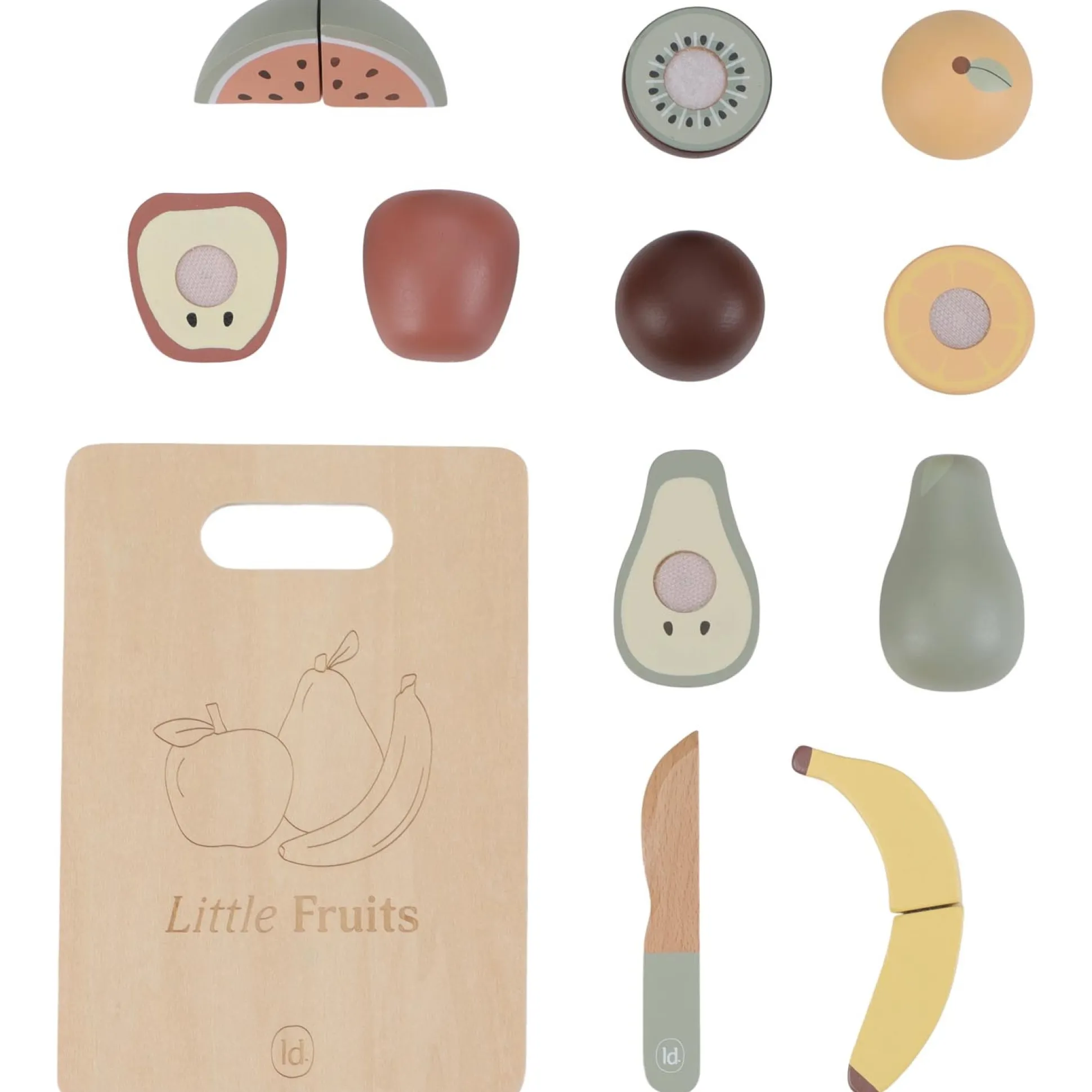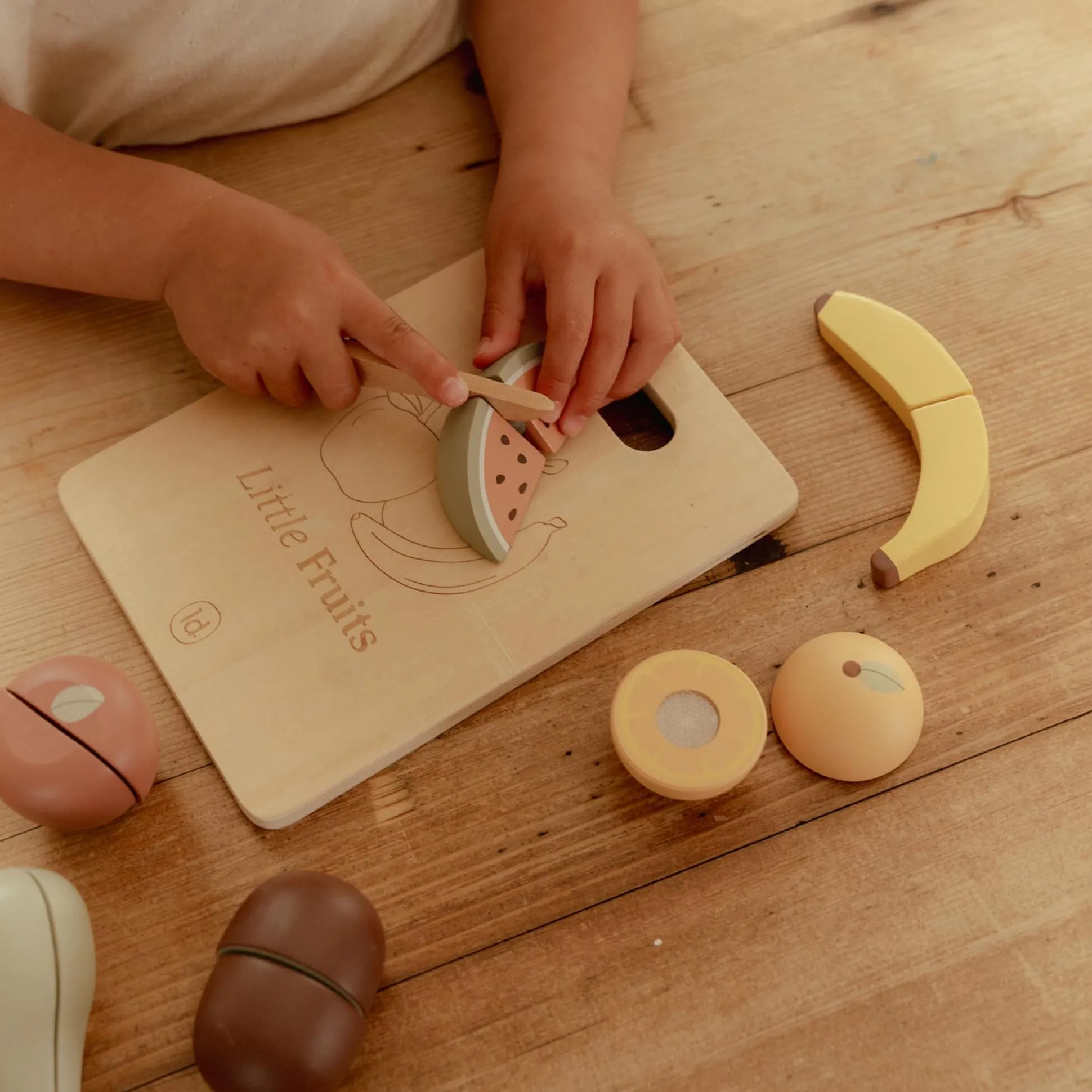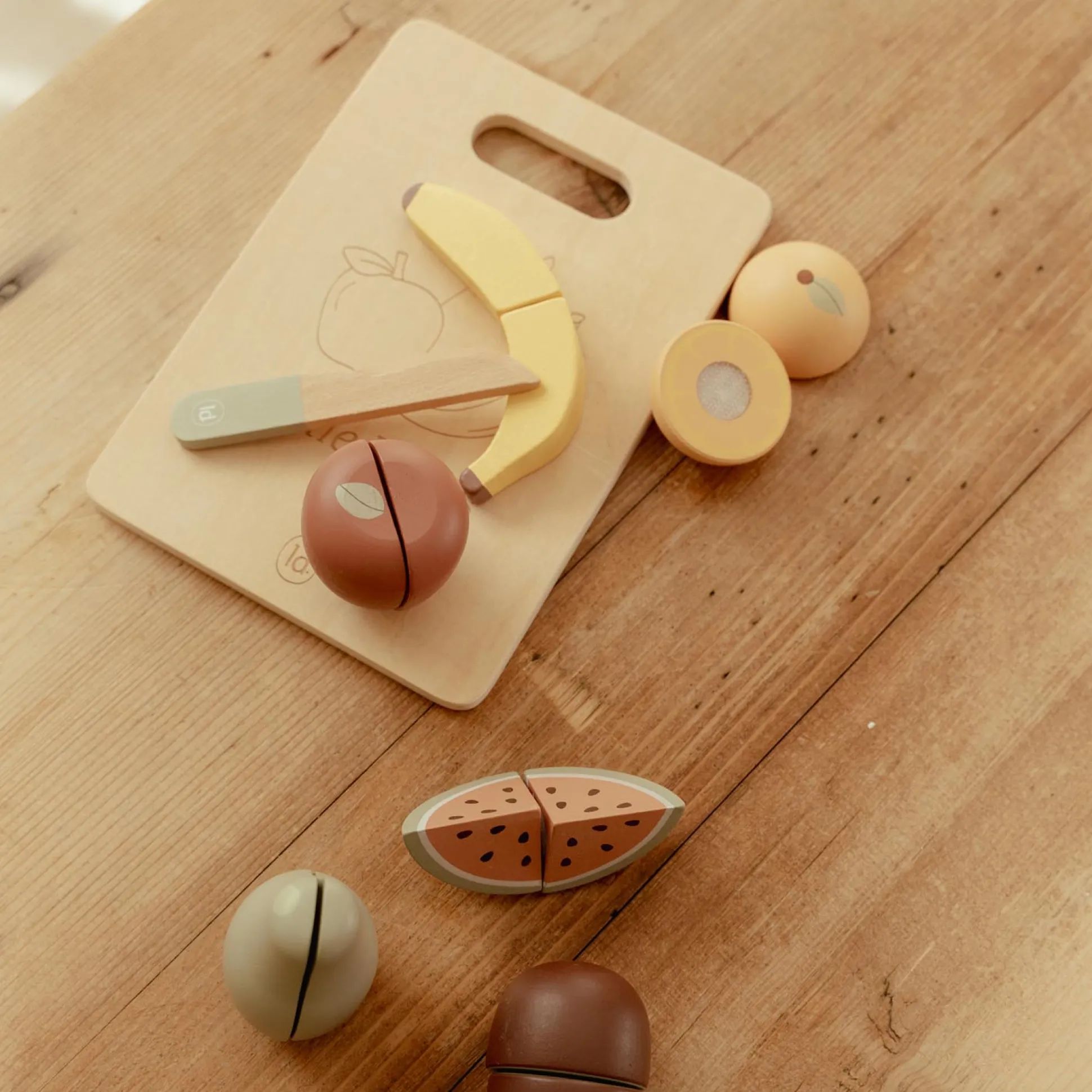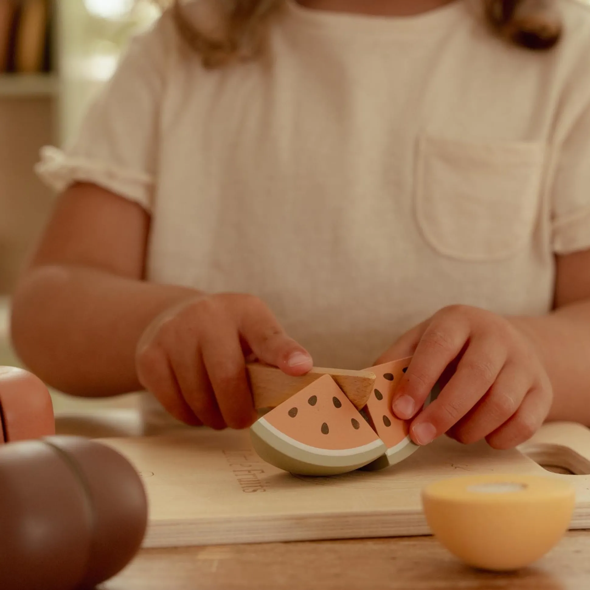Maak een fruitige traktatie klaar! Dit vrolijke houten snijfruit bestaat uit zes verschillende soorten: een appel, peer, banaan, kiwi, sinaasappel en een stuk watermeloen. Elk stuk fruit kan doormidden worden gesneden met het houten mesje en is dankzij het klittenband eenvoudig weer aan elkaar te plakken. Perfect voor kleine chef-koks die graag spelen en oefenen met snijden!