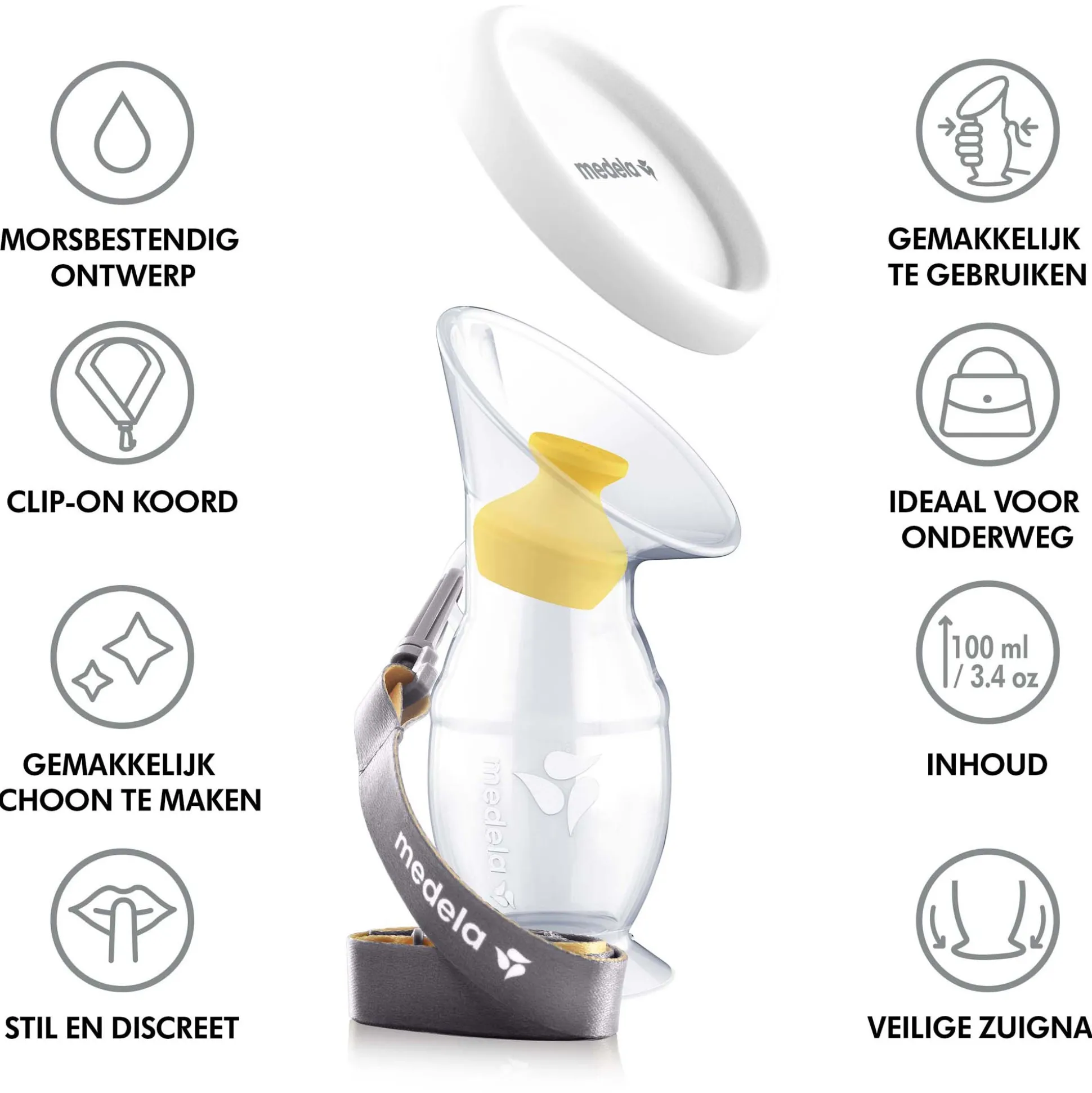 Medela’s Siliconen Moedermelkcollector vangt elke druppel van je kostbare moedermelk op die anders op je zoogkompres of kleding zou lekken. Lichtgewicht en gebruiksvriendelijk: plaats de collector op je borst terwijl je borstvoeding geeft of kolft aan de andere kant. Voorzien van een deksel en stop, zodat je dubbel beschermd bent tegen morsen. De veilige zuignap zorgt ervoor dat de collector niet omvalt wanneer deze wordt neergezet. Ontspan en houd je handen vrij door simpelweg het veiligheidskoord om je nek te doen. Gemaakt van zachte 100% voedselveilige silicone en een zachte rand voor een comfortabelere ervaring. 100% BPA-vrij.Een Siliconen Moedermelkcollector is niet ontworpen om actief melk uit de borst te verwijderen. Als je een kolvende moeder bent, raden we je aan om de collector te gebruiken in combinatie met een handkolf of elektrische borstkolf. Dit betreft een hygiëne artikel en mag dus niet geretourneerd worden na opening van de verpakking.