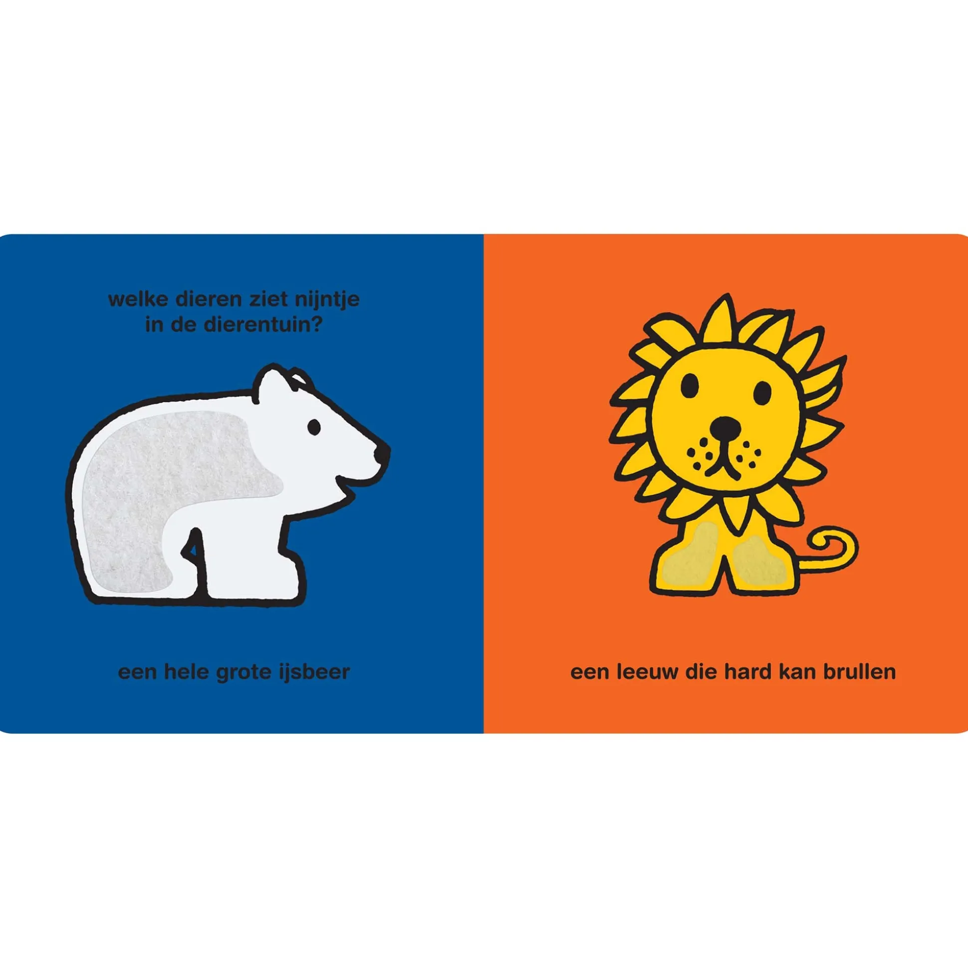 Nijntje ziet heel veel verschillende dieren in de dierentuin: een ijsbeer, apen en papegaaien. Welk dier heeft een bult op zijn rug? Met de zachte voelelementen zijn alle dieren aaibaar. Kijk je mee welke dieren nijntje ziet?