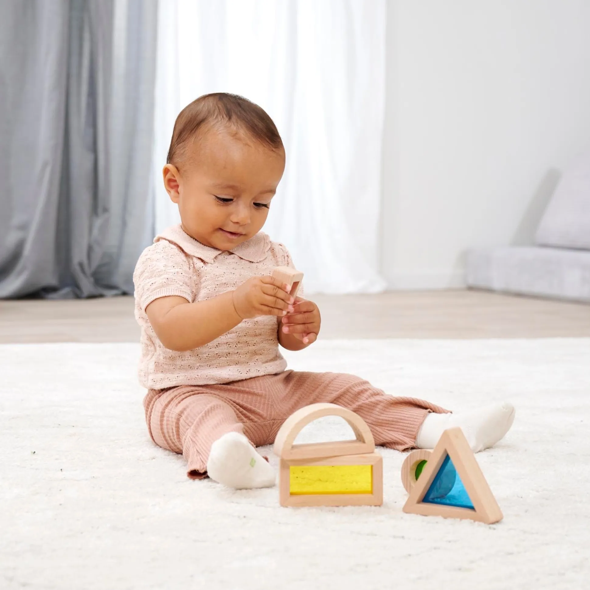 De Montessori raamstenen in vijf verschillende vormen zijn fascinerend speelgoed. Gevuld met gekleurd acrylglas nodigen ze kinderen uit om te ontdekken. Zo kunnen kinderen de wereld door een kleurrijke lens bekijken. Het blok met de spiegelfolie zal vooral de allerkleinsten verbazen. De vijfdelige set bevat een driehoek, rechthoek, vierkant, cirkel en een boog met spiegel. De raamstenen van Eichhorn zijn gemaakt van 100% FSC-gecertificeerd beukenhout en zijn geschikt voor kinderen vanaf 1 jaar.