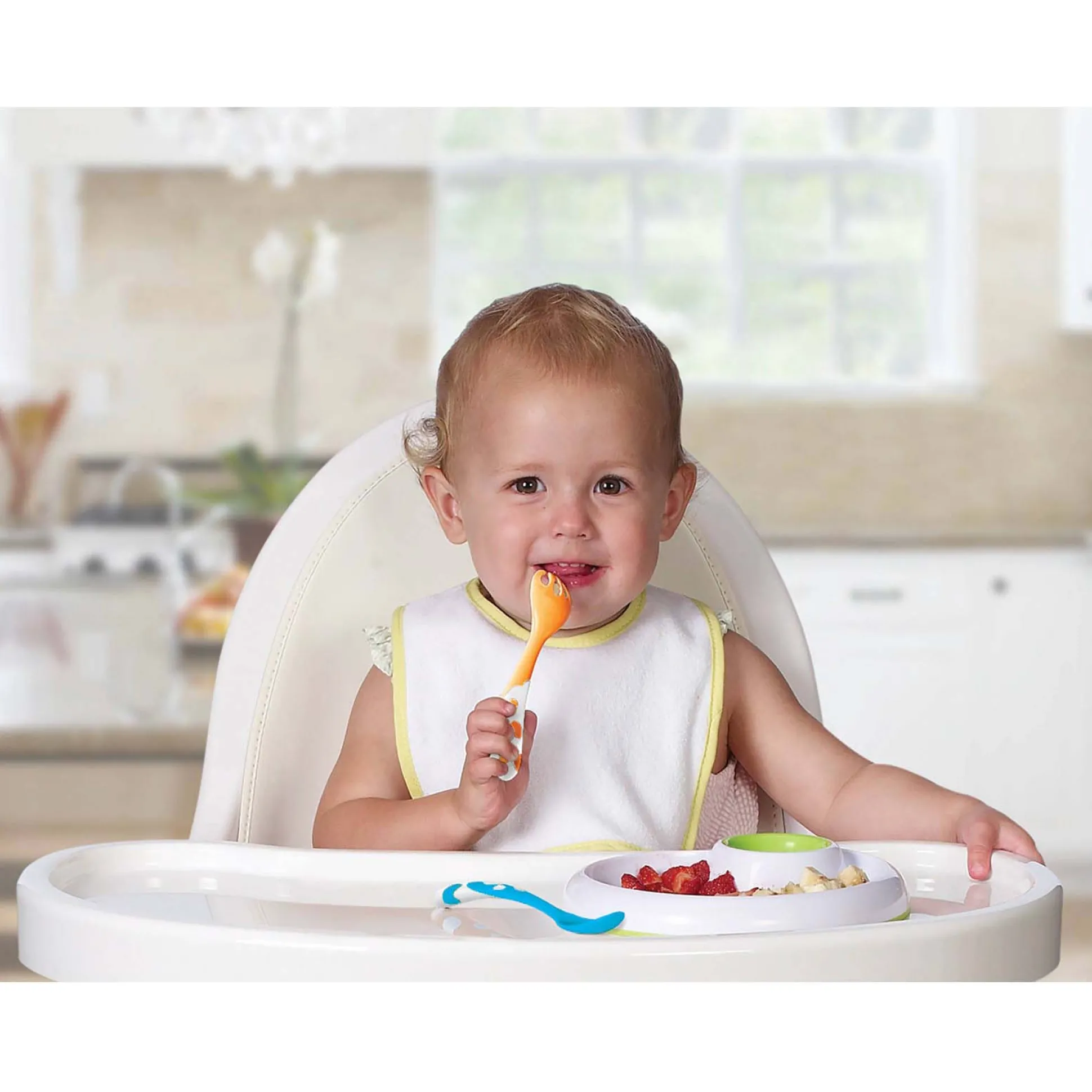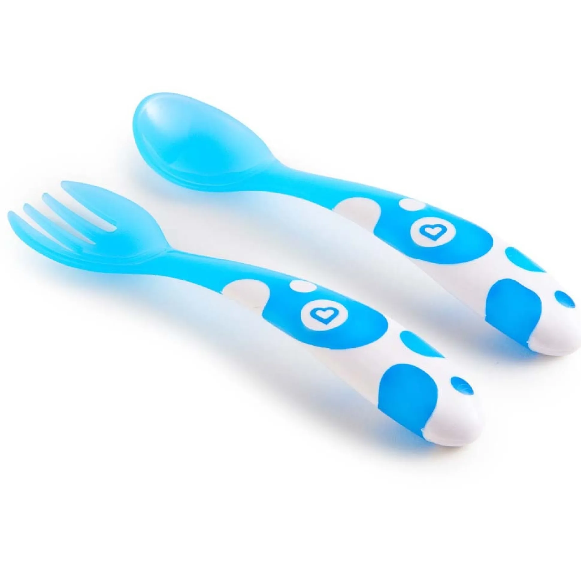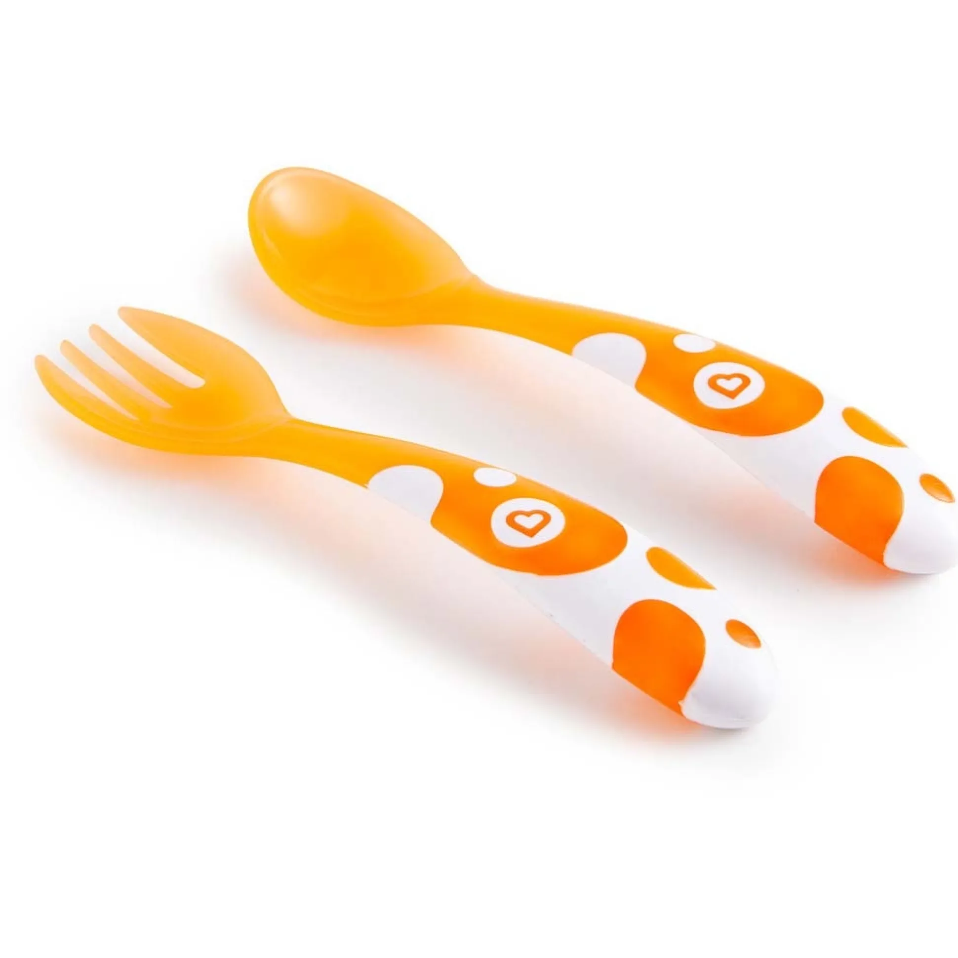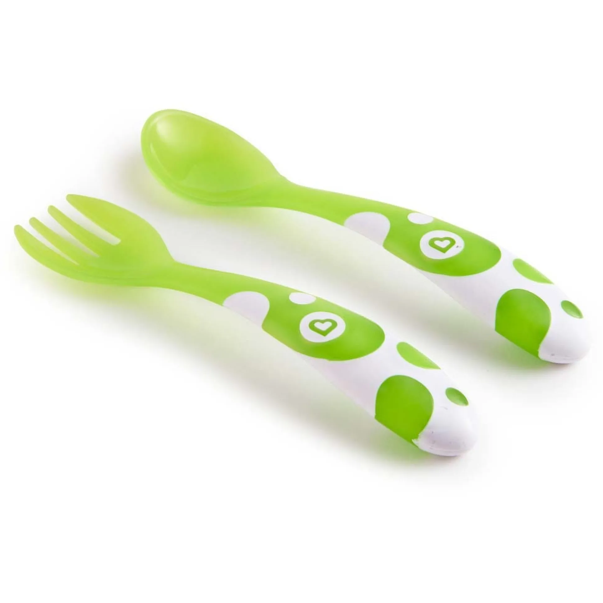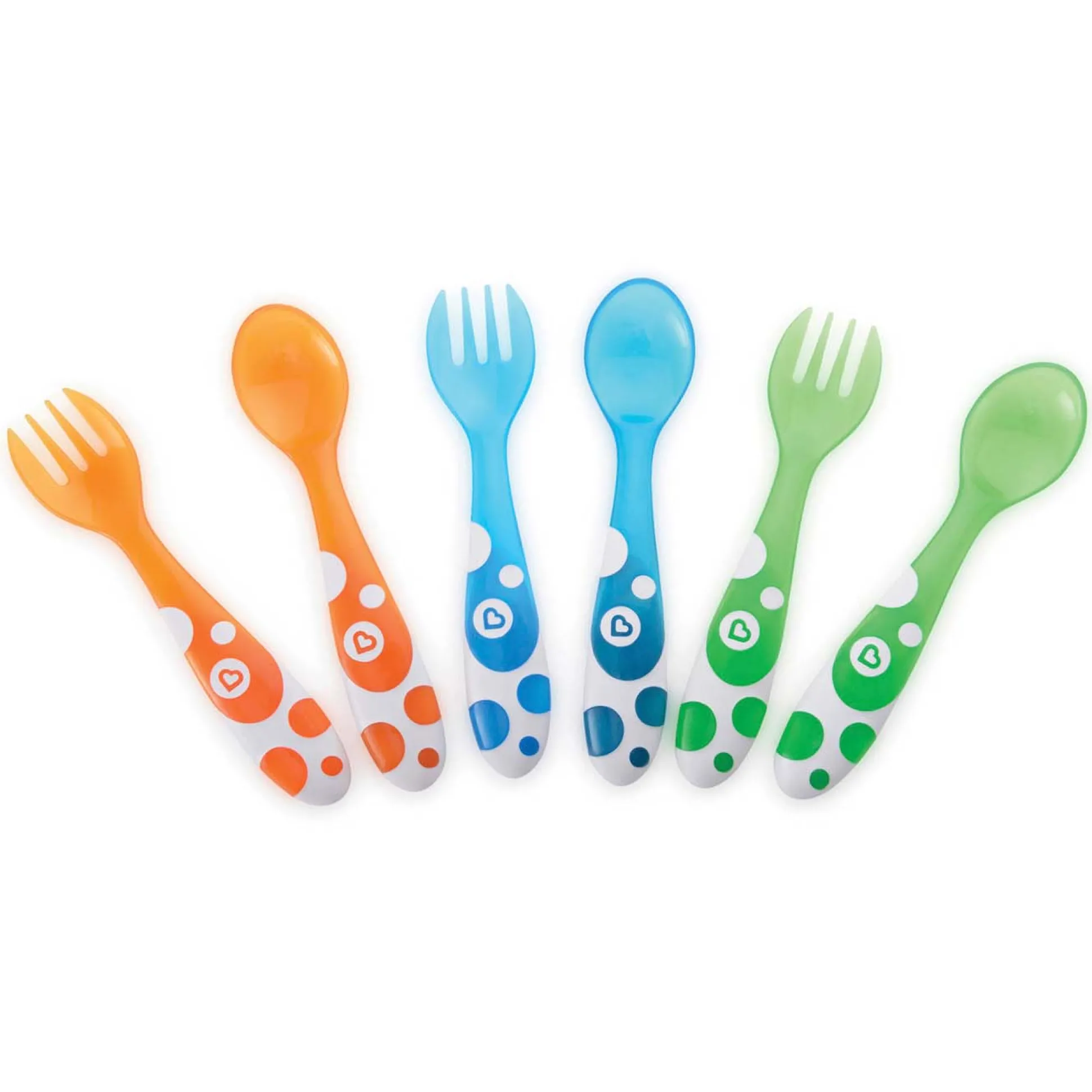 Jonge kinderen vinden het leuk om mama en papa na te doen. En met deze Veelkleurige vorken en lepels van Munchkin kunnen uw kids aan tafel hun favoriete grote mensen nabootsen. Deze set bevat 3 vorken en 3 lepels die zijn ontworpen om uw kindje te helpen bij het zelfstandig eten. De grote gebogen steel maakt scheppen makkelijker. Bevat: 3 vorken en 3 lepels. De diepe lepels kunnen meer voedsel bevatten en maakt scheppen makkelijker. De gebogen vorken zijn veilig en afgerond uit veiligheidsoverwegingen, maar helpen ook bij de overgang naar “echt” bestek. BPA-vrij.