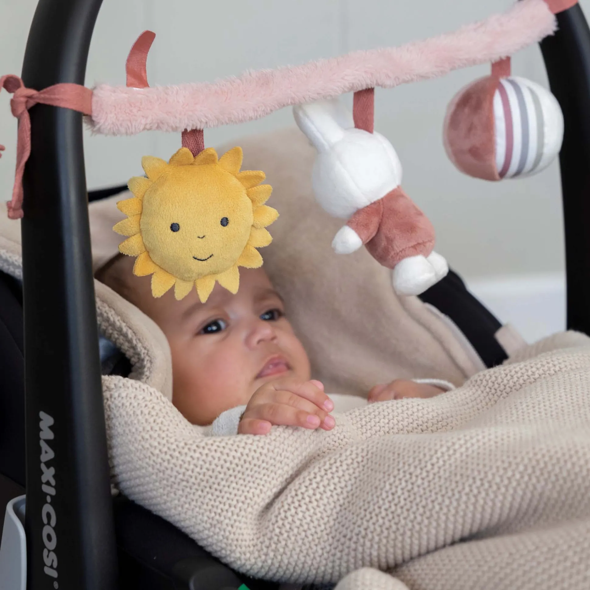 Nooit meer een saaie wandeling of autorit met deze leuke wagenspanner van nijntje. De wagenspanner bevat drie speeltjes met elk een andere activiteit: knisperpapier, een pieper en een rammelaar. Doordat je kindje de speeltjes probeert te pakken stimuleer je de hand-oogcoördinatie. De wagenspanner is eenvoudig te bevestigen aan de kinderwagen of het autostoeltje d.m.v. de lusjes. Leeftijd: vanaf de geboorte.