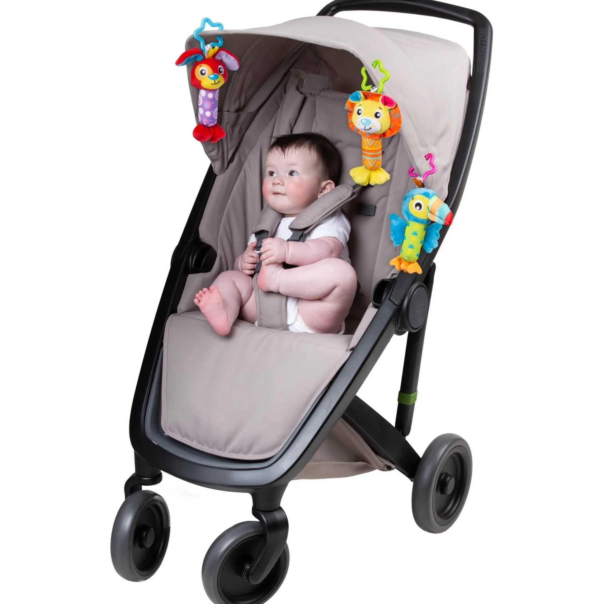 Met de praktische clips kunnen hond, koe en vogel eenvoudig aan de kinderwagen of aan de babybox worden bevestigd en zorgen voor plezier en spanning onderweg. Bij beweging rammelen, rinkelen en piepen de kleurrijke knuffeldieren – daardoor wordt naast zien en voelen ook het gehoorgevoel verbeterd. De flexibele, stervormige clips dienen bovendien ook als bijtringen voor het kalmeren van wonderen van de griemen.