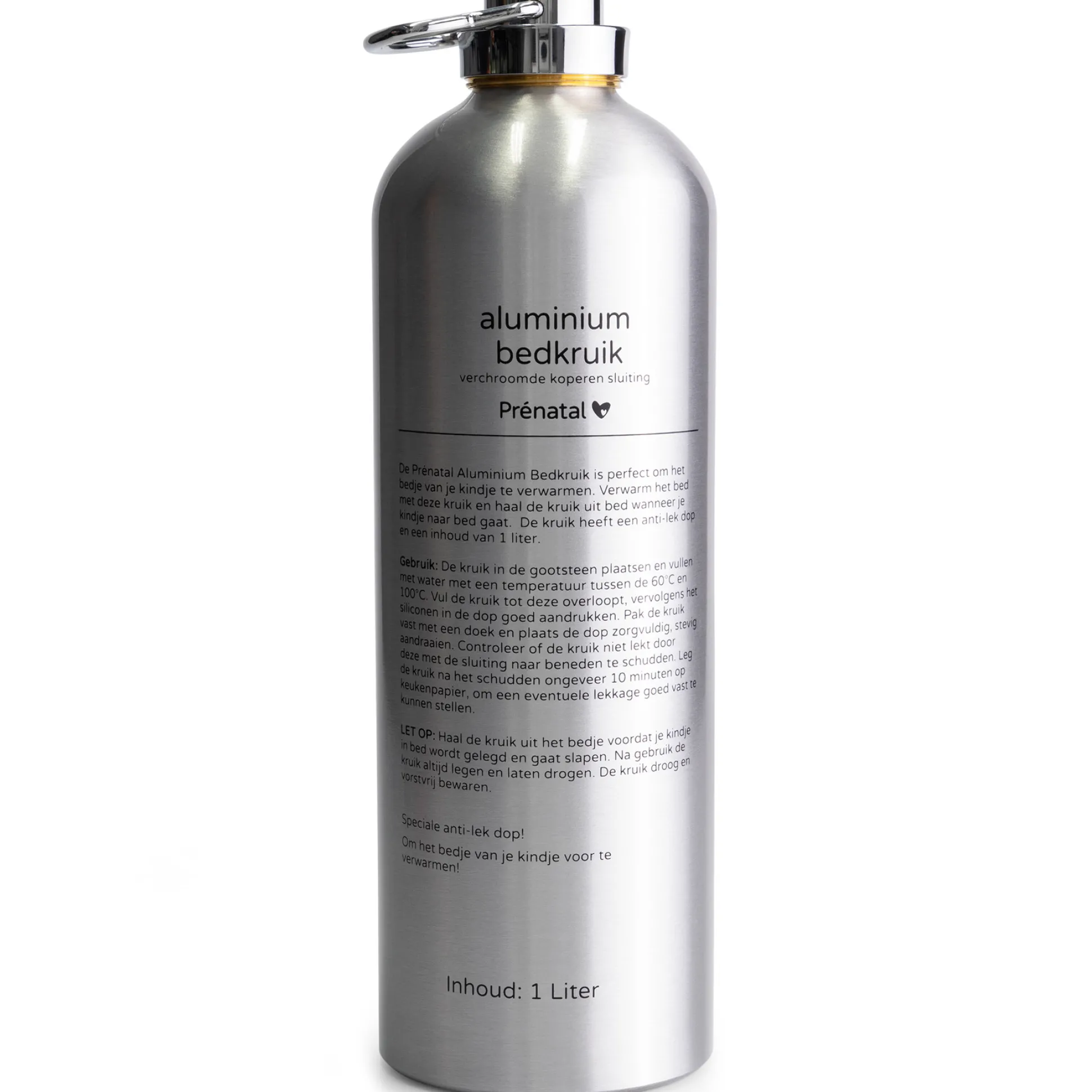 De Prénatal aluminium kruik is ideaal om het bedje van je kindje voor te verwarmen. Haal de kruik uit bed wanneer je kindje naar bed gaat. Je baby zal snel en heerlijk in slaap vallen. De kruik heeft een inhoud van 1 liter. Met een lengte van 25 cm past deze kruik in een standaard kruikenzak. Na gebruik de kruik altijd legen en laten drogen. De kruik droog en vorstvrij bewaren. Dit is van groot belang om de kruik in goede conditie te houden en roesten (oxidatie) te voorkomen welke kan leiden tot beschadigingen aan de kruik. Test altijd zoals bij elk gebruik de kruik goed op lekken op de opening van de kruik.