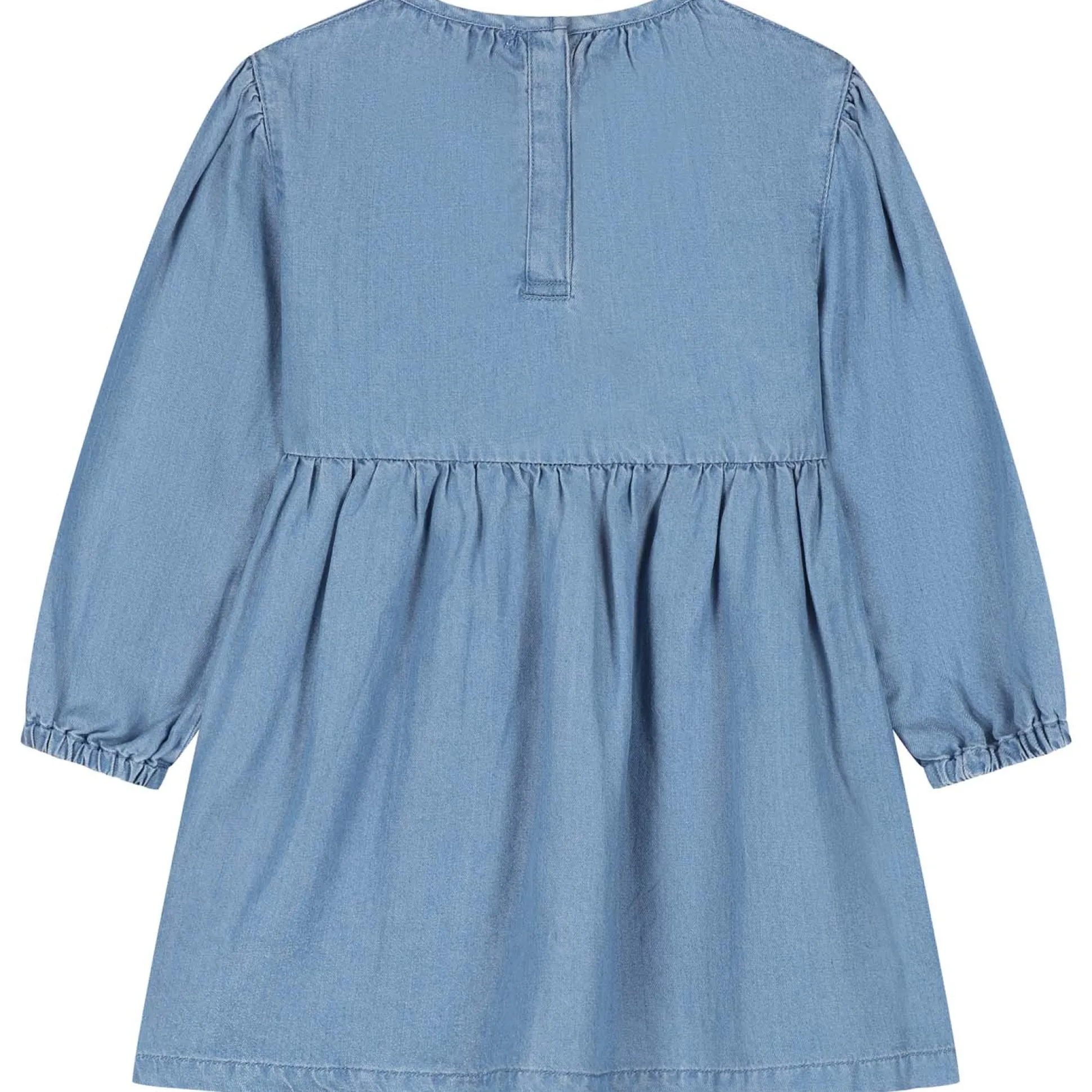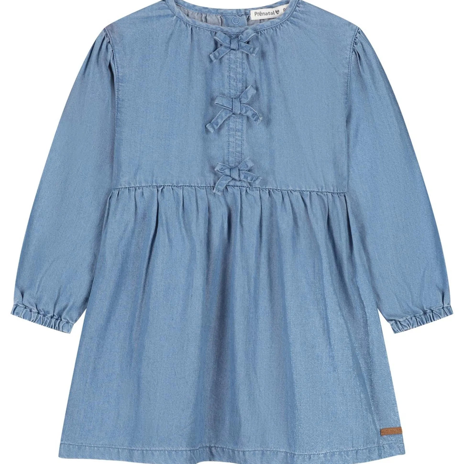 Deze Prénatal baby jurk is gemaakt van een zachte en soepele katoenen denim kwaliteit. De jurk heeft lange mouwen met elastiek aan de onderzijde en een ronde hals met knoopsluiting op de rug en een deelnaad vanaf hier loopt de jurk wijd uit. Aan de voorkant heeft de jurk en neppe opening tot de deelnaad die dicht zit met een een stofstrook aan de binnenkant met op de buitenkant strikjes waardoor het net een opening lijkt. De jurk is voorzien van een effen kleur en is goed te combineren met de rest van de Prénatal collectie. Verkrijgbaar in de maten 56 t/m 122. Kwaliteit: 100% lyocell. Binnenstebuiten wassen op 40 graden met gelijke kleuren.