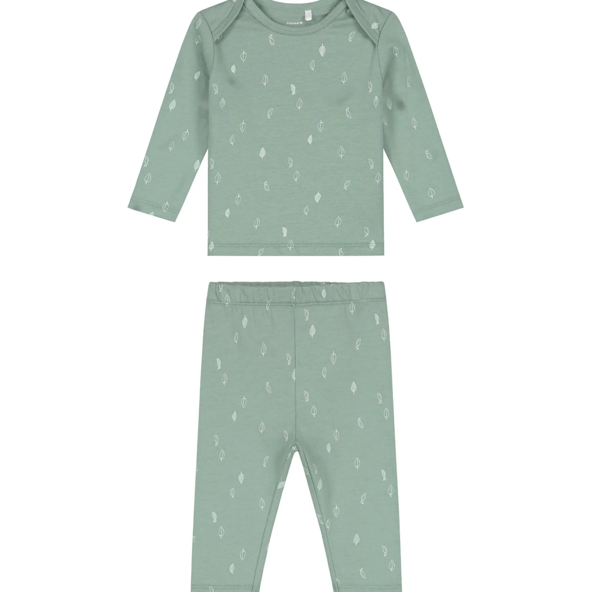 Deze Prénatal baby pyjama is gemaakt van een fijne katoenen kwaliteit. De pyjama heeft lange mouwen en een all over print met bladeren. De pyjama is gemakkelijk aan en uit te trekken door de enveloppe sluiting voor de babymaten en de drukknopen op de schouders voor de peutermaten tot 104. De pyjama is goed te combineren met de rest van de Prénatal collectie en is verkrijgbaar in de maten 56 t/m 122. Kwaliteit: 100% biologisch katoen. Binnenstebuiten wassen op 40 graden met gelijke kleuren.