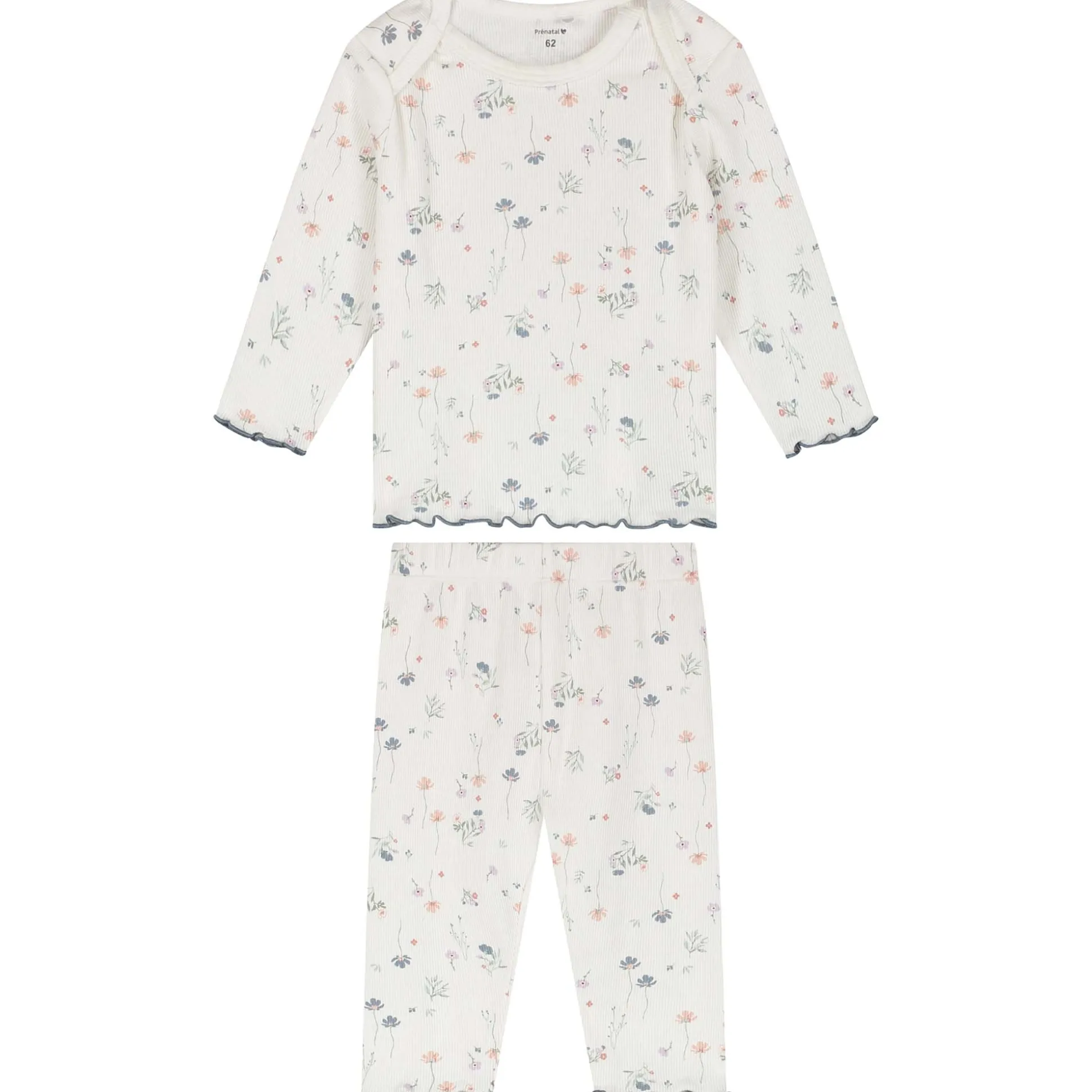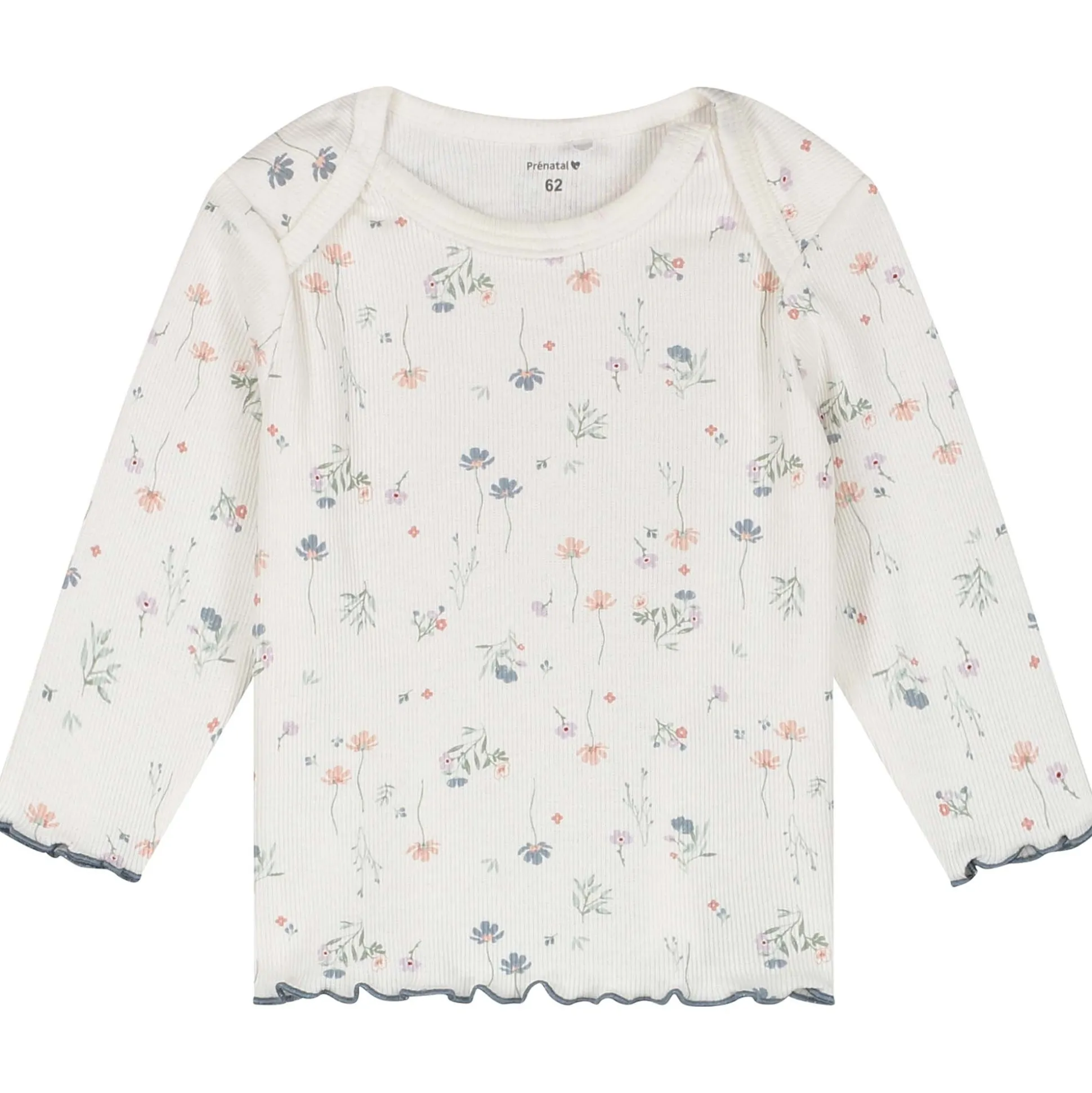 Deze Prénatal baby pyjama is gemaakt van zacht biologisch katoen met een ribstructuur. De pyjama heeft een ivoor witte ondergrond met een all over bloemenprint en lange mouwen. De pyjama is gemakkelijk aan en uit te trekken door de envelophals voor babymaten en de drukknopen op de schouders voor peutermaten. De pyjama is goed te combineren met de rest van de Prénatal collectie en is verkrijgbaar in de maten 50 t/m 122. Kwaliteit: 96% biologisch katoen en 4% elastaan. Binnenstebuiten wassen op 40 graden met gelijke kleuren.