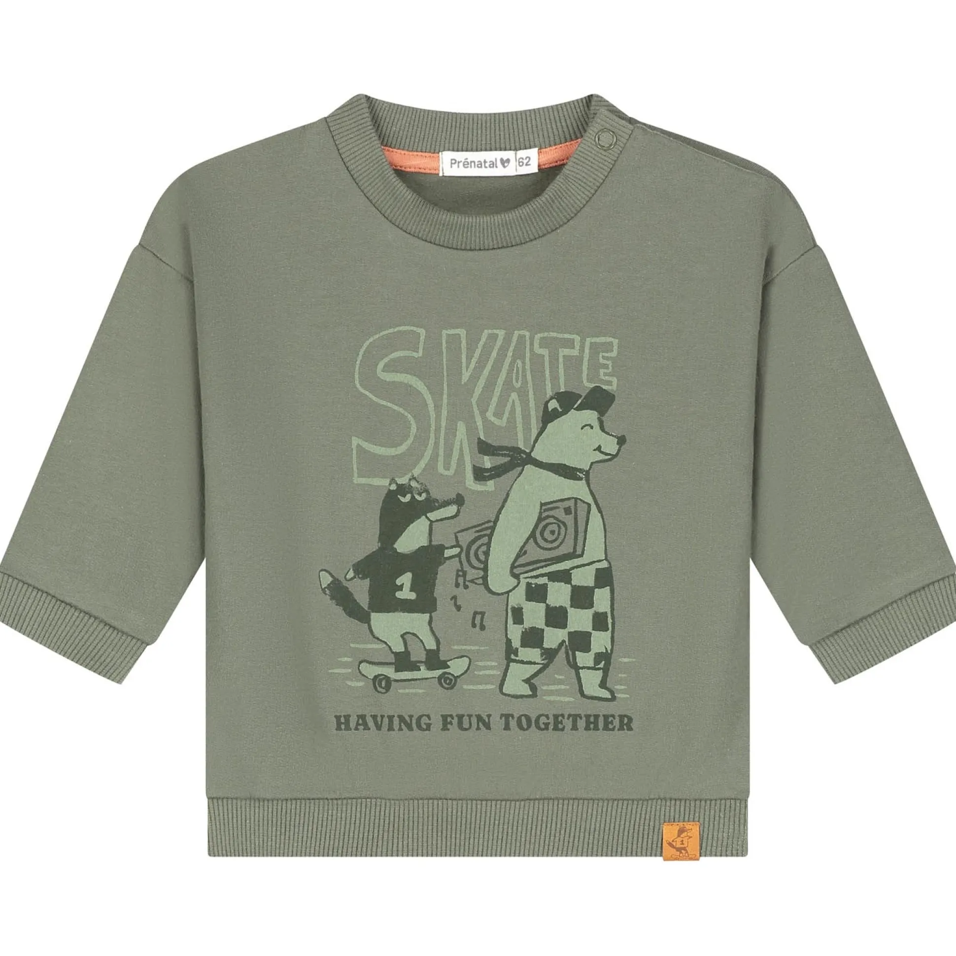 Deze Prénatal sweater is gemaakt van een fijne katoenen kwaliteit. De sweater heeft een ronde hals met een knoopsluiting, hierdoor is deze gemakkelijk aan en uit te trekken bij je kindje. De sweater is voorzien van een leuke skate print op de voorkant. Verkrijgbaar in de maten 56 t/m 68. Kwaliteit: 100% biologisch katoen. Binnenstebuiten wassen op 40 graden met gelijke kleuren.
