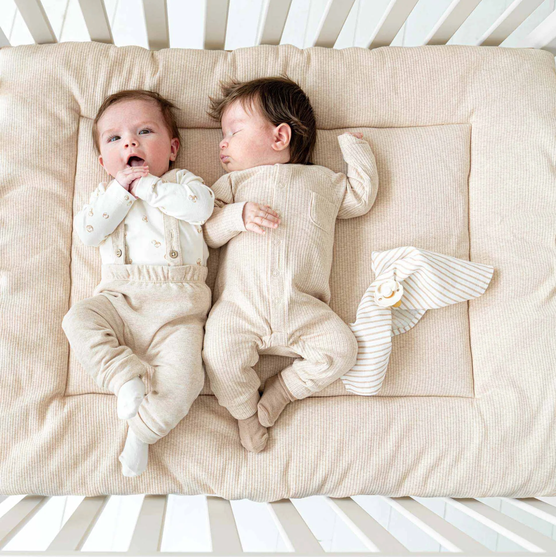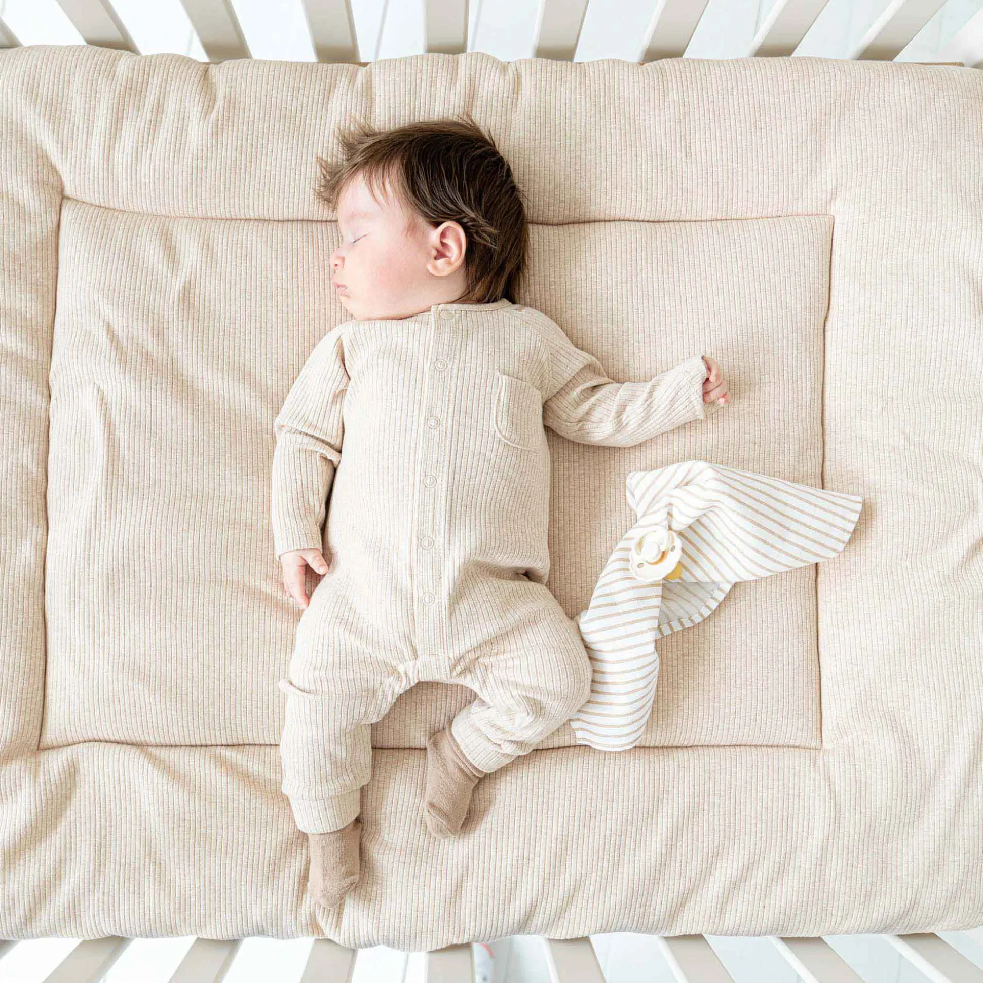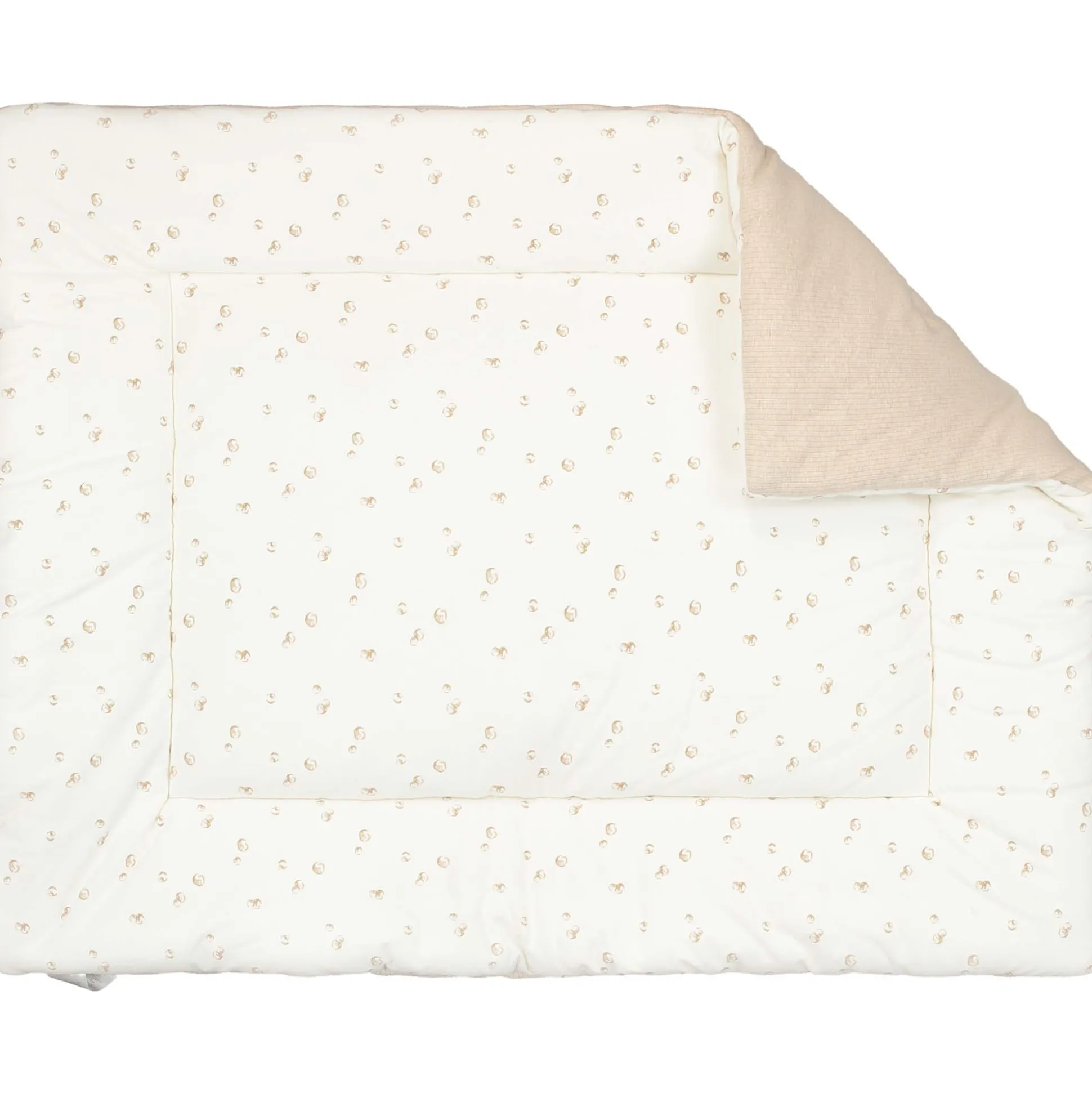 Met dit boxkleed van Prénatal uit het thema Soon weet je zeker dat je kindje heerlijk zacht op kan spelen en slapen. Dit boxkleed heeft aan de ene kant een jersey rib in een beige bruine kleur en aan de andere kant een rustig stippen patroon. Afmetingen zijn 97x77cm. Materiaal jersey rib: 96% biologisch katoen, 4% elasthaan. Materiaal stippen patroon: 95% biologisch katoen, 5% elasthaan.