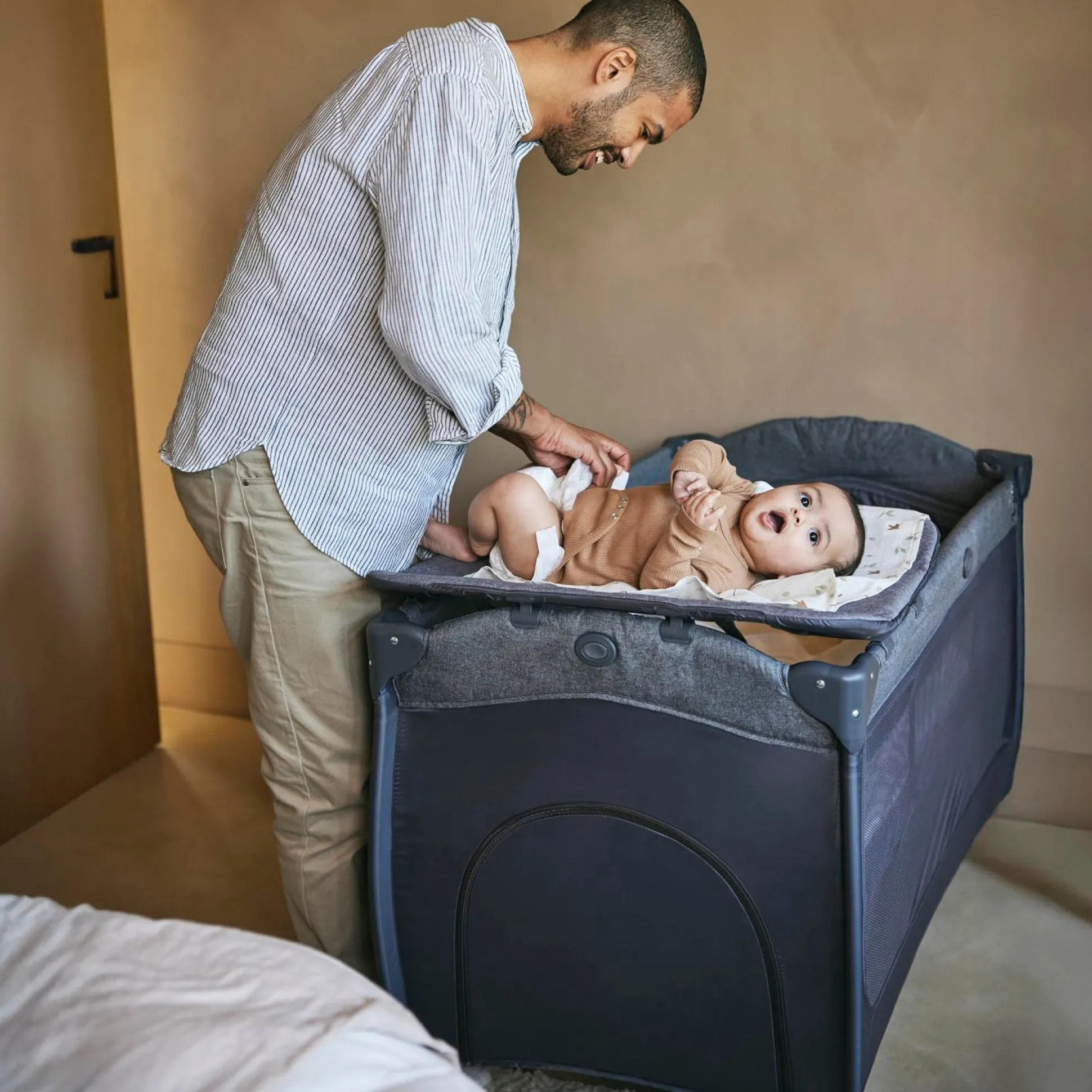 Campingbed Beau is geschikt voor kindjes van 0 tot circa 3 jaar en heeft een maximaal draaggewicht van 15 kg. Het bedje wordt geleverd met een oprolbaar matrasje van 60×120 cm en is voorzien van een afneembare verschoningsmat, een verstelbare bodemverhoger met extra vergrendeling en een oprolbare bodem. De bodemverhoger is ideaal voor jonge baby’s en kan eenvoudig worden verwijderd wanneer je kindje groter wordt. Dankzij de wieltjes met rem verplaats je het bedje moeiteloos, terwijl het stevig blijft staan zodra het op zijn plek staat. Aan de zijkant bevindt zich een kruipluik met rits, waardoor je kindje zelfstandig in en uit het bedje kan kruipen. De zijkanten van ademend gaas zorgen voor voldoende ventilatie en frisse lucht. Het bedje is lichtgewicht, snel uit te klappen en compact op te bergen. Schoonmaken gaat eenvoudig met een vochtige doek. Inclusief handige draagtas voor onderweg.