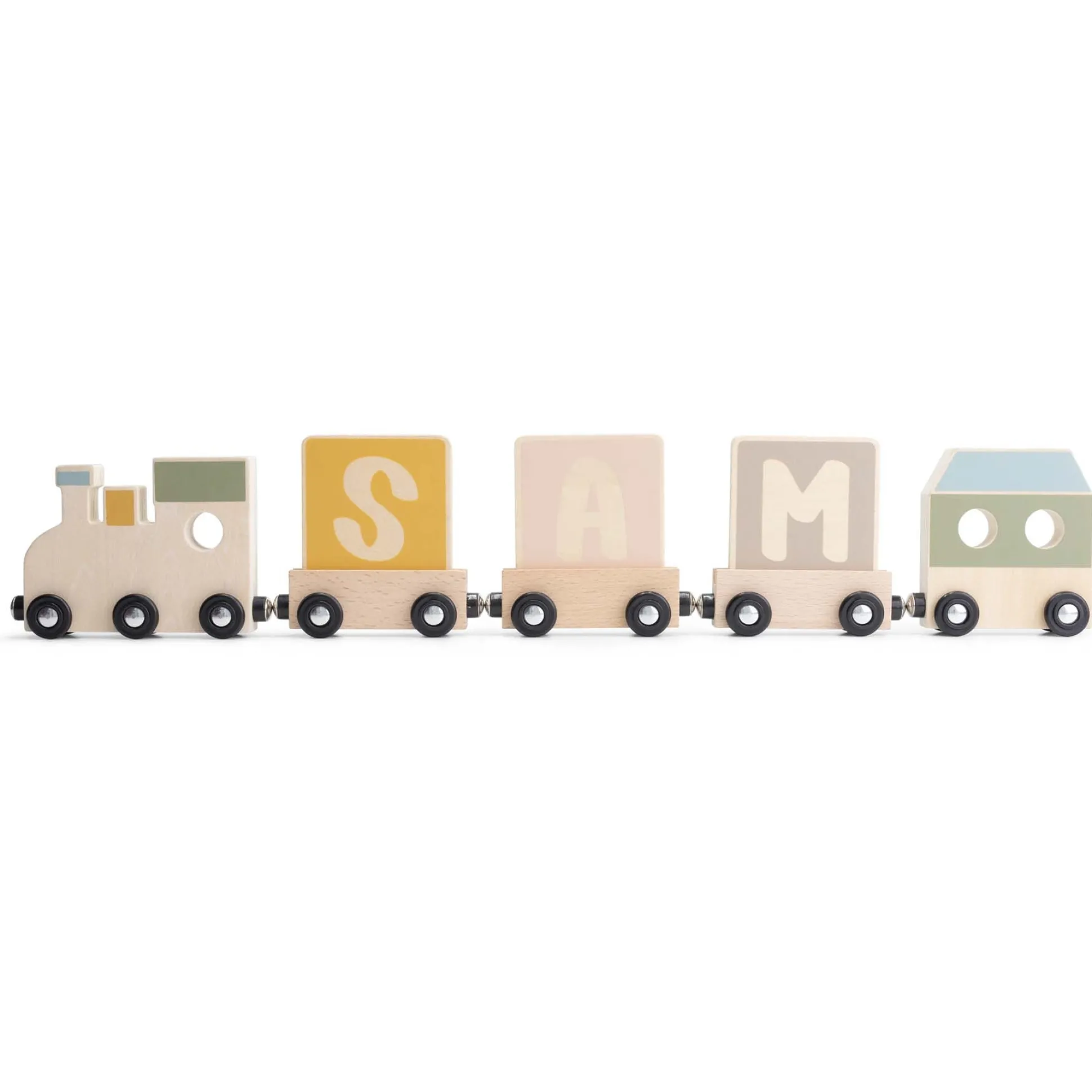 Met de houten lettertrein kun je iedere naam maken die je wil. De lettertrein staat leuk op iedere babykamer. Naast decoratief kan er natuurlijk ook uren met de trein gespeeld worden. Wil je de naam laten beginnen als een echte trein? Wij hebben uiteraard een wagon die de vooraan in de trein kan. Bestaat de naam van je kleintje uit meerdere woorden? Gebruik de wagon als spatie of om de trein mee af te sluiten. De lettertrein is ook een erg leuk kraamcadeau. Let op: De lettertreinletters worden zonder onderstel verkocht, de onderstelletjes kunnen los bij ons gekocht worden. Waarschuwing: Stickertje aan de achterkant van de letter niet verwijderen om: A. later te kunnen raadplegen. B. beschadiging van de verf te voorkomen.