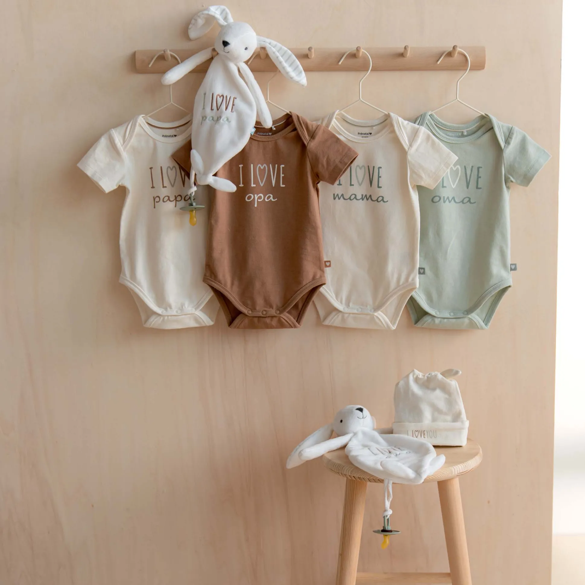 Dit heerlijke zachte knuffeldoekje is het ideale kadootje voor papa. Het extra zachte knuffeldoekje heeft een lief konijnen hoofdje. Aan het uiteinde van het knuffeldoekje zit een lusje waardoor eenvoudig de speen van je kleintje bevestigd kan worden. Op het knuffeldoekje staat de tekst I LOVE Papa. Kleur: ivoor wit met gekleurde geborduurde letters. Ook verkrijgbaar in I LOVE Mama.