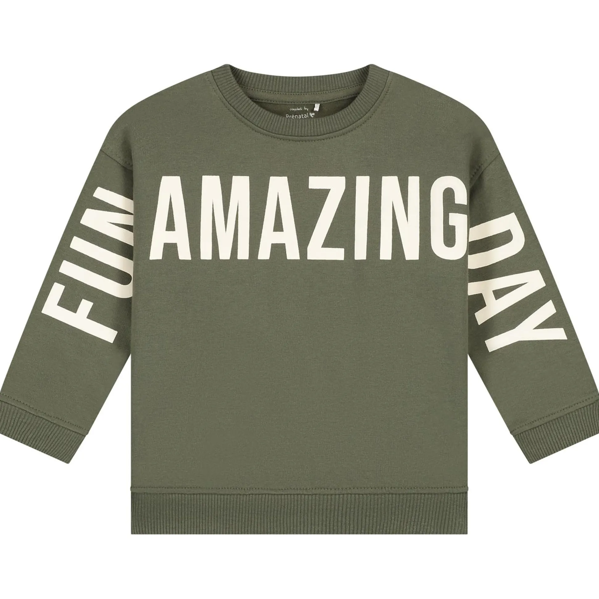 Deze Prénatal sweater is gemaakt van een fijne katoenen kwaliteit. De sweater heeft een ronde hals met een knoopsluiting tot en met maat 98, hierdoor is deze gemakkelijk aan en uit te trekken bij je kindje. Het artikel bestaat uit twee sweaters in de kleuren groen en blauw. De blauwe sweater heeft een kleine borst print en de groene sweater is voorzien van een stoere tekst: fun amazing day. De sweaters zijn goed te combineren met de rest van de Prénatal collecties. Dit artikel is een web-only artikel en is alleen verkrijgbaar via de webshop. Verkrijgbaar in de maten 74 t/m 122. Kwaliteit: 80% biologisch katoen en 20% polyester. Binnenstebuiten wassen op 40 graden met gelijke kleuren. Dit product is getest op schadelijke chemicaliën en gecertificeerd volgens standaard 100 door OEKO-TEX® 23.HIN.84890 HOHENSTEIN HTTI.