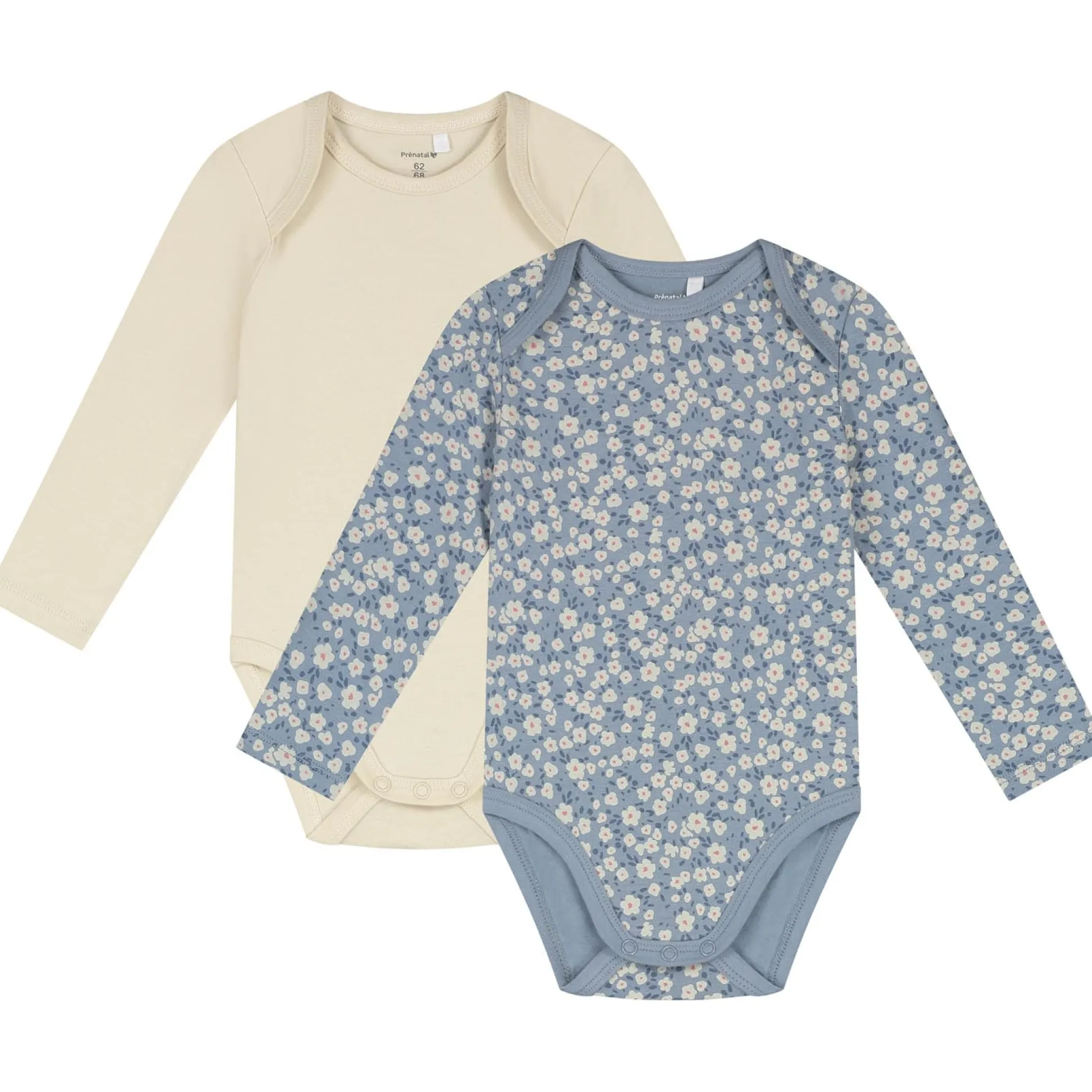 Deze Prénatal 2-pack rompers zijn gemaakt van zacht biologisch katoen en hebben lange mouwen. De set bestaat uit een romper in uni ecru en een romper met een blauwe ondergrond en allover bloemenprint. Door de envelophals en de drukknopen onderaan is het rompertje gemakkelijk aan en uit te trekken bij je kleintje. De romper is goed te combineren met de rest van de Prénatal collectie en is verkrijgbaar in de combinatiematen 50/56 t/m 86/92. Kwaliteit: 95% biologisch katoen en 5% elastaan. Binnenstebuiten wassen op maximaal 40 graden met gelijke kleuren.