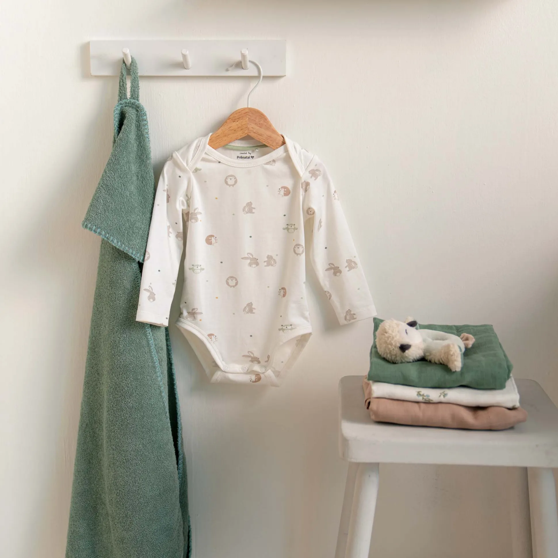 Deze Prénatal romper is gemaakt van biologisch katoen. De romper heeft en gebroken witte ondergrond met een speelse dieren print met lange mouwen. Door de de envelophals en de drukknopen aan de onderzijde is het rompertje gemakkelijk aan en uit te trekken bij je kleintje. De romper is goed te combineren met de rest van de Prénatal collectie en is verkrijgbaar in de combinatiematen 50/56 t/m 86/92. Materiaal: 95% biologisch katoen en 5% elastaan. Binnenstebuiten wassen op maximaal 40 graden met gelijke kleuren.