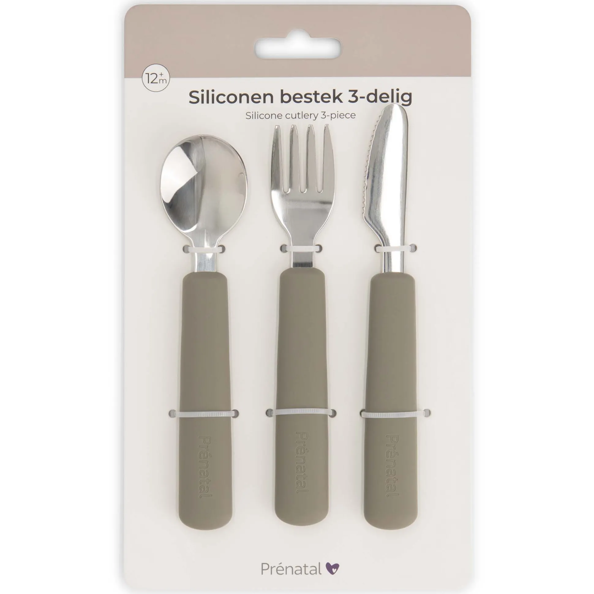 De 3-delige bestekset uit de nieuwe Prénatal siliconen collectie bestaat uit een vork, lepel en mesje. Alle handvaten zijn gemaakt van foodgrade siliconen en 100% BPA-vrij. Ideaal voor iets oudere kindjes die zelfstandig willen eten. Beschikbaar in verschillende kleuren, hitte- en vaatwasserbestendig. Geschikt vanaf 1 jaar.