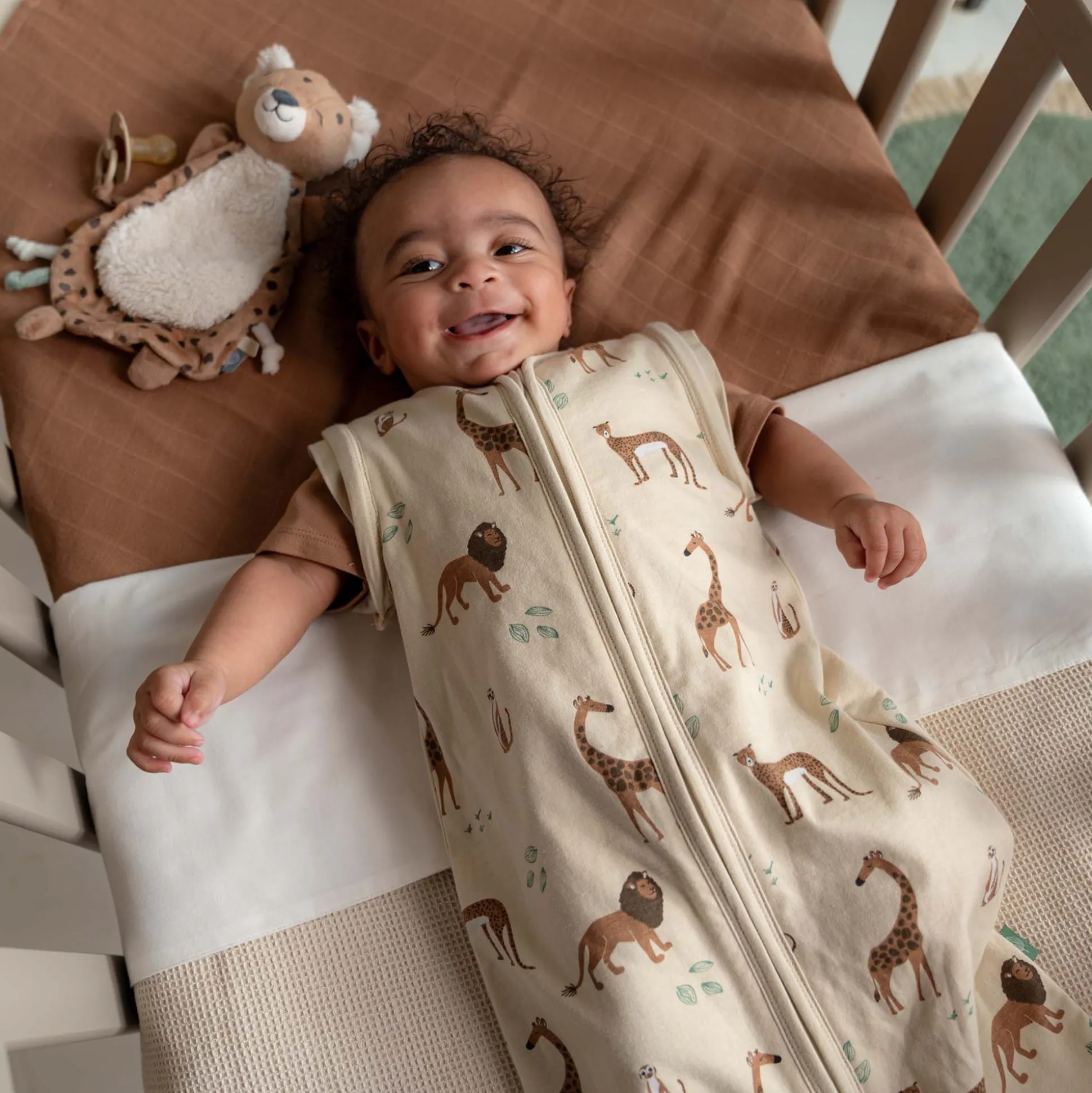 slaapzak is wit van kleur en heeft een allover print met dieren van de Savanne. De slaapzak is goed te combineren met de rest van de Prénatal collectie en is verkrijgbaar in de maten 56/62 t/m 98/104/110. Binnenstebuiten wassen op 40 graden met gelijke kleuren. Extra leuk; het Savanne thema is Prénatal breed met meerdere soorten aritkelen in verschillende productgroepen! Kwaliteit: 100% biologisch katoen. Wij adviseren om de slaapzak niet te drogen in de droger. De TOG-waarde van de slaapzak is 0,5 zonder mouwen, met mouwen is dit nog eens 33% hoger, perfect te gebruiken voor de lente t/m herfst!