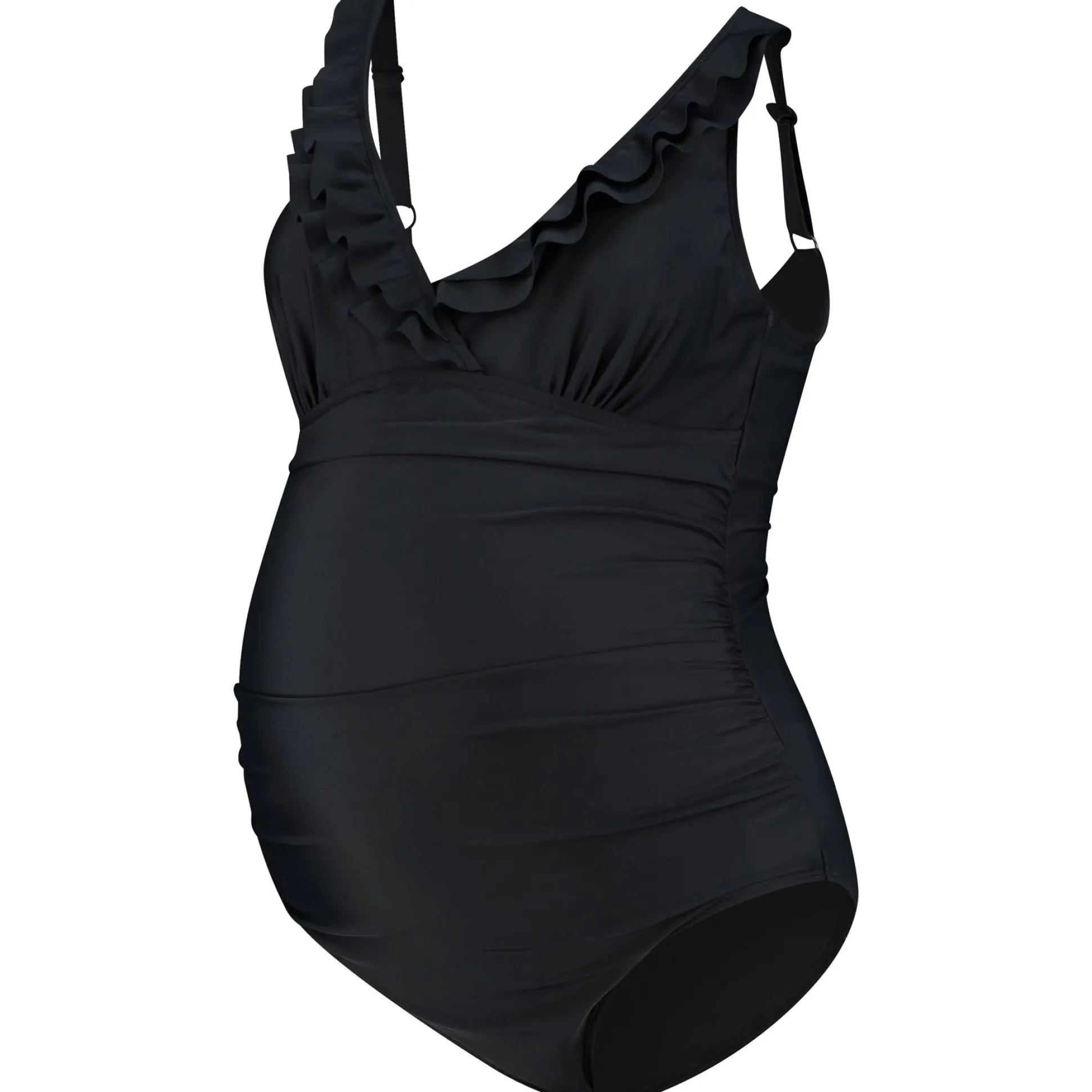 Prénatal zwangerschapsbadpak. Het positie zwempak heeft een comfortabele pasvorm en heeft voldoende ruimte voor de groeiende buik. Het zwempak heeft een V-hals welke is afgewerkt met een mooie ruffle, daarnaast heeft het badpak verstelbare bandjes. Verkrijgbaar in de maten S t/m XXL. Samenstelling: 82% polyamide en 18% elastaan. Wasvoorschrift: handwas.