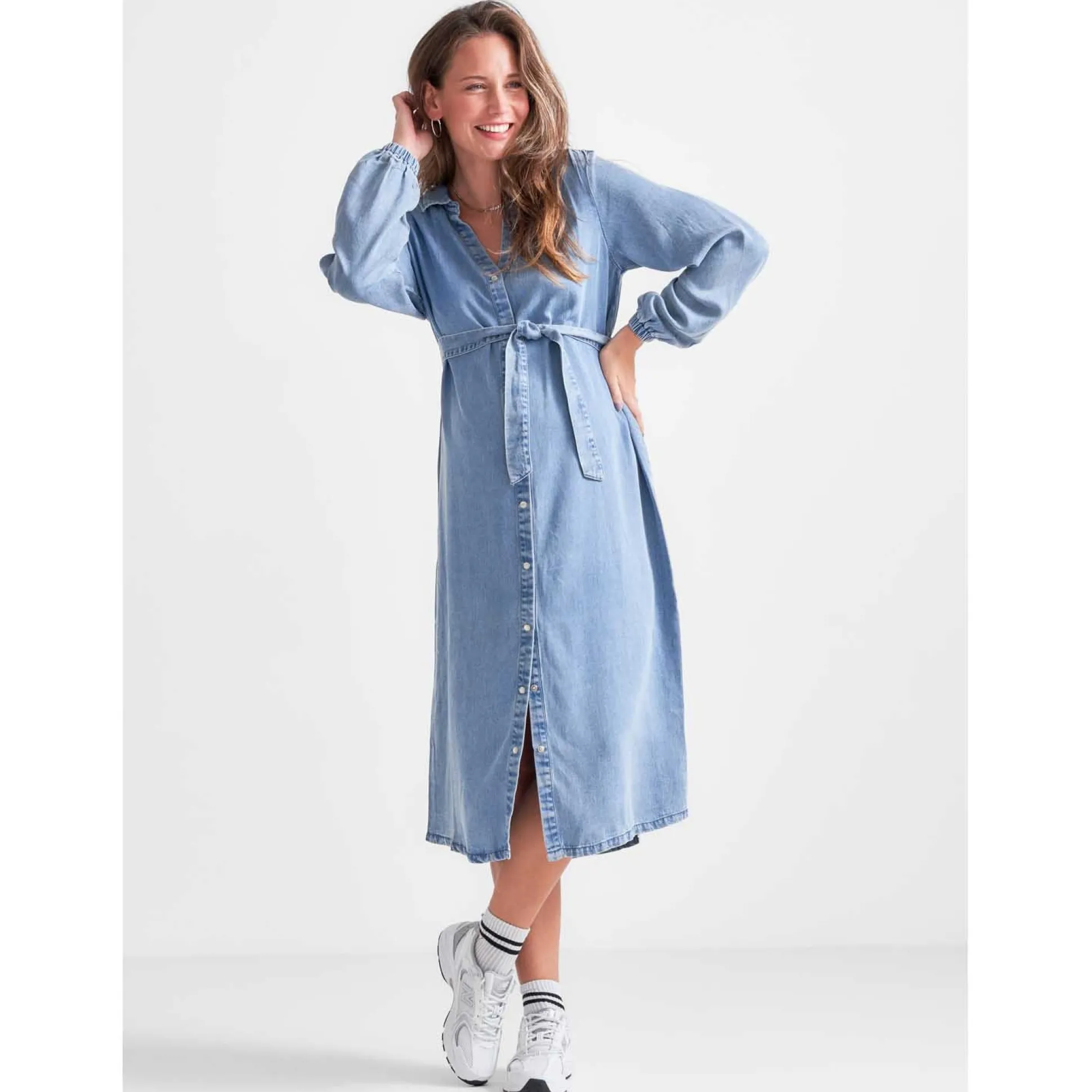 Prénatal zwangerschapsjurk. Deze denimlook jurk heeft een lichte wassing en is grotendeels van soepelvallend lyocell gemaakt. De jurk heeft een doorlopende knoopsluiting wat voeden van je kleintje makkelijker maakt. De taille is afgewerkt met een strikceintuur om je zwangere buik mooi te accentueren. Combineer de jurk met blote benen of een panty uit de collectie van Prénatal. Verkrijgbaar in de maten XS t/m XXL. Samenstelling: 70% lyocell en 30% katoen. Wassen op 30 graden met gelijke kleuren.
