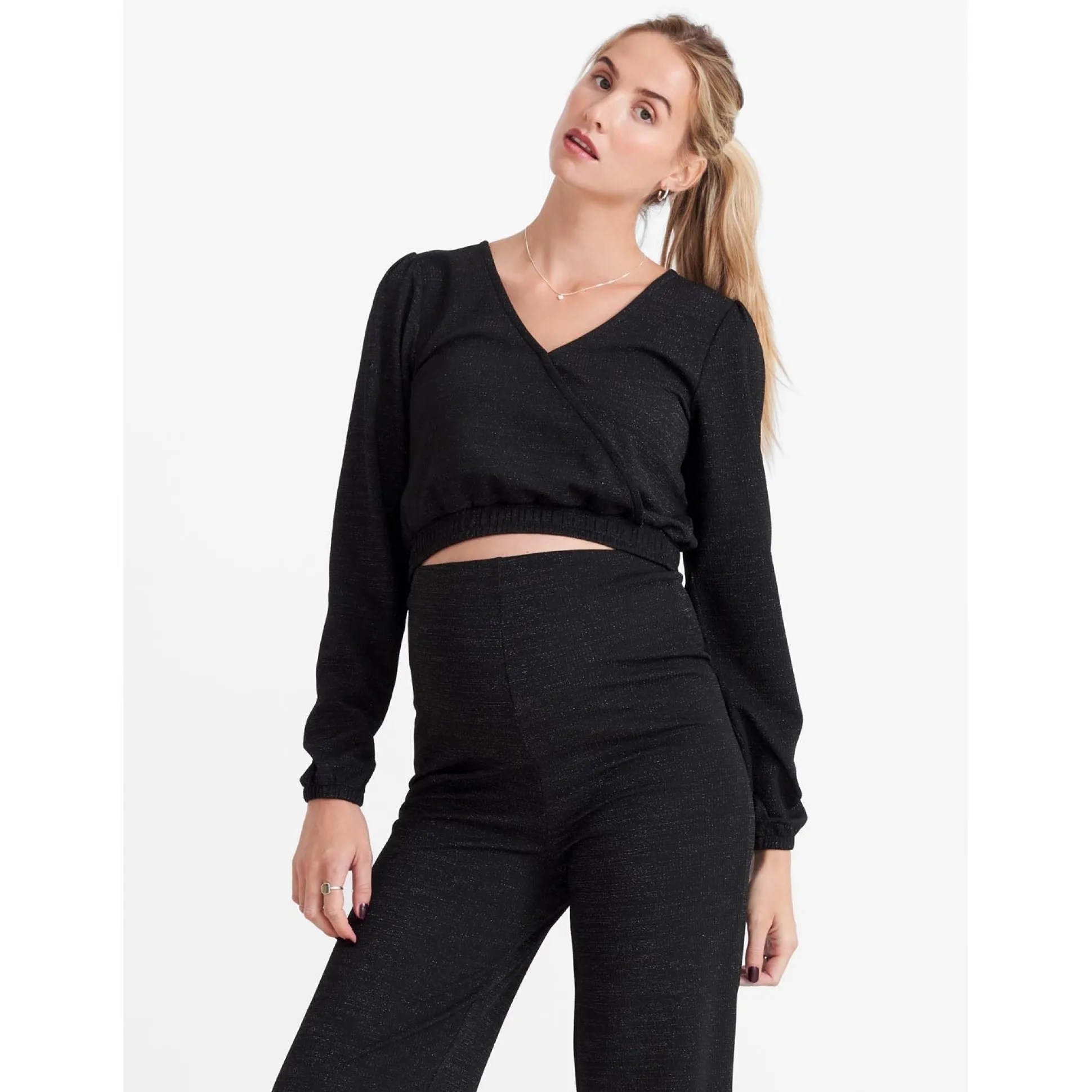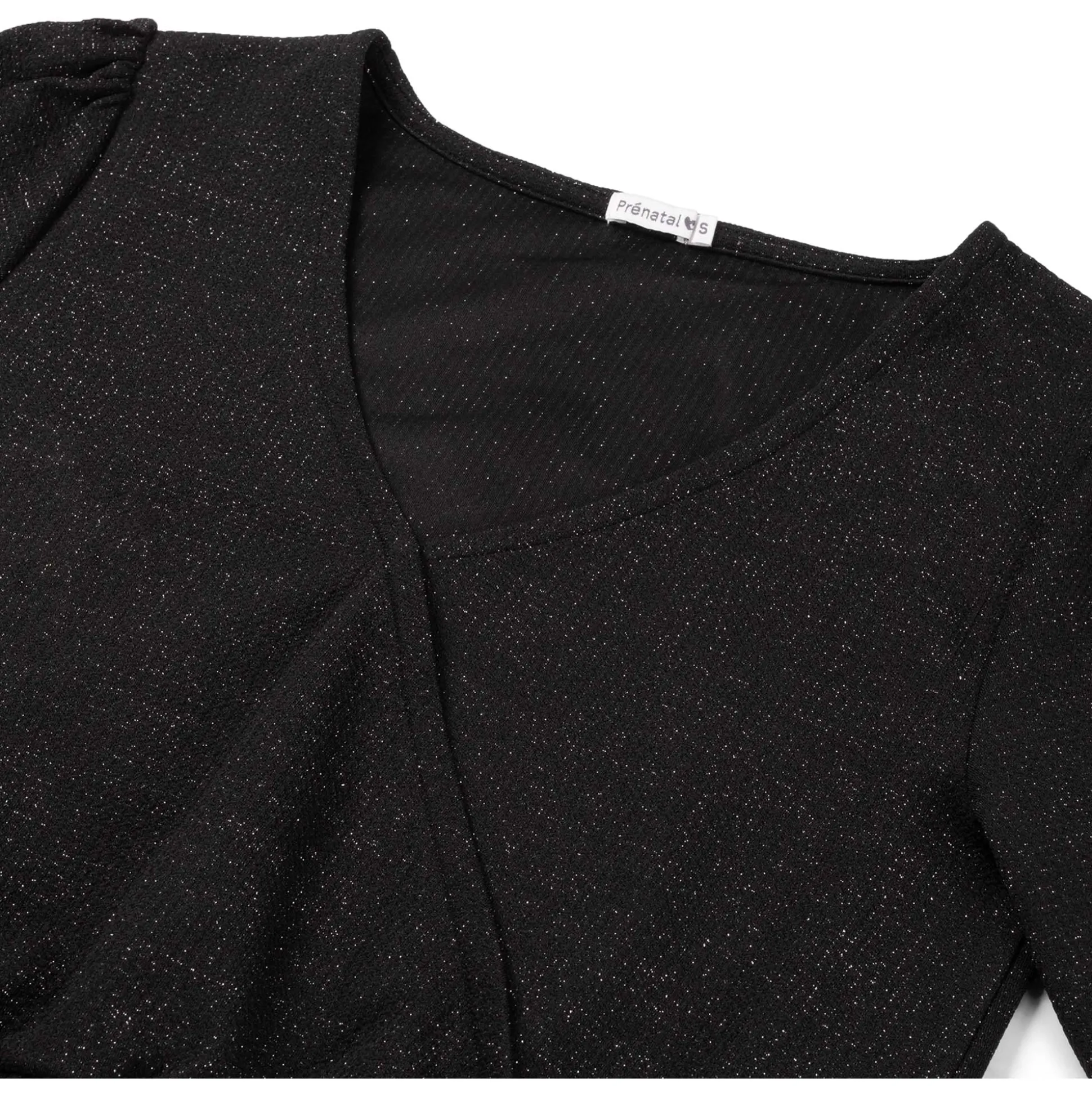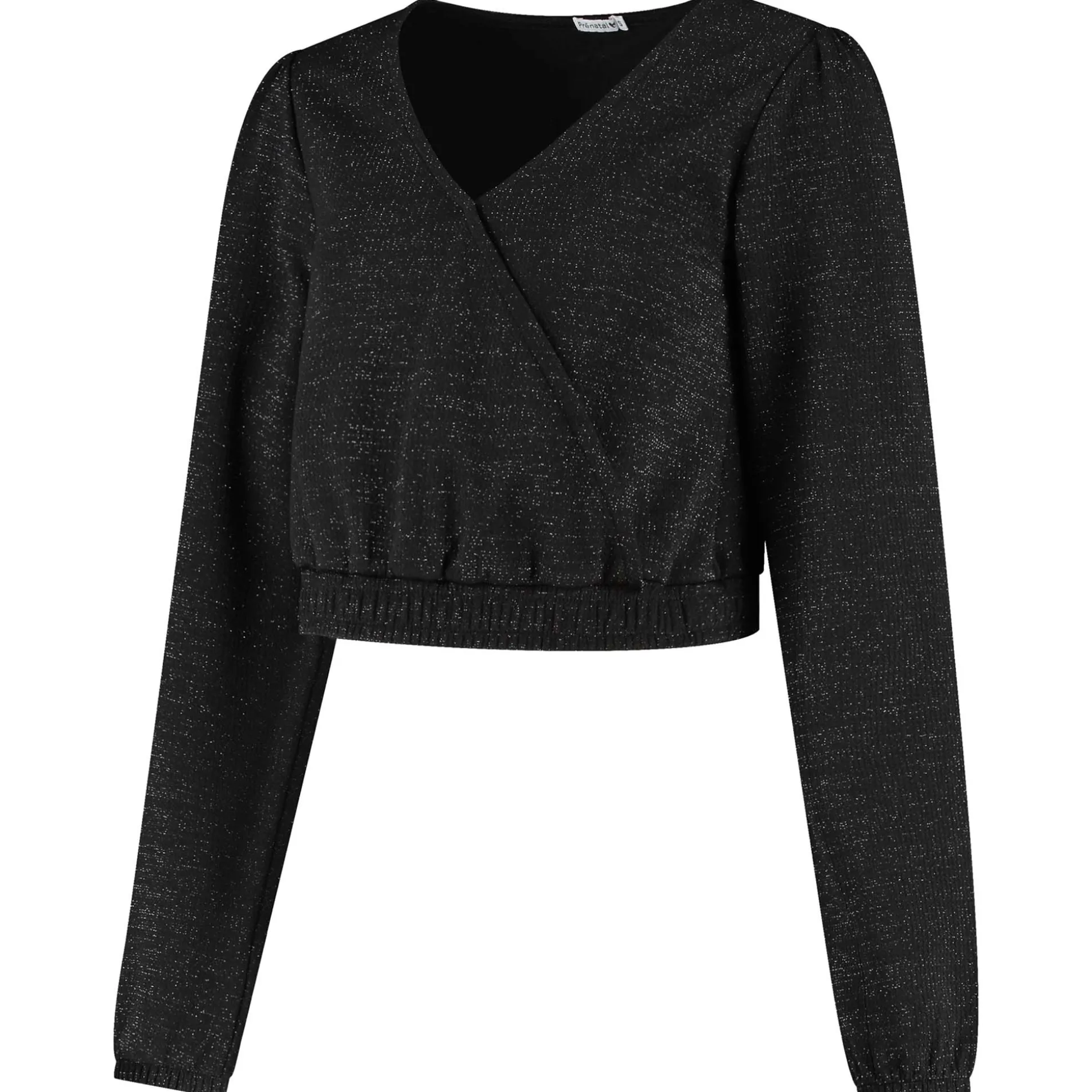 Prénatal zwangerschapstop. Deze top is gemaakt van een polyestermix met stretch en heeft feestelijke glitters in de stof. Deze crop top heeft een V-hals met overslag en ballonmouwen. De onderzijde van de top en de mouwen zijn van een elastische band voorzien. Combineer de top met de bijpassende zwangerschapsbroek of een rok van Prénatal. Verkrijgbaar in de maten XS t/m XXL. Samenstelling: 91% polyester, 5% lurex en 4% elastaan. Wassen op 30 graden met gelijke kleuren. Dit product is getest op schadelijke chemicaliën en gecertificeerd volgens standaard 100 door OEKO-TEX® BJ020 169567 TESTEX.
