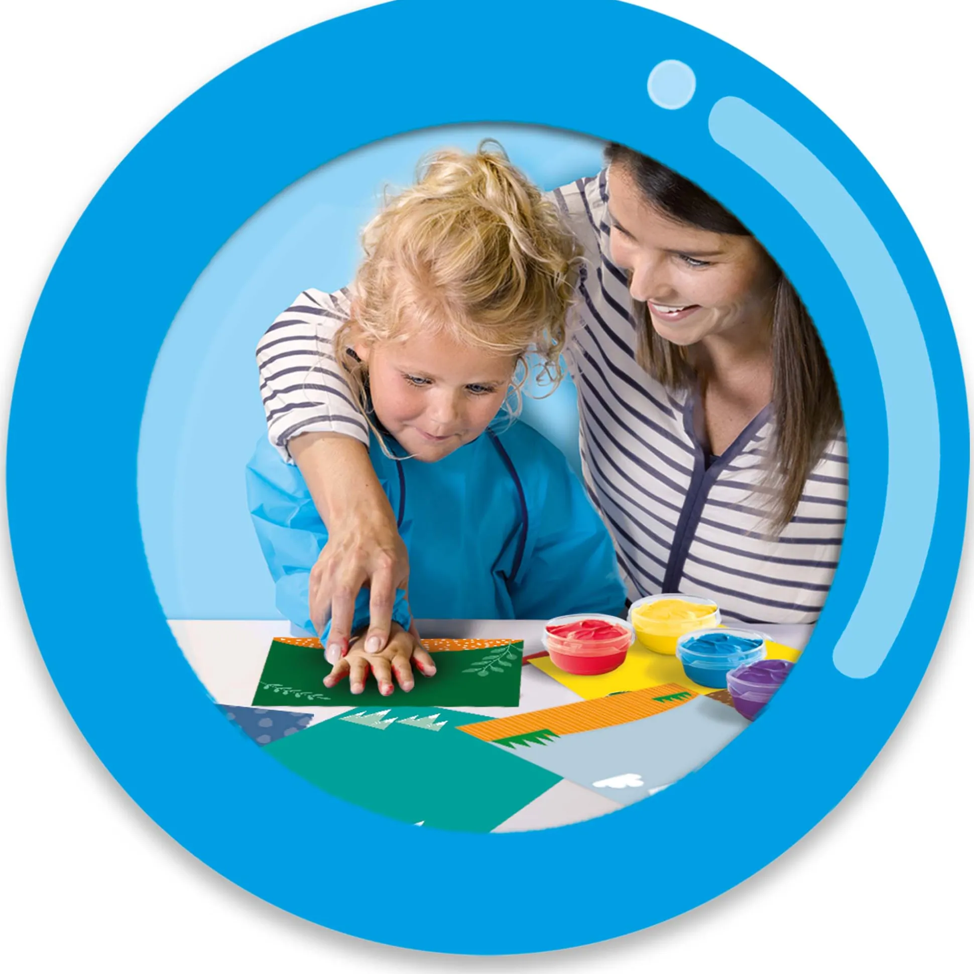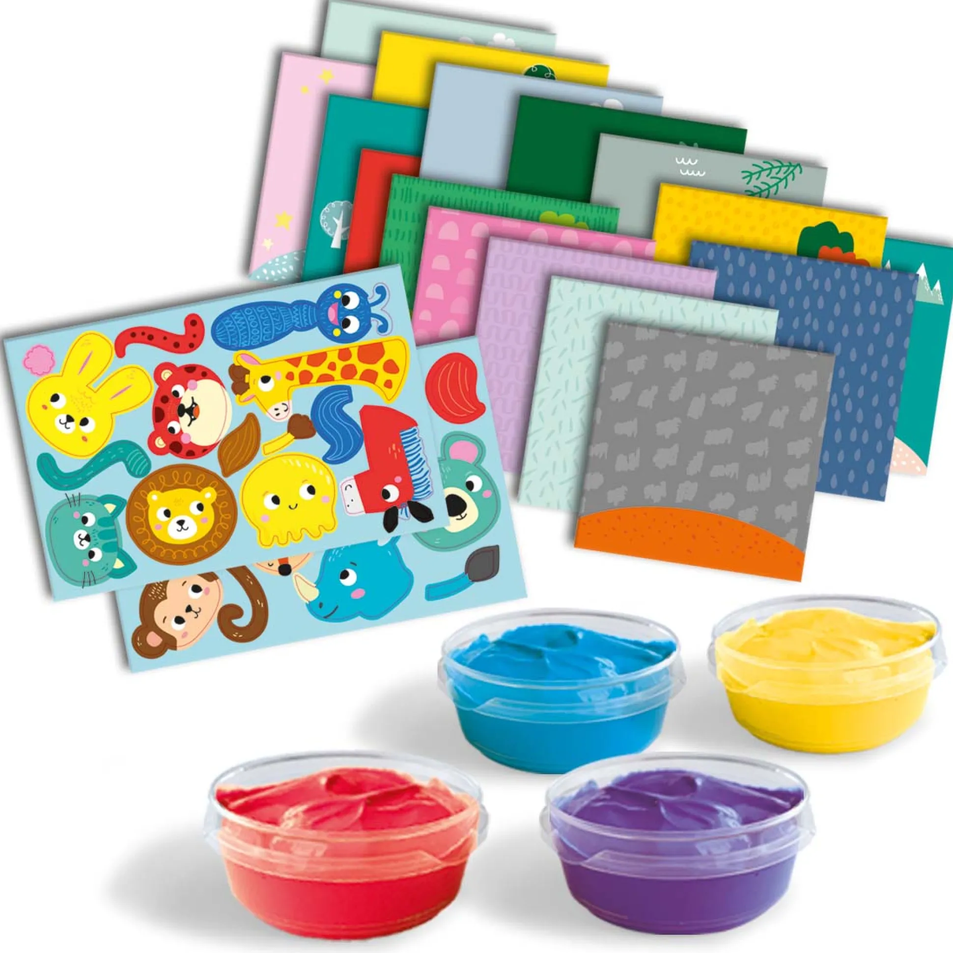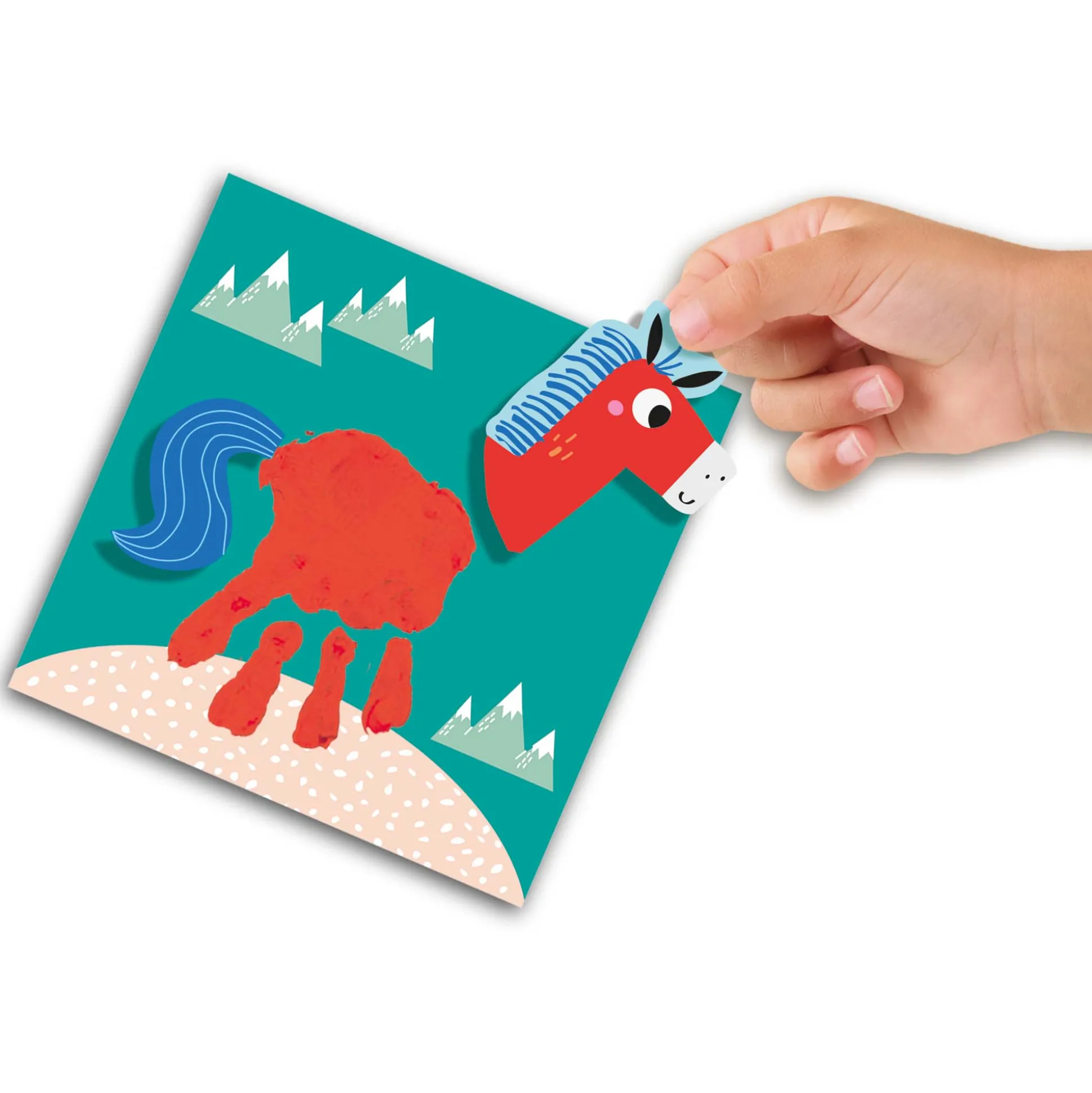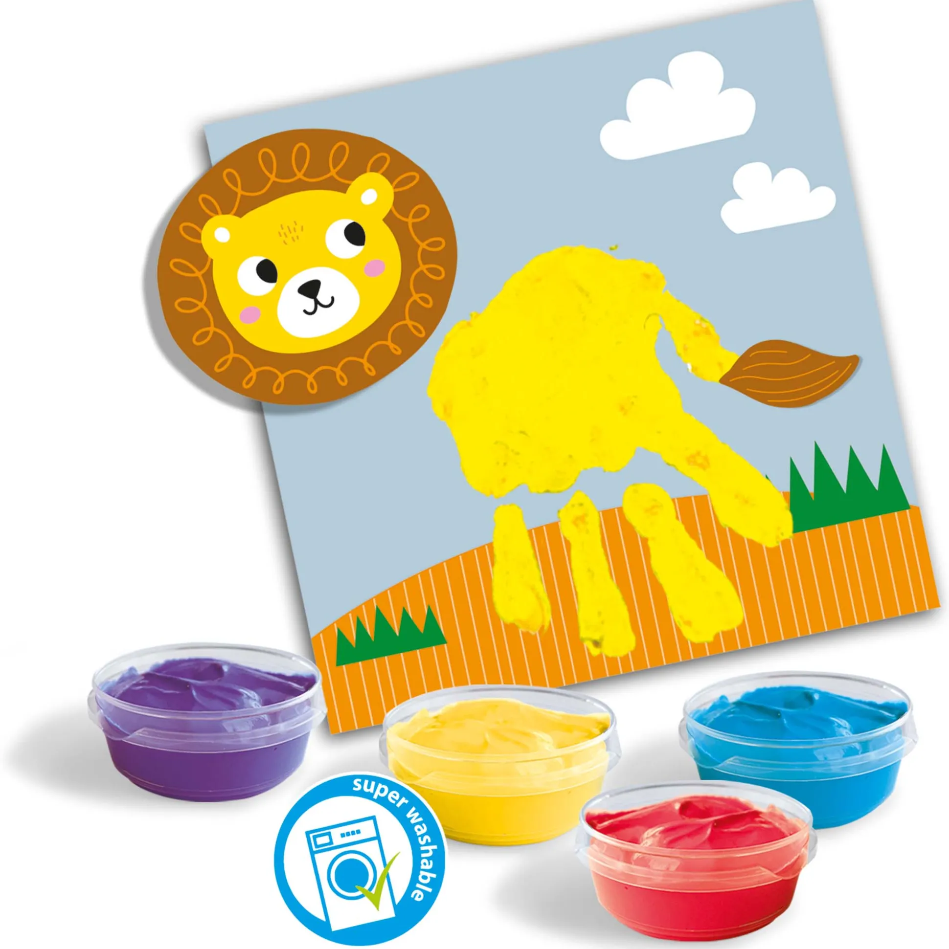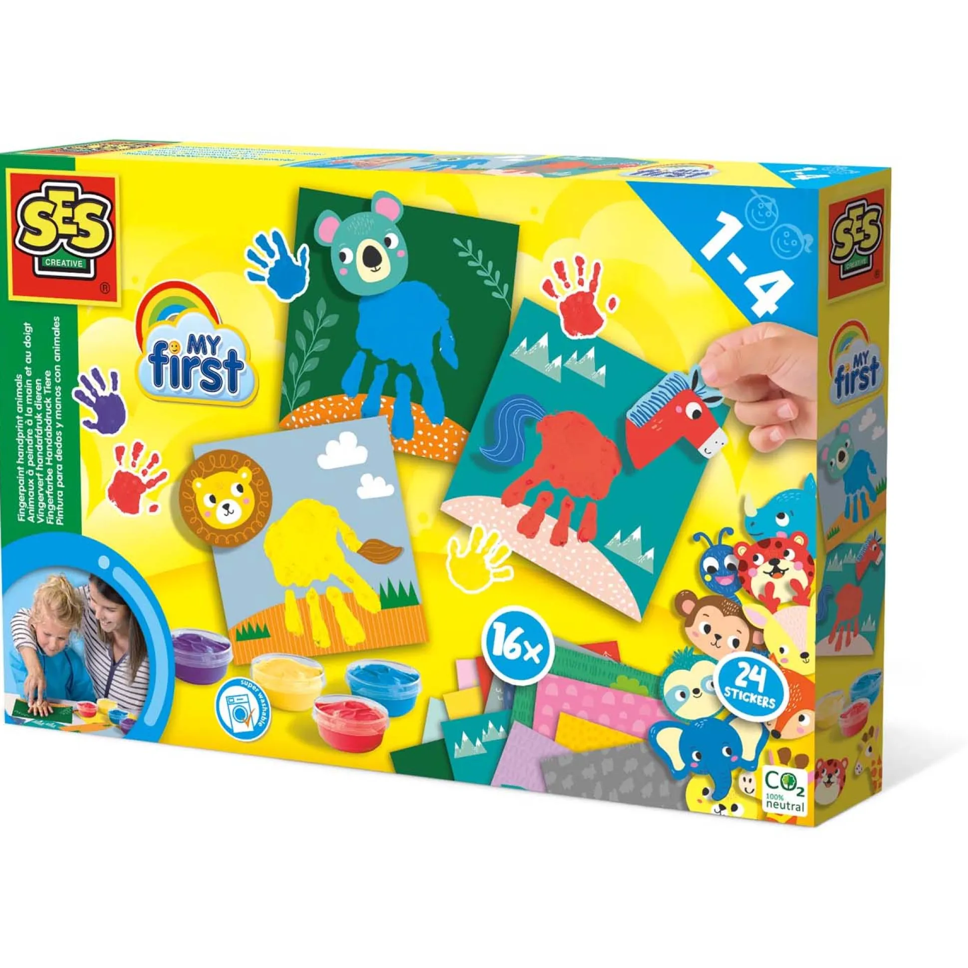 Wat hebben deze dieren gemeen? Inderdaad, je eigen handafdruk. Met je eigen hand kun je de dieren een lijf en poten geven! Dip je hand in de verf en plaats deze op een van de 16 kaarten. Met de bijgeleverde stickers breng jij alle diertjes tot leven. De set bevat 4 potjes vingerverf van 50ml, 16 vingerverf kaarten en een stickervel. De vingerverf is veilig, goed uitwasbaar, hypoallergeen, glutenvrij, smeerbaar en mengbaar. Geschikt voor kinderen vanaf 12 maanden.
