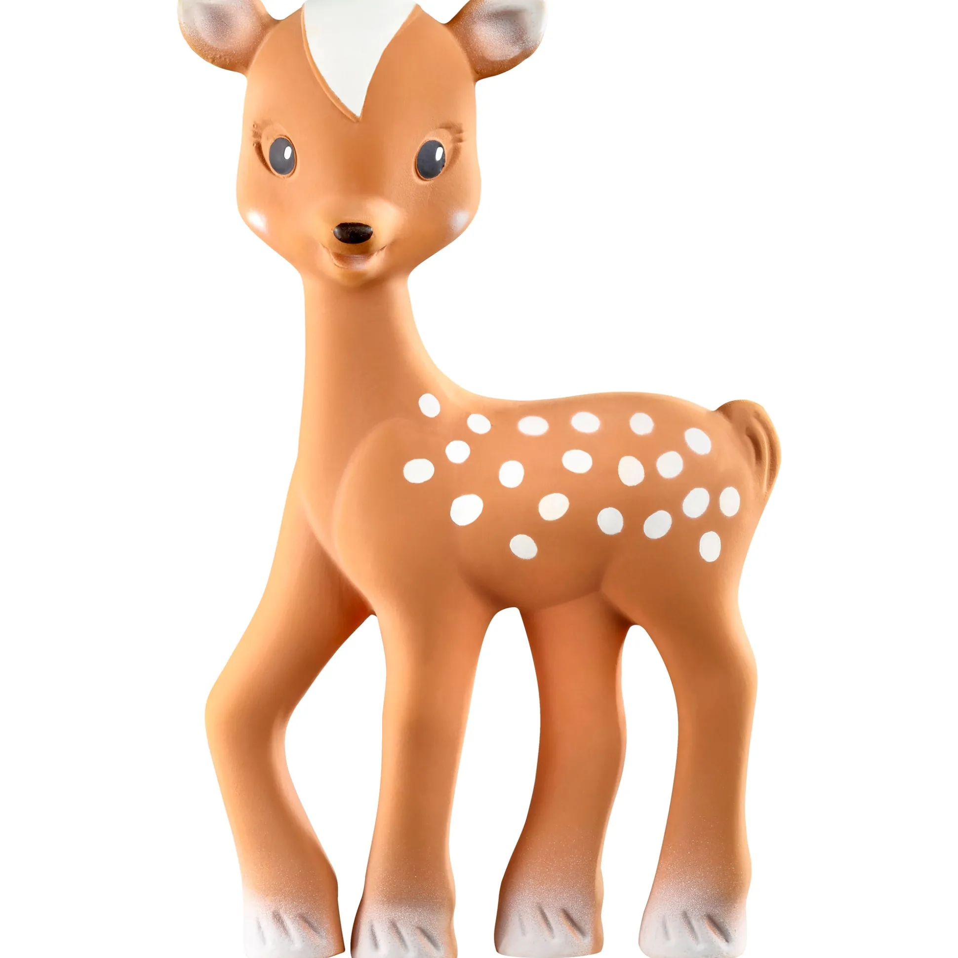 Het bijtspeeltje van Sophie de giraf is een veilig en duurzaam speeltje. Het hertje Fanfan is gemaakt van 100% natuurlijk rubber afkomstig van de Hevea boom en bewerkt met verf die gebruikt wordt in de voedingsmiddelenindustrie. Hierdoor is FanFan absoluut vrij van schadelijke stoffen zoals PVC, Phthalaten, BPA en andere weekmakers. FanFan kan door kindjes met hun kleine handjes makkelijk worden vastgepakt. Haar donkere kleur en lichte vlekjes wekken door het contrast de aandacht van de baby en zorgen ervoor dat de baby haar herkent. Doordat FanFan is gemaakt van natuurrubber heeft ze een bijzondere geur waardoor de baby haar ook makkelijk herkent tussen alle speeltjes. Het subtiele piepje stimuleert het gehoor en zorgt ervoor dat de baby kennis maakt met oorzaak-gevolg. En wanneer baby tandjes krijgt, bieden de oortjes en lange poten verlichting door erop te sabbelen en te bijten. Vanaf 0+ maanden.
