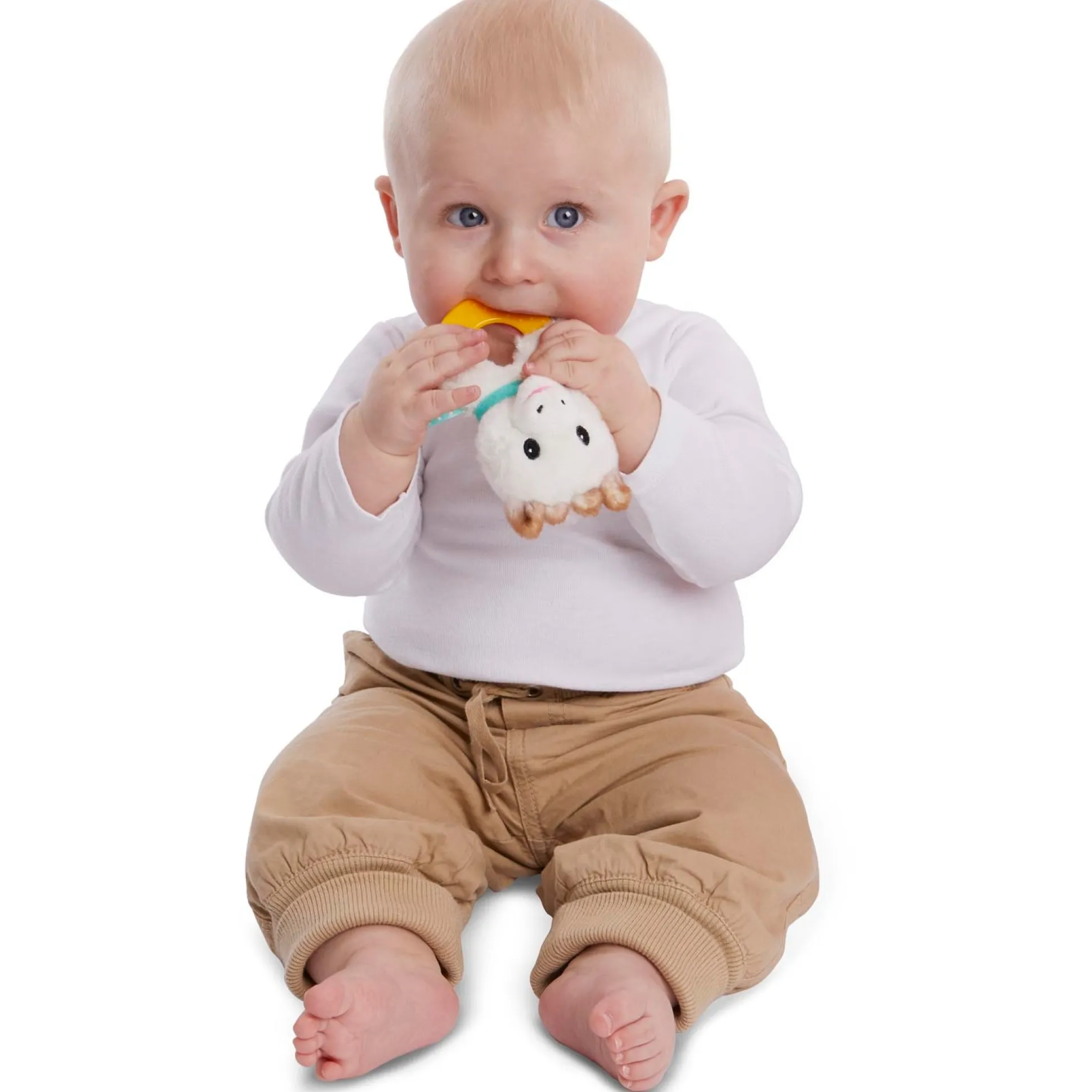 Deze zachte bijtrammelaar is perfect om de zintuigen van baby te stimuleren! Schudt met de rammelaar en de baby hoort de balletjes tegen elkaar tikken. Bijtring: perfect om het pijnlijke tandvlees van je baby te verlichten. De bijtrammelaar is gemakkelijk vast te pakken door kleine handjes en heeft drie gekleurde labelks om aan te raken.