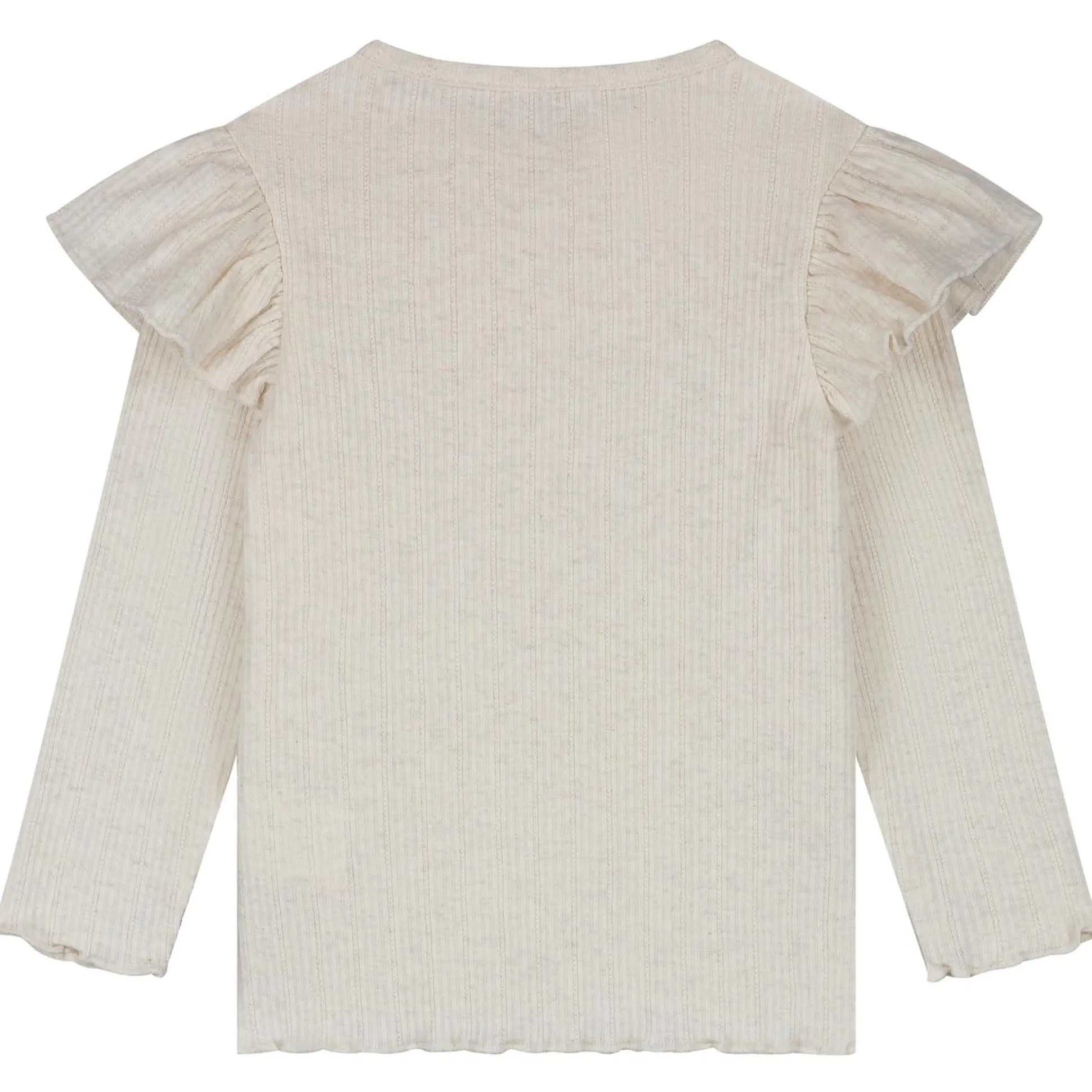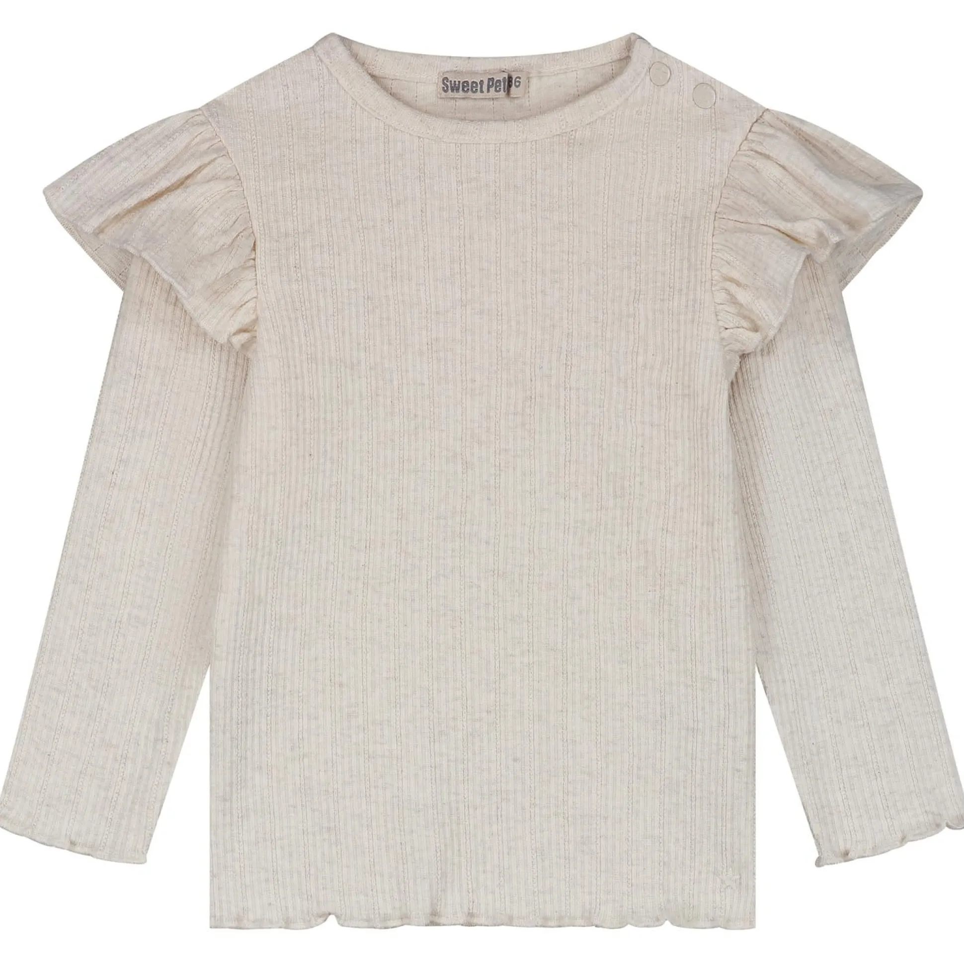 Dit Sweet Petit peuter shirt is gemaakt van een fijne rib ajour kwaliteit. Het shirt heeft lange mouwen met een ruffle over beide shouders en een ronde hals met knoopsluiting op de achterzijde tot en met maat 98. Het shirt is goed te combineren met de rest van de Sweet Petit collectie bij Prénatal. Verkrijgbaar in de maten 56 t/m 122. Kwaliteit: 95% biologisch katoen, 5% elastaan. Binnenstebuiten wassen op 40 graden met gelijke kleuren. Dit product is getest op schadelijke chemicaliën en gecertificeerd volgens standaard 100 door OEKO-TEX® BJ020 169567 TESTEX.