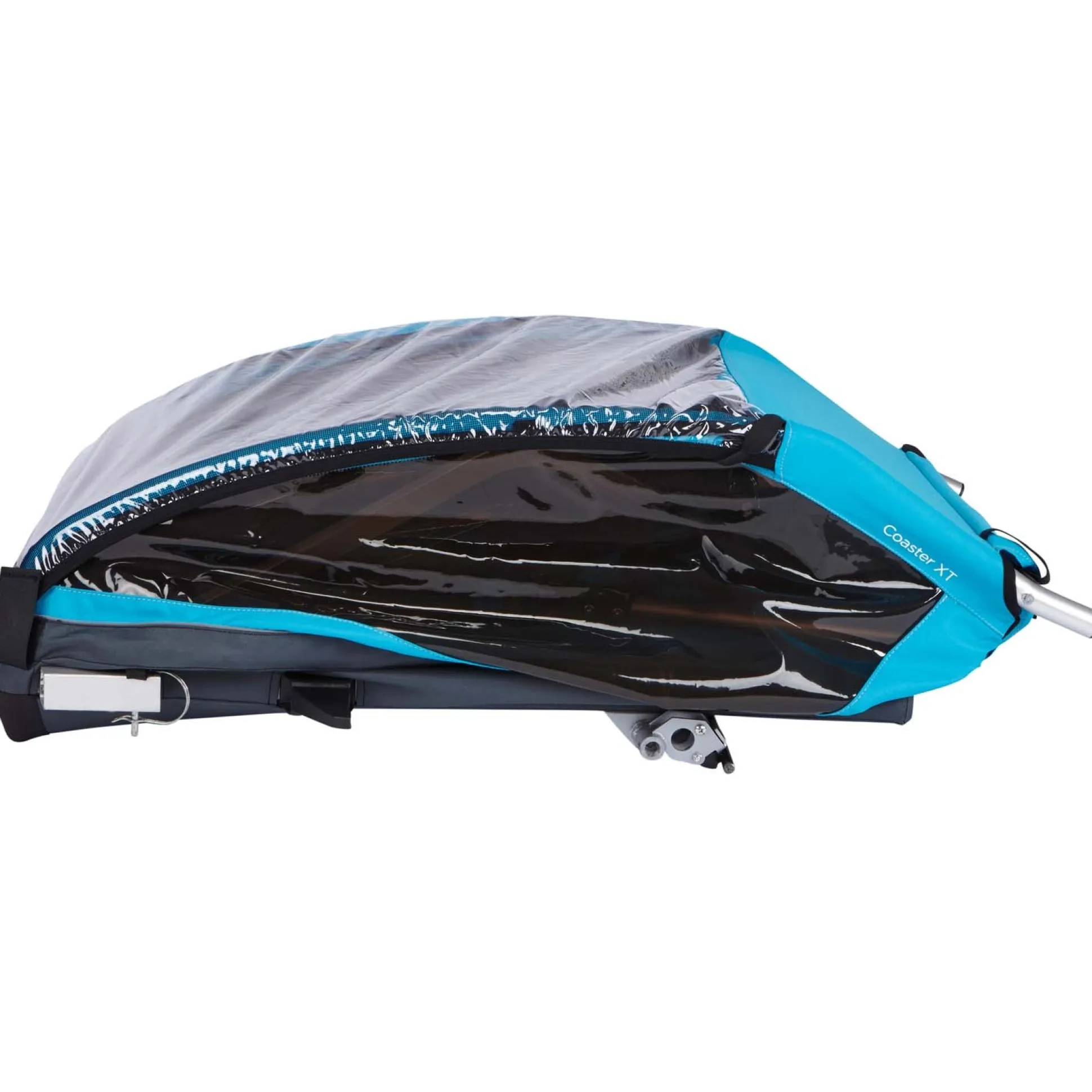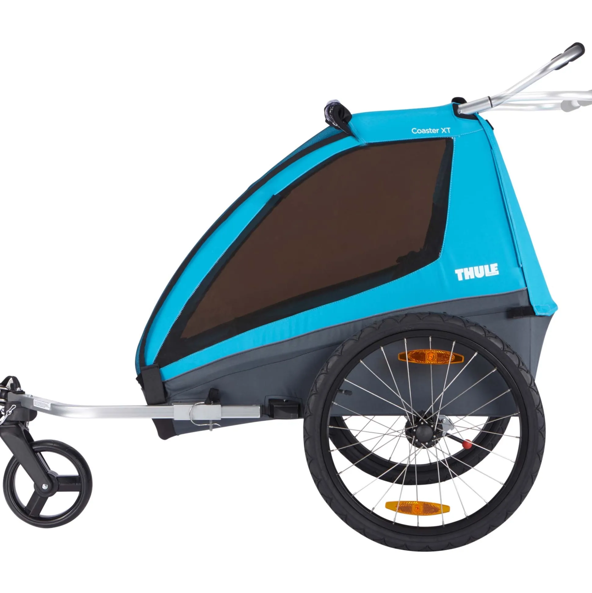 De Thule Coaster XT is een fietskar die heel makkelijk is om te bouwen naar wandelwagen. Ideaal, zo kun je met de fiets ergens naar rijden en op de plek van bestemming aangekomen kan je kindje lekker blijven zitten. De fietskar biedt ruimte aan twee kindjes (max draaggewicht 45 kg), maar kan ook voor een kindje gebruikt worden. De kar heeft twee 5-punts gordels en heeft een handige opbergruimte aan de achterzijde. De fietstrailer heeft een doorrijbreedte van 80 cm en biedt daardoor veel ruimte aan je kindjes. De fietskar heeft een verstelbare duwbeugel waardoor je er comfortabel achter kunt lopen. De Thule Coaster XT is opvouwbaar en daardoor makkelijk te vervoeren of op te bergen. De fietskar wordt geleverd met een ezHitch askoppeling waarmee de kar gemakkelijk losgekoppeld kan worden en een oranje veiligheidsvlag. De askoppeling is ook los te koop voor een tweede fiets.