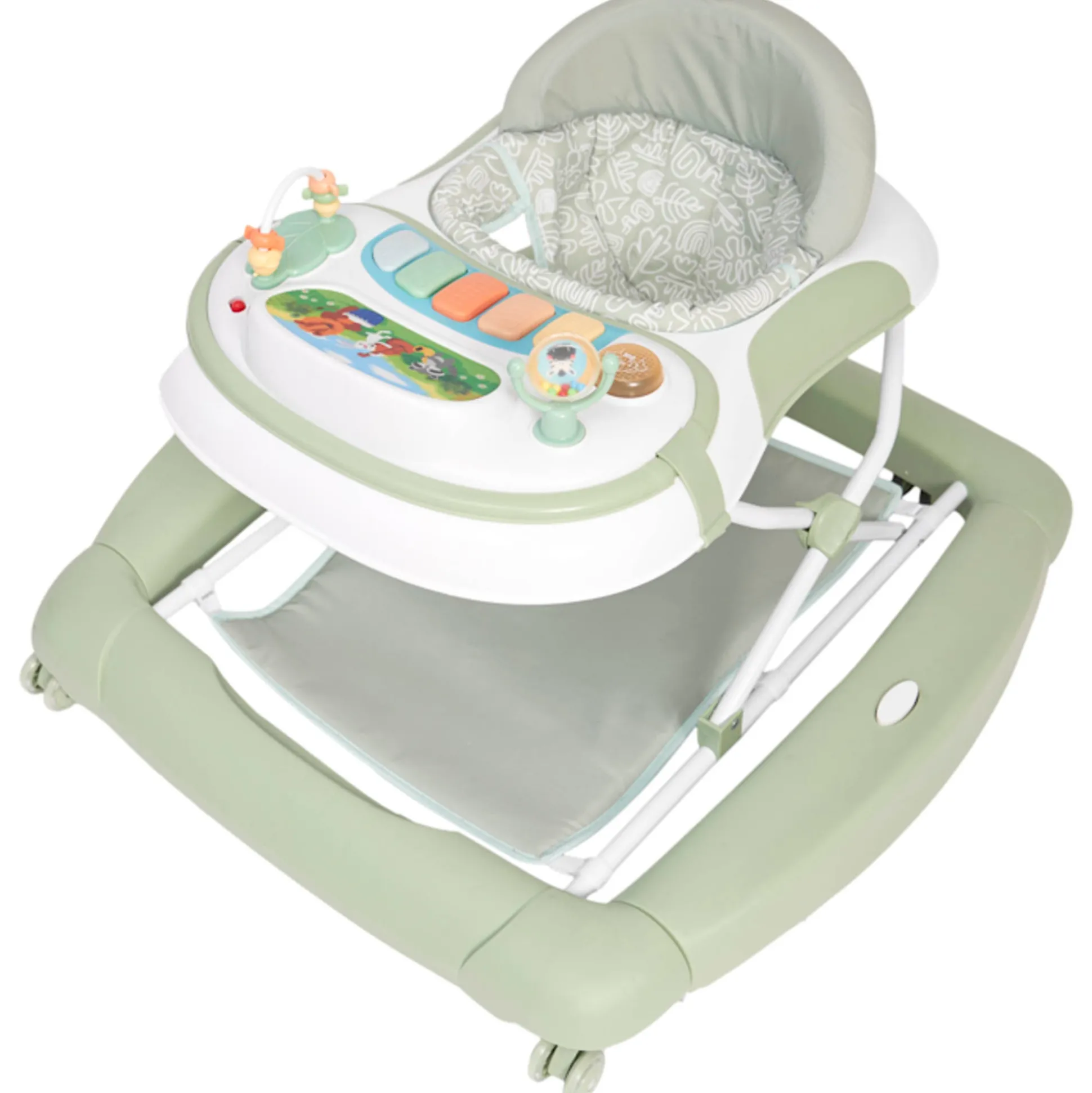 Topmark loopstoel Max 2-in-1 is een loopstoel en een schommelstoel in één. Je kindje kan de eerste stapjes onder de knie krijgen met deze loopstoel. De loopstoel is in een handomdraai om te bouwen tot een leuk schommeltje met daaronder een dekje voor de voetjes. Het elektronische speelblad is afneembaar voor nog meer plezier! Het loopstoeltje heeft 2 zwenkwielen voor en achter 2 vaste wielen. Het zitje is te verstellen in 3 posities en is comfortabel en stevig door de hoge rug in de zitting. De bekleding is afneembaar en wasbaar op de hand (gelieve niet in de wasmachine). De loopstoel wordt geleverd met trapstoppers en een dekje voor de voetjes welke gebruikt kan worden bij de schommelfunctie. Exclusief dessin in mooie groene print voor Prénatal.